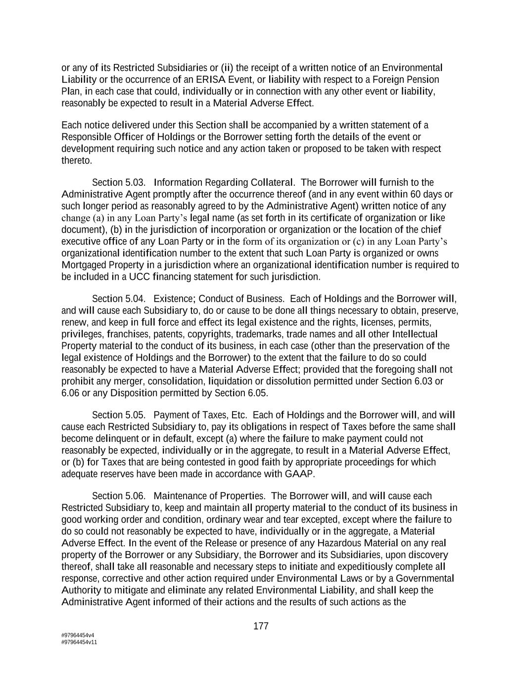 177 #97964454v4 #97964454v11 or any of its Restricted Subsidiaries or (ii) the receipt of a written notice of an Environmental Liability or the occurrence of an ERISA Event, or liability with respect to a Foreign Pension Plan, in each case that could, individually or in connection with any other event or liability, reasonably be expected to result in a Material Adverse Effect. Each notice delivered under this Section shall be accompanied by a written statement of a Responsible Officer of Holdings or the Borrower setting forth the details of the event or development requiring such notice and any action taken or proposed to be taken with respect thereto. Section 5.03. Information Regarding Collateral. The Borrower will furnish to the Administrative Agent promptly after the occurrence thereof (and in any event within 60 days or such longer period as reasonably agreed to by the Administrative Agent) written notice of any change (a) in any Loan Party’s legal name (as set forth in its certificate of organization or like document), (b) in the jurisdiction of incorporation or organization or the location of the chief executive office of any Loan Party or in the form of its organization or (c) in any Loan Party’s organizational identification number to the extent that such Loan Party is organized or owns Mortgaged Property in a jurisdiction where an organizational identification number is required to be included in a UCC financing statement for such jurisdiction. Section 5.04. Existence; Conduct of Business. Each of Holdings and the Borrower will, and will cause each Subsidiary to, do or cause to be done all things necessary to obtain, preserve, renew, and keep in full force and effect its legal existence and the rights, licenses, permits, privileges, franchises, patents, copyrights, trademarks, trade names and all other Intellectual Property material to the conduct of its business, in each case (other than the preservation of the legal existence of Holdings and the Borrower) to the extent that the failure to do so could reasonably be expected to have a Material Adverse Effect; provided that the foregoing shall not prohibit any merger, consolidation, liquidation or dissolution permitted under Section 6.03 or 6.06 or any Disposition permitted by Section 6.05. Section 5.05. Payment of Taxes, Etc. Each of Holdings and the Borrower will, and will cause each Restricted Subsidiary to, pay its obligations in respect of Taxes before the same shall become delinquent or in default, except (a) where the failure to make payment could not reasonably be expected, individually or in the aggregate, to result in a Material Adverse Effect, or (b) for Taxes that are being contested in good faith by appropriate proceedings for which adequate reserves have been made in accordance with GAAP. Section 5.06. Maintenance of Properties. The Borrower will, and will cause each Restricted Subsidiary to, keep and maintain all property material to the conduct of its business in good working order and condition, ordinary wear and tear excepted, except where the failure to do so could not reasonably be expected to have, individually or in the aggregate, a Material Adverse Effect. In the event of the Release or presence of any Hazardous Material on any real property of the Borrower or any Subsidiary, the Borrower and its Subsidiaries, upon discovery thereof, shall take all reasonable and necessary steps to initiate and expeditiously complete all response, corrective and other action required under Environmental Laws or by a Governmental Authority to mitigate and eliminate any related Environmental Liability, and shall keep the Administrative Agent informed of their actions and the results of such actions as the