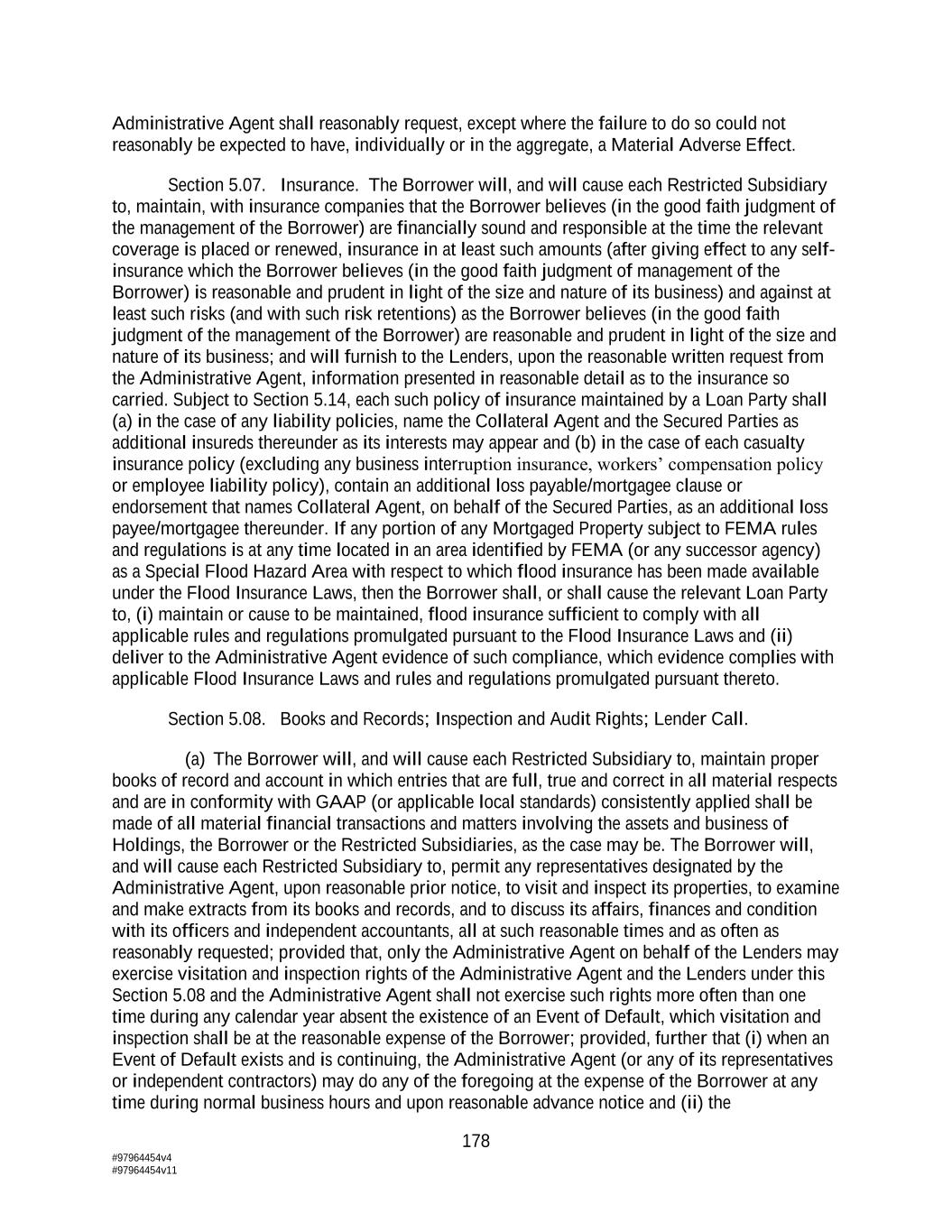 178 #97964454v4 #97964454v11 Administrative Agent shall reasonably request, except where the failure to do so could not reasonably be expected to have, individually or in the aggregate, a Material Adverse Effect. Section 5.07. Insurance. The Borrower will, and will cause each Restricted Subsidiary to, maintain, with insurance companies that the Borrower believes (in the good faith judgment of the management of the Borrower) are financially sound and responsible at the time the relevant coverage is placed or renewed, insurance in at least such amounts (after giving effect to any self- insurance which the Borrower believes (in the good faith judgment of management of the Borrower) is reasonable and prudent in light of the size and nature of its business) and against at least such risks (and with such risk retentions) as the Borrower believes (in the good faith judgment of the management of the Borrower) are reasonable and prudent in light of the size and nature of its business; and will furnish to the Lenders, upon the reasonable written request from the Administrative Agent, information presented in reasonable detail as to the insurance so carried. Subject to Section 5.14, each such policy of insurance maintained by a Loan Party shall (a) in the case of any liability policies, name the Collateral Agent and the Secured Parties as additional insureds thereunder as its interests may appear and (b) in the case of each casualty insurance policy (excluding any business interruption insurance, workers’ compensation policy or employee liability policy), contain an additional loss payable/mortgagee clause or endorsement that names Collateral Agent, on behalf of the Secured Parties, as an additional loss payee/mortgagee thereunder. If any portion of any Mortgaged Property subject to FEMA rules and regulations is at any time located in an area identified by FEMA (or any successor agency) as a Special Flood Hazard Area with respect to which flood insurance has been made available under the Flood Insurance Laws, then the Borrower shall, or shall cause the relevant Loan Party to, (i) maintain or cause to be maintained, flood insurance sufficient to comply with all applicable rules and regulations promulgated pursuant to the Flood Insurance Laws and (ii) deliver to the Administrative Agent evidence of such compliance, which evidence complies with applicable Flood Insurance Laws and rules and regulations promulgated pursuant thereto. Section 5.08. Books and Records; Inspection and Audit Rights; Lender Call. (a) The Borrower will, and will cause each Restricted Subsidiary to, maintain proper books of record and account in which entries that are full, true and correct in all material respects and are in conformity with GAAP (or applicable local standards) consistently applied shall be made of all material financial transactions and matters involving the assets and business of Holdings, the Borrower or the Restricted Subsidiaries, as the case may be. The Borrower will, and will cause each Restricted Subsidiary to, permit any representatives designated by the Administrative Agent, upon reasonable prior notice, to visit and inspect its properties, to examine and make extracts from its books and records, and to discuss its affairs, finances and condition with its officers and independent accountants, all at such reasonable times and as often as reasonably requested; provided that, only the Administrative Agent on behalf of the Lenders may exercise visitation and inspection rights of the Administrative Agent and the Lenders under this Section 5.08 and the Administrative Agent shall not exercise such rights more often than one time during any calendar year absent the existence of an Event of Default, which visitation and inspection shall be at the reasonable expense of the Borrower; provided, further that (i) when an Event of Default exists and is continuing, the Administrative Agent (or any of its representatives or independent contractors) may do any of the foregoing at the expense of the Borrower at any time during normal business hours and upon reasonable advance notice and (ii) the