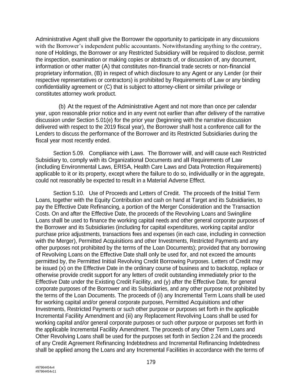 179 #97964454v4 #97964454v11 Administrative Agent shall give the Borrower the opportunity to participate in any discussions with the Borrower’s independent public accountants. Notwithstanding anything to the contrary, none of Holdings, the Borrower or any Restricted Subsidiary will be required to disclose, permit the inspection, examination or making copies or abstracts of, or discussion of, any document, information or other matter (A) that constitutes non-financial trade secrets or non-financial proprietary information, (B) in respect of which disclosure to any Agent or any Lender (or their respective representatives or contractors) is prohibited by Requirements of Law or any binding confidentiality agreement or (C) that is subject to attorney-client or similar privilege or constitutes attorney work product. (b) At the request of the Administrative Agent and not more than once per calendar year, upon reasonable prior notice and in any event not earlier than after delivery of the narrative discussion under Section 5.01(e) for the prior year (beginning with the narrative discussion delivered with respect to the 2019 fiscal year), the Borrower shall host a conference call for the Lenders to discuss the performance of the Borrower and its Restricted Subsidiaries during the fiscal year most recently ended. Section 5.09. Compliance with Laws. The Borrower will, and will cause each Restricted Subsidiary to, comply with its Organizational Documents and all Requirements of Law (including Environmental Laws, ERISA, Health Care Laws and Data Protection Requirements) applicable to it or its property, except where the failure to do so, individually or in the aggregate, could not reasonably be expected to result in a Material Adverse Effect. Section 5.10. Use of Proceeds and Letters of Credit. The proceeds of the Initial Term Loans, together with the Equity Contribution and cash on hand at Target and its Subsidiaries, to pay the Effective Date Refinancing, a portion of the Merger Consideration and the Transaction Costs. On and after the Effective Date, the proceeds of the Revolving Loans and Swingline Loans shall be used to finance the working capital needs and other general corporate purposes of the Borrower and its Subsidiaries (including for capital expenditures, working capital and/or purchase price adjustments, transactions fees and expenses (in each case, including in connection with the Merger), Permitted Acquisitions and other Investments, Restricted Payments and any other purposes not prohibited by the terms of the Loan Documents); provided that any borrowing of Revolving Loans on the Effective Date shall only be used for, and not exceed the amounts permitted by, the Permitted Initial Revolving Credit Borrowing Purposes. Letters of Credit may be issued (x) on the Effective Date in the ordinary course of business and to backstop, replace or otherwise provide credit support for any letters of credit outstanding immediately prior to the Effective Date under the Existing Credit Facility, and (y) after the Effective Date, for general corporate purposes of the Borrower and its Subsidiaries, and any other purpose not prohibited by the terms of the Loan Documents. The proceeds of (i) any Incremental Term Loans shall be used for working capital and/or general corporate purposes, Permitted Acquisitions and other Investments, Restricted Payments or such other purpose or purposes set forth in the applicable Incremental Facility Amendment and (ii) any Replacement Revolving Loans shall be used for working capital and/or general corporate purposes or such other purpose or purposes set forth in the applicable Incremental Facility Amendment. The proceeds of any Other Term Loans and Other Revolving Loans shall be used for the purposes set forth in Section 2.24 and the proceeds of any Credit Agreement Refinancing Indebtedness and Incremental Refinancing Indebtedness shall be applied among the Loans and any Incremental Facilities in accordance with the terms of