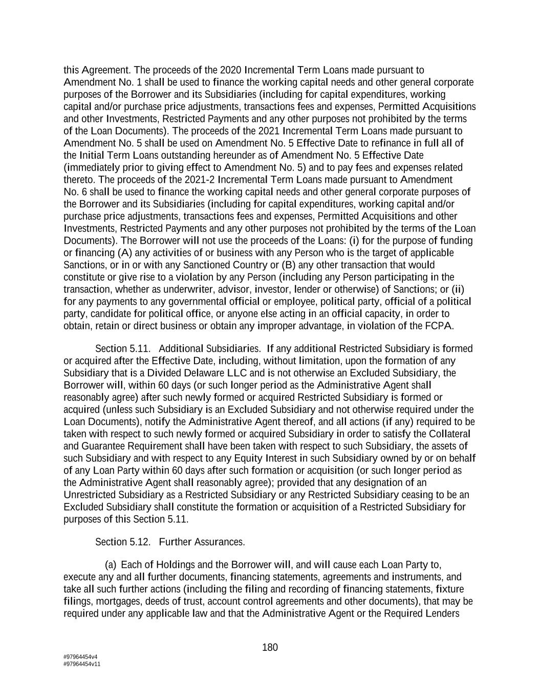 180 #97964454v4 #97964454v11 this Agreement. The proceeds of the 2020 Incremental Term Loans made pursuant to Amendment No. 1 shall be used to finance the working capital needs and other general corporate purposes of the Borrower and its Subsidiaries (including for capital expenditures, working capital and/or purchase price adjustments, transactions fees and expenses, Permitted Acquisitions and other Investments, Restricted Payments and any other purposes not prohibited by the terms of the Loan Documents). The proceeds of the 2021 Incremental Term Loans made pursuant to Amendment No. 5 shall be used on Amendment No. 5 Effective Date to refinance in full all of the Initial Term Loans outstanding hereunder as of Amendment No. 5 Effective Date (immediately prior to giving effect to Amendment No. 5) and to pay fees and expenses related thereto. The proceeds of the 2021-2 Incremental Term Loans made pursuant to Amendment No. 6 shall be used to finance the working capital needs and other general corporate purposes of the Borrower and its Subsidiaries (including for capital expenditures, working capital and/or purchase price adjustments, transactions fees and expenses, Permitted Acquisitions and other Investments, Restricted Payments and any other purposes not prohibited by the terms of the Loan Documents). The Borrower will not use the proceeds of the Loans: (i) for the purpose of funding or financing (A) any activities of or business with any Person who is the target of applicable Sanctions, or in or with any Sanctioned Country or (B) any other transaction that would constitute or give rise to a violation by any Person (including any Person participating in the transaction, whether as underwriter, advisor, investor, lender or otherwise) of Sanctions; or (ii) for any payments to any governmental official or employee, political party, official of a political party, candidate for political office, or anyone else acting in an official capacity, in order to obtain, retain or direct business or obtain any improper advantage, in violation of the FCPA. Section 5.11. Additional Subsidiaries. If any additional Restricted Subsidiary is formed or acquired after the Effective Date, including, without limitation, upon the formation of any Subsidiary that is a Divided Delaware LLC and is not otherwise an Excluded Subsidiary, the Borrower will, within 60 days (or such longer period as the Administrative Agent shall reasonably agree) after such newly formed or acquired Restricted Subsidiary is formed or acquired (unless such Subsidiary is an Excluded Subsidiary and not otherwise required under the Loan Documents), notify the Administrative Agent thereof, and all actions (if any) required to be taken with respect to such newly formed or acquired Subsidiary in order to satisfy the Collateral and Guarantee Requirement shall have been taken with respect to such Subsidiary, the assets of such Subsidiary and with respect to any Equity Interest in such Subsidiary owned by or on behalf of any Loan Party within 60 days after such formation or acquisition (or such longer period as the Administrative Agent shall reasonably agree); provided that any designation of an Unrestricted Subsidiary as a Restricted Subsidiary or any Restricted Subsidiary ceasing to be an Excluded Subsidiary shall constitute the formation or acquisition of a Restricted Subsidiary for purposes of this Section 5.11. Section 5.12. Further Assurances. (a) Each of Holdings and the Borrower will, and will cause each Loan Party to, execute any and all further documents, financing statements, agreements and instruments, and take all such further actions (including the filing and recording of financing statements, fixture filings, mortgages, deeds of trust, account control agreements and other documents), that may be required under any applicable law and that the Administrative Agent or the Required Lenders