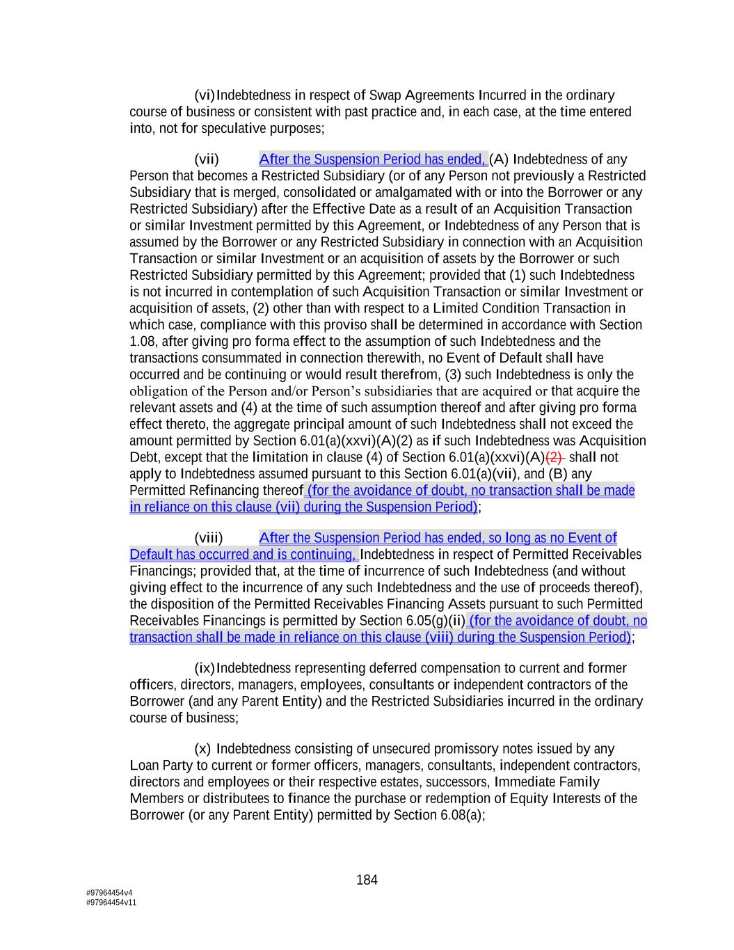 184 #97964454v4 #97964454v11 (vi) Indebtedness in respect of Swap Agreements Incurred in the ordinary course of business or consistent with past practice and, in each case, at the time entered into, not for speculative purposes; (vii) After the Suspension Period has ended, (A) Indebtedness of any Person that becomes a Restricted Subsidiary (or of any Person not previously a Restricted Subsidiary that is merged, consolidated or amalgamated with or into the Borrower or any Restricted Subsidiary) after the Effective Date as a result of an Acquisition Transaction or similar Investment permitted by this Agreement, or Indebtedness of any Person that is assumed by the Borrower or any Restricted Subsidiary in connection with an Acquisition Transaction or similar Investment or an acquisition of assets by the Borrower or such Restricted Subsidiary permitted by this Agreement; provided that (1) such Indebtedness is not incurred in contemplation of such Acquisition Transaction or similar Investment or acquisition of assets, (2) other than with respect to a Limited Condition Transaction in which case, compliance with this proviso shall be determined in accordance with Section 1.08, after giving pro forma effect to the assumption of such Indebtedness and the transactions consummated in connection therewith, no Event of Default shall have occurred and be continuing or would result therefrom, (3) such Indebtedness is only the obligation of the Person and/or Person’s subsidiaries that are acquired or that acquire the relevant assets and (4) at the time of such assumption thereof and after giving pro forma effect thereto, the aggregate principal amount of such Indebtedness shall not exceed the amount permitted by Section 6.01(a)(xxvi)(A)(2) as if such Indebtedness was Acquisition Debt, except that the limitation in clause (4) of Section 6.01(a)(xxvi)(A)(2) shall not apply to Indebtedness assumed pursuant to this Section 6.01(a)(vii), and (B) any Permitted Refinancing thereof (for the avoidance of doubt, no transaction shall be made in reliance on this clause (vii) during the Suspension Period); (viii) After the Suspension Period has ended, so long as no Event of Default has occurred and is continuing, Indebtedness in respect of Permitted Receivables Financings; provided that, at the time of incurrence of such Indebtedness (and without giving effect to the incurrence of any such Indebtedness and the use of proceeds thereof), the disposition of the Permitted Receivables Financing Assets pursuant to such Permitted Receivables Financings is permitted by Section 6.05(g)(ii) (for the avoidance of doubt, no transaction shall be made in reliance on this clause (viii) during the Suspension Period); (ix) Indebtedness representing deferred compensation to current and former officers, directors, managers, employees, consultants or independent contractors of the Borrower (and any Parent Entity) and the Restricted Subsidiaries incurred in the ordinary course of business; (x) Indebtedness consisting of unsecured promissory notes issued by any Loan Party to current or former officers, managers, consultants, independent contractors, directors and employees or their respective estates, successors, Immediate Family Members or distributees to finance the purchase or redemption of Equity Interests of the Borrower (or any Parent Entity) permitted by Section 6.08(a);