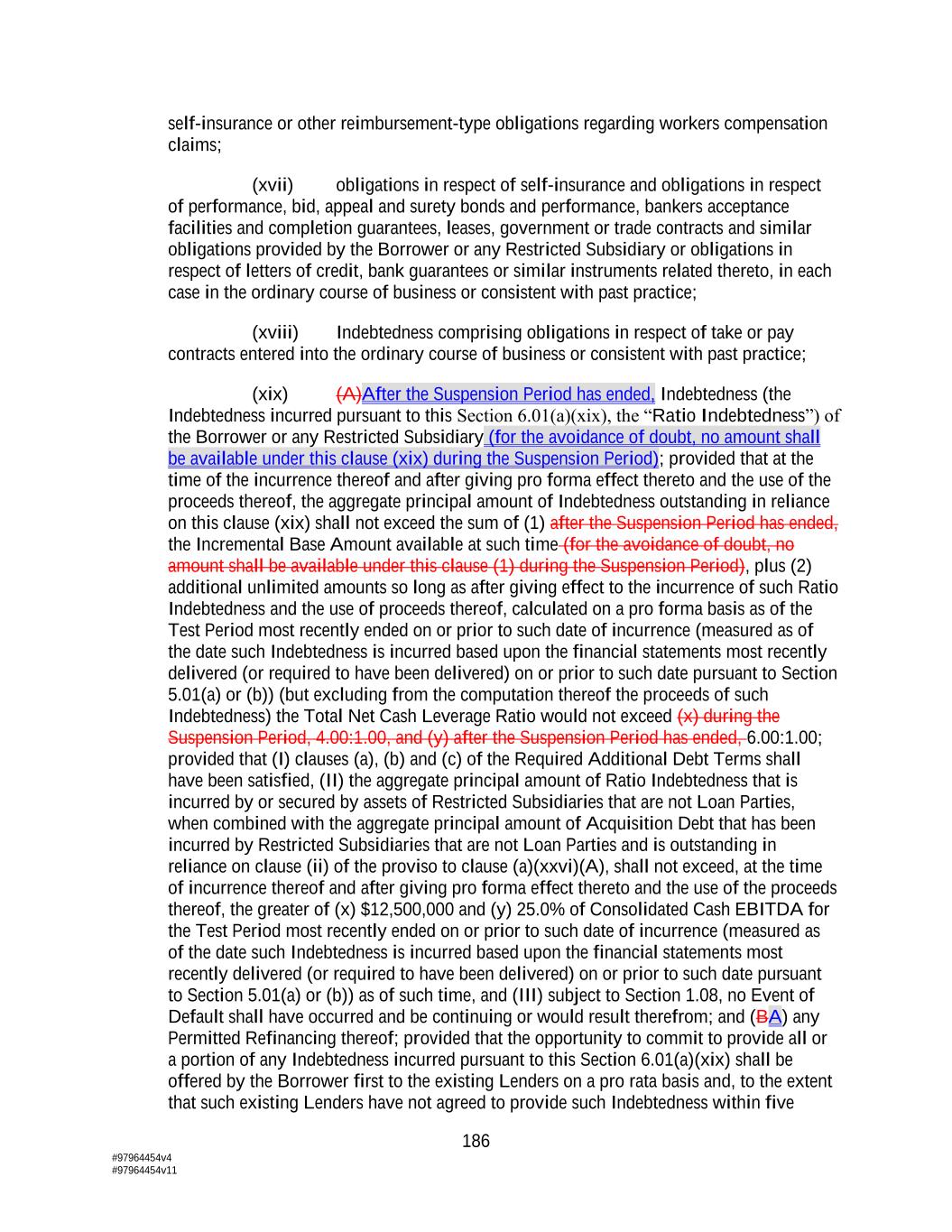186 #97964454v4 #97964454v11 self-insurance or other reimbursement-type obligations regarding workers compensation claims; (xvii) obligations in respect of self-insurance and obligations in respect of performance, bid, appeal and surety bonds and performance, bankers acceptance facilities and completion guarantees, leases, government or trade contracts and similar obligations provided by the Borrower or any Restricted Subsidiary or obligations in respect of letters of credit, bank guarantees or similar instruments related thereto, in each case in the ordinary course of business or consistent with past practice; (xviii) Indebtedness comprising obligations in respect of take or pay contracts entered into the ordinary course of business or consistent with past practice; (xix) (A)After the Suspension Period has ended, Indebtedness (the Indebtedness incurred pursuant to this Section 6.01(a)(xix), the “Ratio Indebtedness”) of the Borrower or any Restricted Subsidiary (for the avoidance of doubt, no amount shall be available under this clause (xix) during the Suspension Period); provided that at the time of the incurrence thereof and after giving pro forma effect thereto and the use of the proceeds thereof, the aggregate principal amount of Indebtedness outstanding in reliance on this clause (xix) shall not exceed the sum of (1) after the Suspension Period has ended, the Incremental Base Amount available at such time (for the avoidance of doubt, no amount shall be available under this clause (1) during the Suspension Period), plus (2) additional unlimited amounts so long as after giving effect to the incurrence of such Ratio Indebtedness and the use of proceeds thereof, calculated on a pro forma basis as of the Test Period most recently ended on or prior to such date of incurrence (measured as of the date such Indebtedness is incurred based upon the financial statements most recently delivered (or required to have been delivered) on or prior to such date pursuant to Section 5.01(a) or (b)) (but excluding from the computation thereof the proceeds of such Indebtedness) the Total Net Cash Leverage Ratio would not exceed (x) during the Suspension Period, 4.00:1.00, and (y) after the Suspension Period has ended, 6.00:1.00; provided that (I) clauses (a), (b) and (c) of the Required Additional Debt Terms shall have been satisfied, (II) the aggregate principal amount of Ratio Indebtedness that is incurred by or secured by assets of Restricted Subsidiaries that are not Loan Parties, when combined with the aggregate principal amount of Acquisition Debt that has been incurred by Restricted Subsidiaries that are not Loan Parties and is outstanding in reliance on clause (ii) of the proviso to clause (a)(xxvi)(A), shall not exceed, at the time of incurrence thereof and after giving pro forma effect thereto and the use of the proceeds thereof, the greater of (x) $12,500,000 and (y) 25.0% of Consolidated Cash EBITDA for the Test Period most recently ended on or prior to such date of incurrence (measured as of the date such Indebtedness is incurred based upon the financial statements most recently delivered (or required to have been delivered) on or prior to such date pursuant to Section 5.01(a) or (b)) as of such time, and (III) subject to Section 1.08, no Event of Default shall have occurred and be continuing or would result therefrom; and (BA) any Permitted Refinancing thereof; provided that the opportunity to commit to provide all or a portion of any Indebtedness incurred pursuant to this Section 6.01(a)(xix) shall be offered by the Borrower first to the existing Lenders on a pro rata basis and, to the extent that such existing Lenders have not agreed to provide such Indebtedness within five