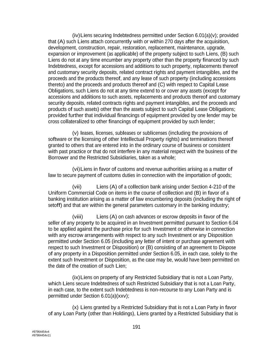 191 #97964454v4 #97964454v11 (iv) Liens securing Indebtedness permitted under Section 6.01(a)(v); provided that (A) such Liens attach concurrently with or within 270 days after the acquisition, development, construction, repair, restoration, replacement, maintenance, upgrade, expansion or improvement (as applicable) of the property subject to such Liens, (B) such Liens do not at any time encumber any property other than the property financed by such Indebtedness, except for accessions and additions to such property, replacements thereof and customary security deposits, related contract rights and payment intangibles, and the proceeds and the products thereof, and any lease of such property (including accessions thereto) and the proceeds and products thereof and (C) with respect to Capital Lease Obligations, such Liens do not at any time extend to or cover any assets (except for accessions and additions to such assets, replacements and products thereof and customary security deposits, related contracts rights and payment intangibles, and the proceeds and products of such assets) other than the assets subject to such Capital Lease Obligations; provided further that individual financings of equipment provided by one lender may be cross collateralized to other financings of equipment provided by such lender; (v) leases, licenses, subleases or sublicenses (including the provisions of software or the licensing of other Intellectual Property rights) and terminations thereof granted to others that are entered into in the ordinary course of business or consistent with past practice or that do not interfere in any material respect with the business of the Borrower and the Restricted Subsidiaries, taken as a whole; (vi) Liens in favor of customs and revenue authorities arising as a matter of law to secure payment of customs duties in connection with the importation of goods; (vii) Liens (A) of a collection bank arising under Section 4-210 of the Uniform Commercial Code on items in the course of collection and (B) in favor of a banking institution arising as a matter of law encumbering deposits (including the right of setoff) and that are within the general parameters customary in the banking industry; (viii) Liens (A) on cash advances or escrow deposits in favor of the seller of any property to be acquired in an Investment permitted pursuant to Section 6.04 to be applied against the purchase price for such Investment or otherwise in connection with any escrow arrangements with respect to any such Investment or any Disposition permitted under Section 6.05 (including any letter of intent or purchase agreement with respect to such Investment or Disposition) or (B) consisting of an agreement to Dispose of any property in a Disposition permitted under Section 6.05, in each case, solely to the extent such Investment or Disposition, as the case may be, would have been permitted on the date of the creation of such Lien; (ix) Liens on property of any Restricted Subsidiary that is not a Loan Party, which Liens secure Indebtedness of such Restricted Subsidiary that is not a Loan Party, in each case, to the extent such Indebtedness is non-recourse to any Loan Party and is permitted under Section 6.01(a)(xxv); (x) Liens granted by a Restricted Subsidiary that is not a Loan Party in favor of any Loan Party (other than Holdings), Liens granted by a Restricted Subsidiary that is