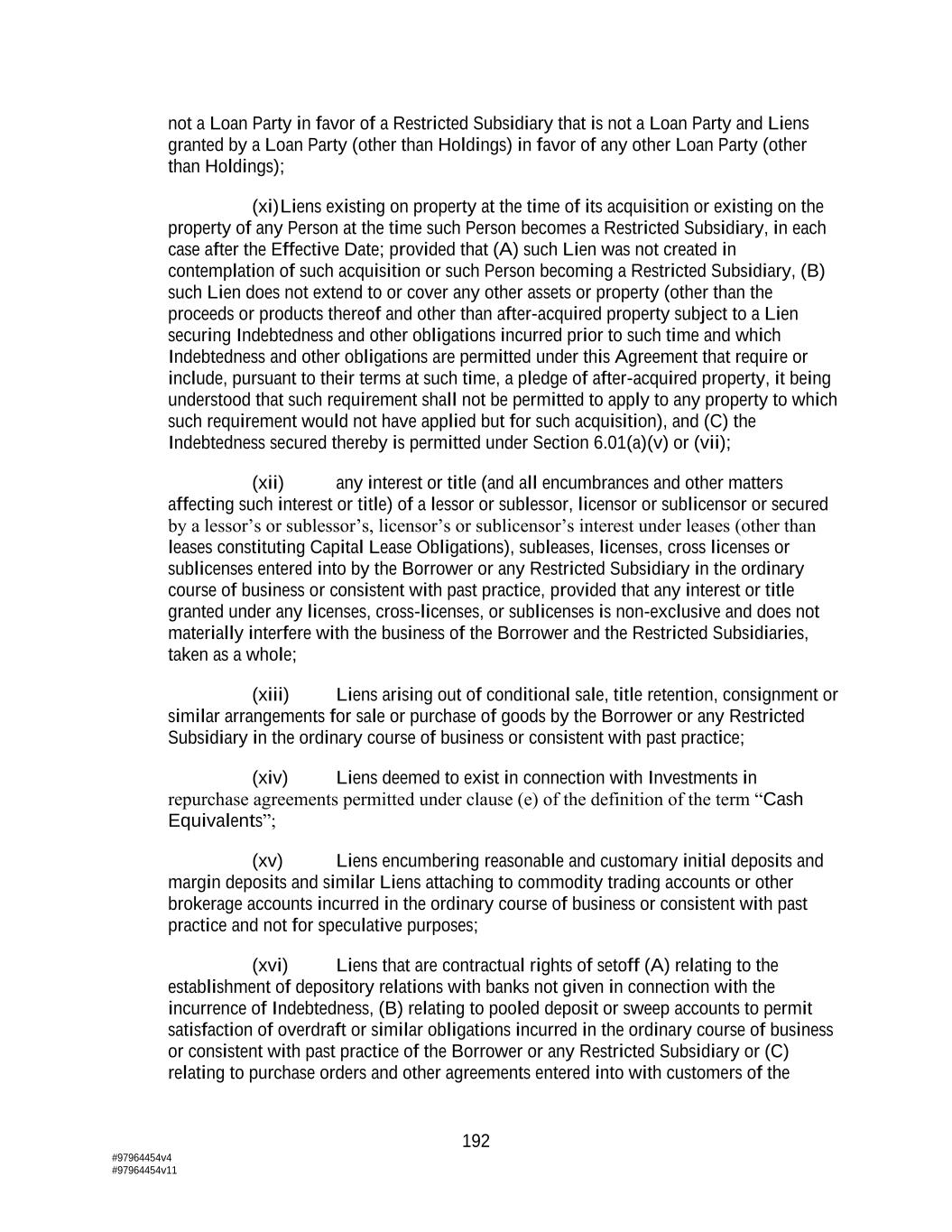 192 #97964454v4 #97964454v11 not a Loan Party in favor of a Restricted Subsidiary that is not a Loan Party and Liens granted by a Loan Party (other than Holdings) in favor of any other Loan Party (other than Holdings); (xi) Liens existing on property at the time of its acquisition or existing on the property of any Person at the time such Person becomes a Restricted Subsidiary, in each case after the Effective Date; provided that (A) such Lien was not created in contemplation of such acquisition or such Person becoming a Restricted Subsidiary, (B) such Lien does not extend to or cover any other assets or property (other than the proceeds or products thereof and other than after-acquired property subject to a Lien securing Indebtedness and other obligations incurred prior to such time and which Indebtedness and other obligations are permitted under this Agreement that require or include, pursuant to their terms at such time, a pledge of after-acquired property, it being understood that such requirement shall not be permitted to apply to any property to which such requirement would not have applied but for such acquisition), and (C) the Indebtedness secured thereby is permitted under Section 6.01(a)(v) or (vii); (xii) any interest or title (and all encumbrances and other matters affecting such interest or title) of a lessor or sublessor, licensor or sublicensor or secured by a lessor’s or sublessor’s, licensor’s or sublicensor’s interest under leases (other than leases constituting Capital Lease Obligations), subleases, licenses, cross licenses or sublicenses entered into by the Borrower or any Restricted Subsidiary in the ordinary course of business or consistent with past practice, provided that any interest or title granted under any licenses, cross-licenses, or sublicenses is non-exclusive and does not materially interfere with the business of the Borrower and the Restricted Subsidiaries, taken as a whole; (xiii) Liens arising out of conditional sale, title retention, consignment or similar arrangements for sale or purchase of goods by the Borrower or any Restricted Subsidiary in the ordinary course of business or consistent with past practice; (xiv) Liens deemed to exist in connection with Investments in repurchase agreements permitted under clause (e) of the definition of the term “Cash Equivalents”; (xv) Liens encumbering reasonable and customary initial deposits and margin deposits and similar Liens attaching to commodity trading accounts or other brokerage accounts incurred in the ordinary course of business or consistent with past practice and not for speculative purposes; (xvi) Liens that are contractual rights of setoff (A) relating to the establishment of depository relations with banks not given in connection with the incurrence of Indebtedness, (B) relating to pooled deposit or sweep accounts to permit satisfaction of overdraft or similar obligations incurred in the ordinary course of business or consistent with past practice of the Borrower or any Restricted Subsidiary or (C) relating to purchase orders and other agreements entered into with customers of the