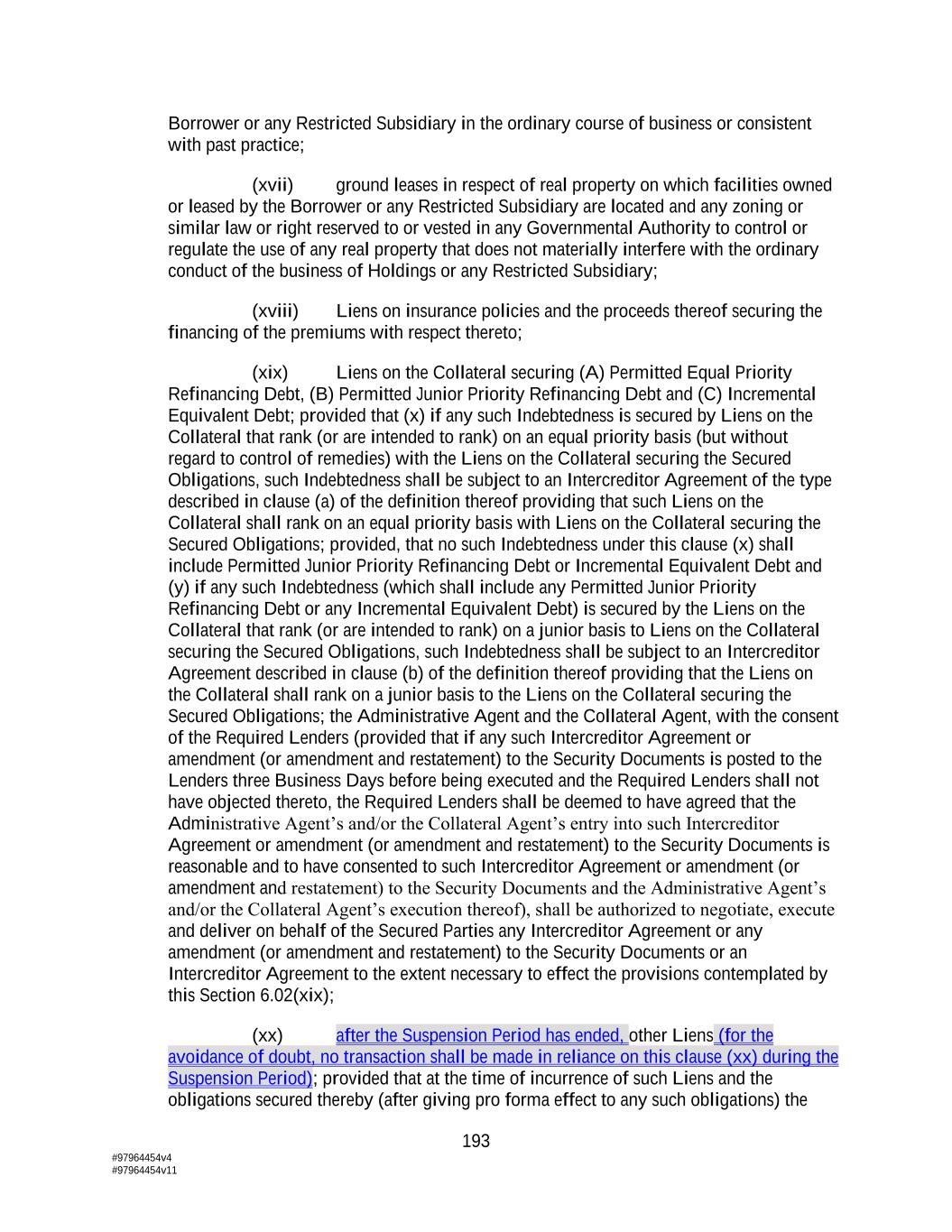 193 #97964454v4 #97964454v11 Borrower or any Restricted Subsidiary in the ordinary course of business or consistent with past practice; (xvii) ground leases in respect of real property on which facilities owned or leased by the Borrower or any Restricted Subsidiary are located and any zoning or similar law or right reserved to or vested in any Governmental Authority to control or regulate the use of any real property that does not materially interfere with the ordinary conduct of the business of Holdings or any Restricted Subsidiary; (xviii) Liens on insurance policies and the proceeds thereof securing the financing of the premiums with respect thereto; (xix) Liens on the Collateral securing (A) Permitted Equal Priority Refinancing Debt, (B) Permitted Junior Priority Refinancing Debt and (C) Incremental Equivalent Debt; provided that (x) if any such Indebtedness is secured by Liens on the Collateral that rank (or are intended to rank) on an equal priority basis (but without regard to control of remedies) with the Liens on the Collateral securing the Secured Obligations, such Indebtedness shall be subject to an Intercreditor Agreement of the type described in clause (a) of the definition thereof providing that such Liens on the Collateral shall rank on an equal priority basis with Liens on the Collateral securing the Secured Obligations; provided, that no such Indebtedness under this clause (x) shall include Permitted Junior Priority Refinancing Debt or Incremental Equivalent Debt and (y) if any such Indebtedness (which shall include any Permitted Junior Priority Refinancing Debt or any Incremental Equivalent Debt) is secured by the Liens on the Collateral that rank (or are intended to rank) on a junior basis to Liens on the Collateral securing the Secured Obligations, such Indebtedness shall be subject to an Intercreditor Agreement described in clause (b) of the definition thereof providing that the Liens on the Collateral shall rank on a junior basis to the Liens on the Collateral securing the Secured Obligations; the Administrative Agent and the Collateral Agent, with the consent of the Required Lenders (provided that if any such Intercreditor Agreement or amendment (or amendment and restatement) to the Security Documents is posted to the Lenders three Business Days before being executed and the Required Lenders shall not have objected thereto, the Required Lenders shall be deemed to have agreed that the Administrative Agent’s and/or the Collateral Agent’s entry into such Intercreditor Agreement or amendment (or amendment and restatement) to the Security Documents is reasonable and to have consented to such Intercreditor Agreement or amendment (or amendment and restatement) to the Security Documents and the Administrative Agent’s and/or the Collateral Agent’s execution thereof), shall be authorized to negotiate, execute and deliver on behalf of the Secured Parties any Intercreditor Agreement or any amendment (or amendment and restatement) to the Security Documents or an Intercreditor Agreement to the extent necessary to effect the provisions contemplated by this Section 6.02(xix); (xx) after the Suspension Period has ended, other Liens (for the avoidance of doubt, no transaction shall be made in reliance on this clause (xx) during the Suspension Period); provided that at the time of incurrence of such Liens and the obligations secured thereby (after giving pro forma effect to any such obligations) the