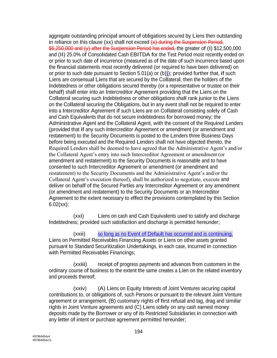 194 #97964454v4 #97964454v11 aggregate outstanding principal amount of obligations secured by Liens then outstanding in reliance on this clause (xx) shall not exceed (x) during the Suspension Period, $6,250,000 and (y) after the Suspension Period has ended, the greater of (I) $12,500,000 and (II) 25.0% of Consolidated Cash EBITDA for the Test Period most recently ended on or prior to such date of incurrence (measured as of the date of such incurrence based upon the financial statements most recently delivered (or required to have been delivered) on or prior to such date pursuant to Section 5.01(a) or (b))); provided further that, if such Liens are consensual Liens that are secured by the Collateral, then the holders of the Indebtedness or other obligations secured thereby (or a representative or trustee on their behalf) shall enter into an Intercreditor Agreement providing that the Liens on the Collateral securing such Indebtedness or other obligations shall rank junior to the Liens on the Collateral securing the Obligations, but in any event shall not be required to enter into a Intercreditor Agreement if such Liens are on Collateral consisting solely of Cash and Cash Equivalents that do not secure indebtedness for borrowed money; the Administrative Agent and the Collateral Agent, with the consent of the Required Lenders (provided that if any such Intercreditor Agreement or amendment (or amendment and restatement) to the Security Documents is posted to the Lenders three Business Days before being executed and the Required Lenders shall not have objected thereto, the Required Lenders shall be deemed to have agreed that the Administrative Agent’s and/or the Collateral Agent’s entry into such Intercreditor Agreement or amendment (or amendment and restatement) to the Security Documents is reasonable and to have consented to such Intercreditor Agreement or amendment (or amendment and restatement) to the Security Documents and the Administrative Agent’s and/or the Collateral Agent’s execution thereof), shall be authorized to negotiate, execute and deliver on behalf of the Secured Parties any Intercreditor Agreement or any amendment (or amendment and restatement) to the Security Documents or an Intercreditor Agreement to the extent necessary to effect the provisions contemplated by this Section 6.02(xx); (xxi) Liens on cash and Cash Equivalents used to satisfy and discharge Indebtedness; provided such satisfaction and discharge is permitted hereunder; (xxii) so long as no Event of Default has occurred and is continuing, Liens on Permitted Receivables Financing Assets or Liens on other assets granted pursuant to Standard Securitization Undertakings, in each case, incurred in connection with Permitted Receivables Financings; (xxiii) receipt of progress payments and advances from customers in the ordinary course of business to the extent the same creates a Lien on the related inventory and proceeds thereof; (xxiv) (A) Liens on Equity Interests of Joint Ventures securing capital contributions to, or obligations of, such Persons or pursuant to the relevant Joint Venture agreement or arrangement, (B) customary rights of first refusal and tag, drag and similar rights in Joint Venture agreements and (C) Liens solely on any cash earnest money deposits made by the Borrower or any of its Restricted Subsidiaries in connection with any letter of intent or purchase agreement permitted hereunder;