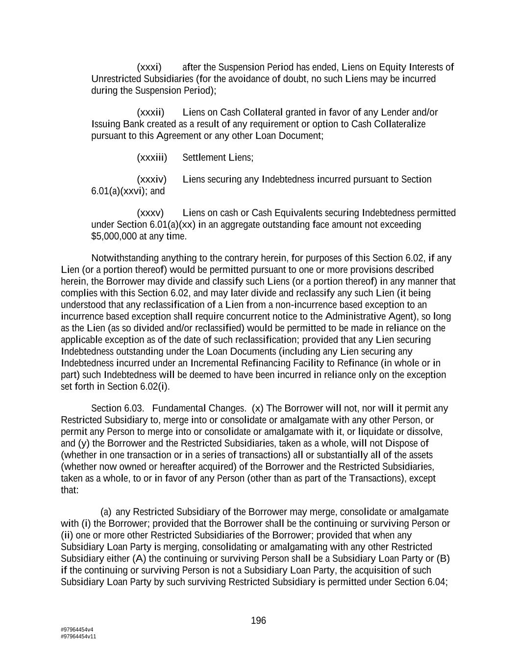 196 #97964454v4 #97964454v11 (xxxi) after the Suspension Period has ended, Liens on Equity Interests of Unrestricted Subsidiaries (for the avoidance of doubt, no such Liens may be incurred during the Suspension Period); (xxxii) Liens on Cash Collateral granted in favor of any Lender and/or Issuing Bank created as a result of any requirement or option to Cash Collateralize pursuant to this Agreement or any other Loan Document; (xxxiii) Settlement Liens; (xxxiv) Liens securing any Indebtedness incurred pursuant to Section 6.01(a)(xxvi); and (xxxv) Liens on cash or Cash Equivalents securing Indebtedness permitted under Section 6.01(a)(xx) in an aggregate outstanding face amount not exceeding $5,000,000 at any time. Notwithstanding anything to the contrary herein, for purposes of this Section 6.02, if any Lien (or a portion thereof) would be permitted pursuant to one or more provisions described herein, the Borrower may divide and classify such Liens (or a portion thereof) in any manner that complies with this Section 6.02, and may later divide and reclassify any such Lien (it being understood that any reclassification of a Lien from a non-incurrence based exception to an incurrence based exception shall require concurrent notice to the Administrative Agent), so long as the Lien (as so divided and/or reclassified) would be permitted to be made in reliance on the applicable exception as of the date of such reclassification; provided that any Lien securing Indebtedness outstanding under the Loan Documents (including any Lien securing any Indebtedness incurred under an Incremental Refinancing Facility to Refinance (in whole or in part) such Indebtedness will be deemed to have been incurred in reliance only on the exception set forth in Section 6.02(i). Section 6.03. Fundamental Changes. (x) The Borrower will not, nor will it permit any Restricted Subsidiary to, merge into or consolidate or amalgamate with any other Person, or permit any Person to merge into or consolidate or amalgamate with it, or liquidate or dissolve, and (y) the Borrower and the Restricted Subsidiaries, taken as a whole, will not Dispose of (whether in one transaction or in a series of transactions) all or substantially all of the assets (whether now owned or hereafter acquired) of the Borrower and the Restricted Subsidiaries, taken as a whole, to or in favor of any Person (other than as part of the Transactions), except that: (a) any Restricted Subsidiary of the Borrower may merge, consolidate or amalgamate with (i) the Borrower; provided that the Borrower shall be the continuing or surviving Person or (ii) one or more other Restricted Subsidiaries of the Borrower; provided that when any Subsidiary Loan Party is merging, consolidating or amalgamating with any other Restricted Subsidiary either (A) the continuing or surviving Person shall be a Subsidiary Loan Party or (B) if the continuing or surviving Person is not a Subsidiary Loan Party, the acquisition of such Subsidiary Loan Party by such surviving Restricted Subsidiary is permitted under Section 6.04;