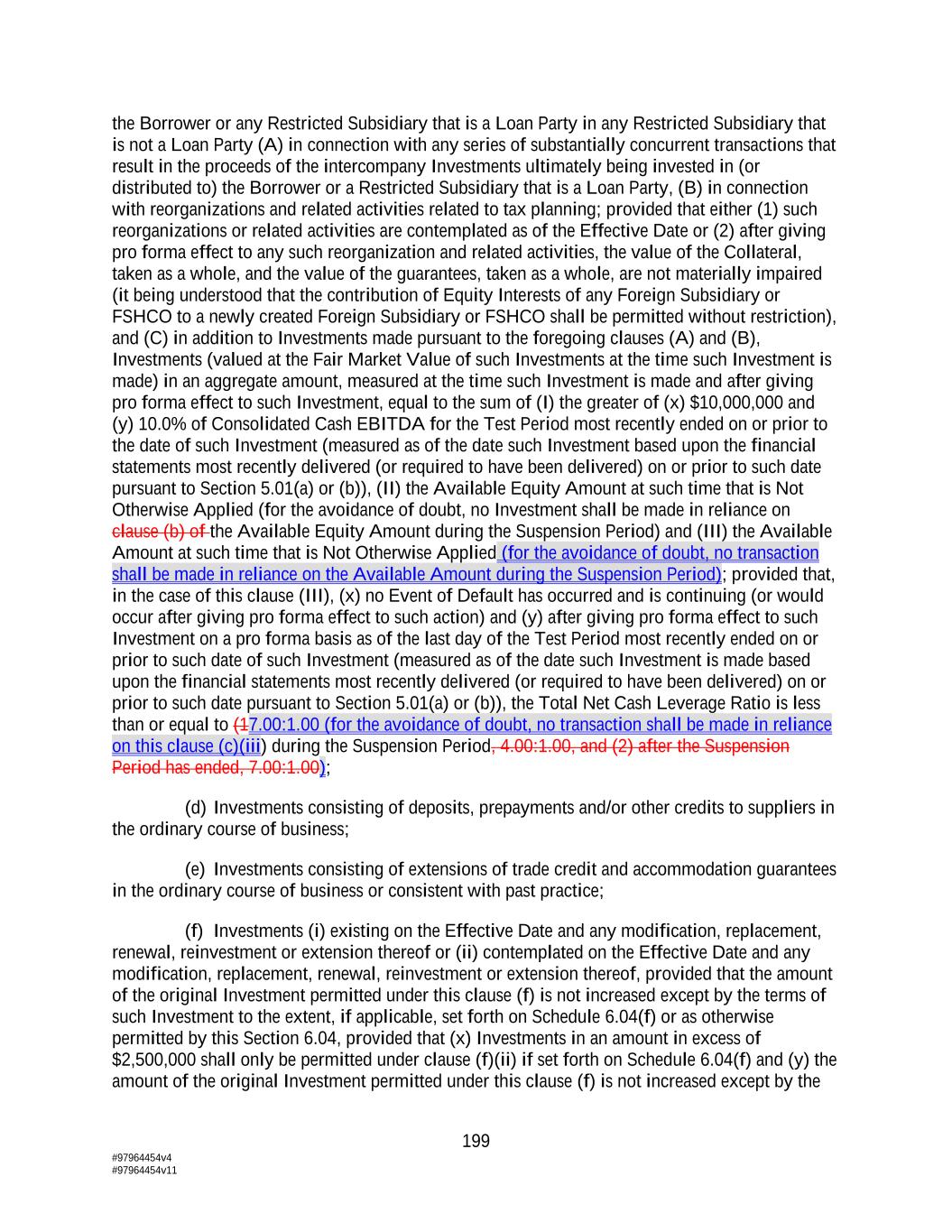 199 #97964454v4 #97964454v11 the Borrower or any Restricted Subsidiary that is a Loan Party in any Restricted Subsidiary that is not a Loan Party (A) in connection with any series of substantially concurrent transactions that result in the proceeds of the intercompany Investments ultimately being invested in (or distributed to) the Borrower or a Restricted Subsidiary that is a Loan Party, (B) in connection with reorganizations and related activities related to tax planning; provided that either (1) such reorganizations or related activities are contemplated as of the Effective Date or (2) after giving pro forma effect to any such reorganization and related activities, the value of the Collateral, taken as a whole, and the value of the guarantees, taken as a whole, are not materially impaired (it being understood that the contribution of Equity Interests of any Foreign Subsidiary or FSHCO to a newly created Foreign Subsidiary or FSHCO shall be permitted without restriction), and (C) in addition to Investments made pursuant to the foregoing clauses (A) and (B), Investments (valued at the Fair Market Value of such Investments at the time such Investment is made) in an aggregate amount, measured at the time such Investment is made and after giving pro forma effect to such Investment, equal to the sum of (I) the greater of (x) $10,000,000 and (y) 10.0% of Consolidated Cash EBITDA for the Test Period most recently ended on or prior to the date of such Investment (measured as of the date such Investment based upon the financial statements most recently delivered (or required to have been delivered) on or prior to such date pursuant to Section 5.01(a) or (b)), (II) the Available Equity Amount at such time that is Not Otherwise Applied (for the avoidance of doubt, no Investment shall be made in reliance on clause (b) of the Available Equity Amount during the Suspension Period) and (III) the Available Amount at such time that is Not Otherwise Applied (for the avoidance of doubt, no transaction shall be made in reliance on the Available Amount during the Suspension Period); provided that, in the case of this clause (III), (x) no Event of Default has occurred and is continuing (or would occur after giving pro forma effect to such action) and (y) after giving pro forma effect to such Investment on a pro forma basis as of the last day of the Test Period most recently ended on or prior to such date of such Investment (measured as of the date such Investment is made based upon the financial statements most recently delivered (or required to have been delivered) on or prior to such date pursuant to Section 5.01(a) or (b)), the Total Net Cash Leverage Ratio is less than or equal to (17.00:1.00 (for the avoidance of doubt, no transaction shall be made in reliance on this clause (c)(iii) during the Suspension Period, 4.00:1.00, and (2) after the Suspension Period has ended, 7.00:1.00); (d) Investments consisting of deposits, prepayments and/or other credits to suppliers in the ordinary course of business; (e) Investments consisting of extensions of trade credit and accommodation guarantees in the ordinary course of business or consistent with past practice; (f) Investments (i) existing on the Effective Date and any modification, replacement, renewal, reinvestment or extension thereof or (ii) contemplated on the Effective Date and any modification, replacement, renewal, reinvestment or extension thereof, provided that the amount of the original Investment permitted under this clause (f) is not increased except by the terms of such Investment to the extent, if applicable, set forth on Schedule 6.04(f) or as otherwise permitted by this Section 6.04, provided that (x) Investments in an amount in excess of $2,500,000 shall only be permitted under clause (f)(ii) if set forth on Schedule 6.04(f) and (y) the amount of the original Investment permitted under this clause (f) is not increased except by the