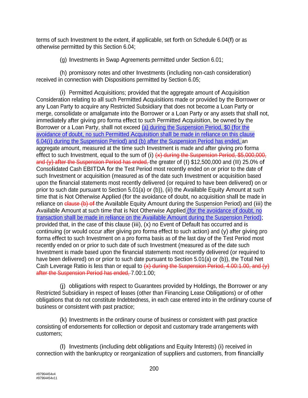 200 #97964454v4 #97964454v11 terms of such Investment to the extent, if applicable, set forth on Schedule 6.04(f) or as otherwise permitted by this Section 6.04; (g) Investments in Swap Agreements permitted under Section 6.01; (h) promissory notes and other Investments (including non-cash consideration) received in connection with Dispositions permitted by Section 6.05; (i) Permitted Acquisitions; provided that the aggregate amount of Acquisition Consideration relating to all such Permitted Acquisitions made or provided by the Borrower or any Loan Party to acquire any Restricted Subsidiary that does not become a Loan Party or merge, consolidate or amalgamate into the Borrower or a Loan Party or any assets that shall not, immediately after giving pro forma effect to such Permitted Acquisition, be owned by the Borrower or a Loan Party, shall not exceed (a) during the Suspension Period, $0 (for the avoidance of doubt, no such Permitted Acquisition shall be made in reliance on this clause 6.04(i) during the Suspension Period) and (b) after the Suspension Period has ended, an aggregate amount, measured at the time such Investment is made and after giving pro forma effect to such Investment, equal to the sum of (i) (x) during the Suspension Period, $5,000,000, and (y) after the Suspension Period has ended, the greater of (I) $12,500,000 and (II) 25.0% of Consolidated Cash EBITDA for the Test Period most recently ended on or prior to the date of such Investment or acquisition (measured as of the date such Investment or acquisition based upon the financial statements most recently delivered (or required to have been delivered) on or prior to such date pursuant to Section 5.01(a) or (b)), (ii) the Available Equity Amount at such time that is Not Otherwise Applied (for the avoidance of doubt, no acquisition shall be made in reliance on clause (b) of the Available Equity Amount during the Suspension Period) and (iii) the Available Amount at such time that is Not Otherwise Applied (for the avoidance of doubt, no transaction shall be made in reliance on the Available Amount during the Suspension Period); provided that, in the case of this clause (iii), (x) no Event of Default has occurred and is continuing (or would occur after giving pro forma effect to such action) and (y) after giving pro forma effect to such Investment on a pro forma basis as of the last day of the Test Period most recently ended on or prior to such date of such Investment (measured as of the date such Investment is made based upon the financial statements most recently delivered (or required to have been delivered) on or prior to such date pursuant to Section 5.01(a) or (b)), the Total Net Cash Leverage Ratio is less than or equal to (x) during the Suspension Period, 4.00:1.00, and (y) after the Suspension Period has ended, 7.00:1.00; (j) obligations with respect to Guarantees provided by Holdings, the Borrower or any Restricted Subsidiary in respect of leases (other than Financing Lease Obligations) or of other obligations that do not constitute Indebtedness, in each case entered into in the ordinary course of business or consistent with past practice; (k) Investments in the ordinary course of business or consistent with past practice consisting of endorsements for collection or deposit and customary trade arrangements with customers; (l) Investments (including debt obligations and Equity Interests) (i) received in connection with the bankruptcy or reorganization of suppliers and customers, from financially