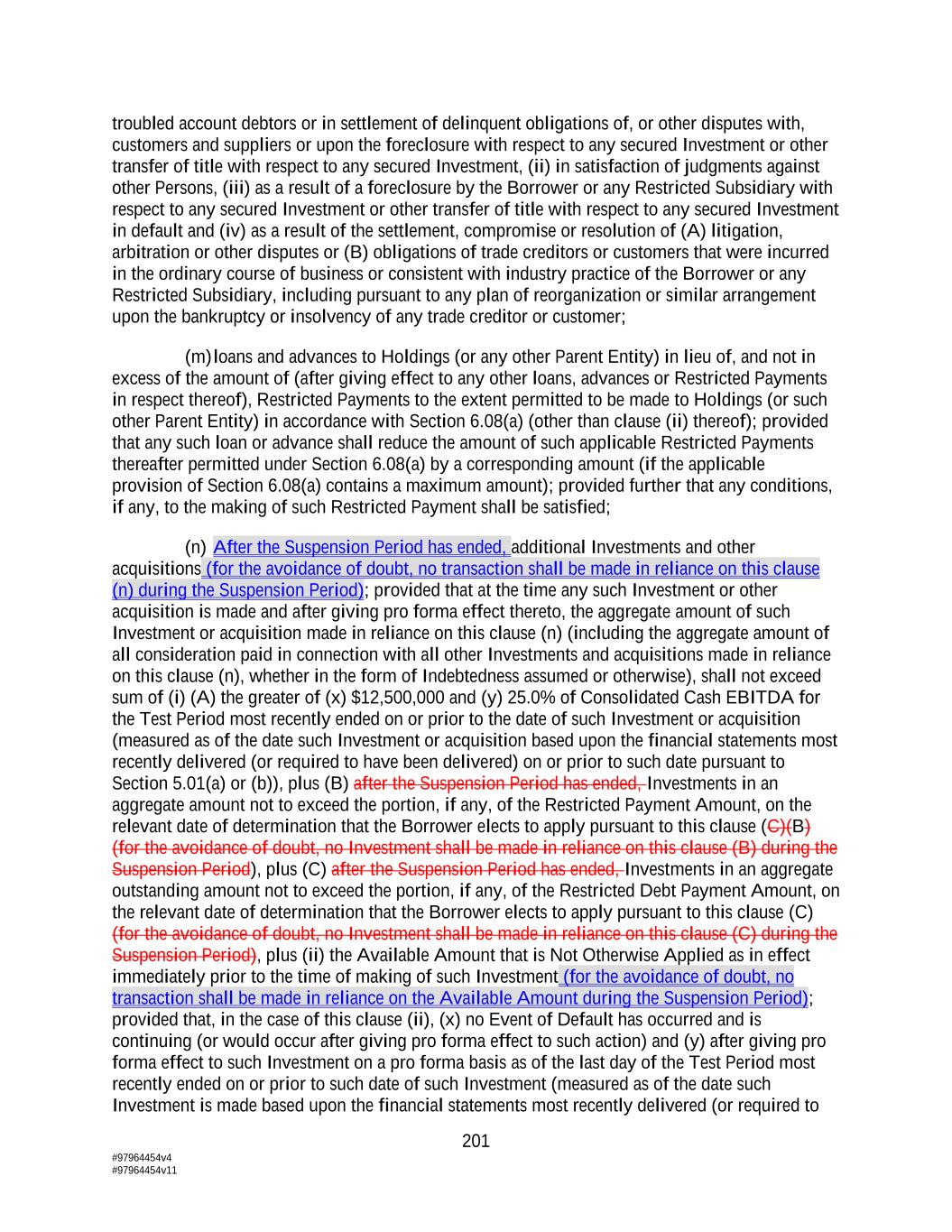 201 #97964454v4 #97964454v11 troubled account debtors or in settlement of delinquent obligations of, or other disputes with, customers and suppliers or upon the foreclosure with respect to any secured Investment or other transfer of title with respect to any secured Investment, (ii) in satisfaction of judgments against other Persons, (iii) as a result of a foreclosure by the Borrower or any Restricted Subsidiary with respect to any secured Investment or other transfer of title with respect to any secured Investment in default and (iv) as a result of the settlement, compromise or resolution of (A) litigation, arbitration or other disputes or (B) obligations of trade creditors or customers that were incurred in the ordinary course of business or consistent with industry practice of the Borrower or any Restricted Subsidiary, including pursuant to any plan of reorganization or similar arrangement upon the bankruptcy or insolvency of any trade creditor or customer; (m) loans and advances to Holdings (or any other Parent Entity) in lieu of, and not in excess of the amount of (after giving effect to any other loans, advances or Restricted Payments in respect thereof), Restricted Payments to the extent permitted to be made to Holdings (or such other Parent Entity) in accordance with Section 6.08(a) (other than clause (ii) thereof); provided that any such loan or advance shall reduce the amount of such applicable Restricted Payments thereafter permitted under Section 6.08(a) by a corresponding amount (if the applicable provision of Section 6.08(a) contains a maximum amount); provided further that any conditions, if any, to the making of such Restricted Payment shall be satisfied; (n) After the Suspension Period has ended, additional Investments and other acquisitions (for the avoidance of doubt, no transaction shall be made in reliance on this clause (n) during the Suspension Period); provided that at the time any such Investment or other acquisition is made and after giving pro forma effect thereto, the aggregate amount of such Investment or acquisition made in reliance on this clause (n) (including the aggregate amount of all consideration paid in connection with all other Investments and acquisitions made in reliance on this clause (n), whether in the form of Indebtedness assumed or otherwise), shall not exceed sum of (i) (A) the greater of (x) $12,500,000 and (y) 25.0% of Consolidated Cash EBITDA for the Test Period most recently ended on or prior to the date of such Investment or acquisition (measured as of the date such Investment or acquisition based upon the financial statements most recently delivered (or required to have been delivered) on or prior to such date pursuant to Section 5.01(a) or (b)), plus (B) after the Suspension Period has ended, Investments in an aggregate amount not to exceed the portion, if any, of the Restricted Payment Amount, on the relevant date of determination that the Borrower elects to apply pursuant to this clause (C)(B) (for the avoidance of doubt, no Investment shall be made in reliance on this clause (B) during the Suspension Period), plus (C) after the Suspension Period has ended, Investments in an aggregate outstanding amount not to exceed the portion, if any, of the Restricted Debt Payment Amount, on the relevant date of determination that the Borrower elects to apply pursuant to this clause (C) (for the avoidance of doubt, no Investment shall be made in reliance on this clause (C) during the Suspension Period), plus (ii) the Available Amount that is Not Otherwise Applied as in effect immediately prior to the time of making of such Investment (for the avoidance of doubt, no transaction shall be made in reliance on the Available Amount during the Suspension Period); provided that, in the case of this clause (ii), (x) no Event of Default has occurred and is continuing (or would occur after giving pro forma effect to such action) and (y) after giving pro forma effect to such Investment on a pro forma basis as of the last day of the Test Period most recently ended on or prior to such date of such Investment (measured as of the date such Investment is made based upon the financial statements most recently delivered (or required to