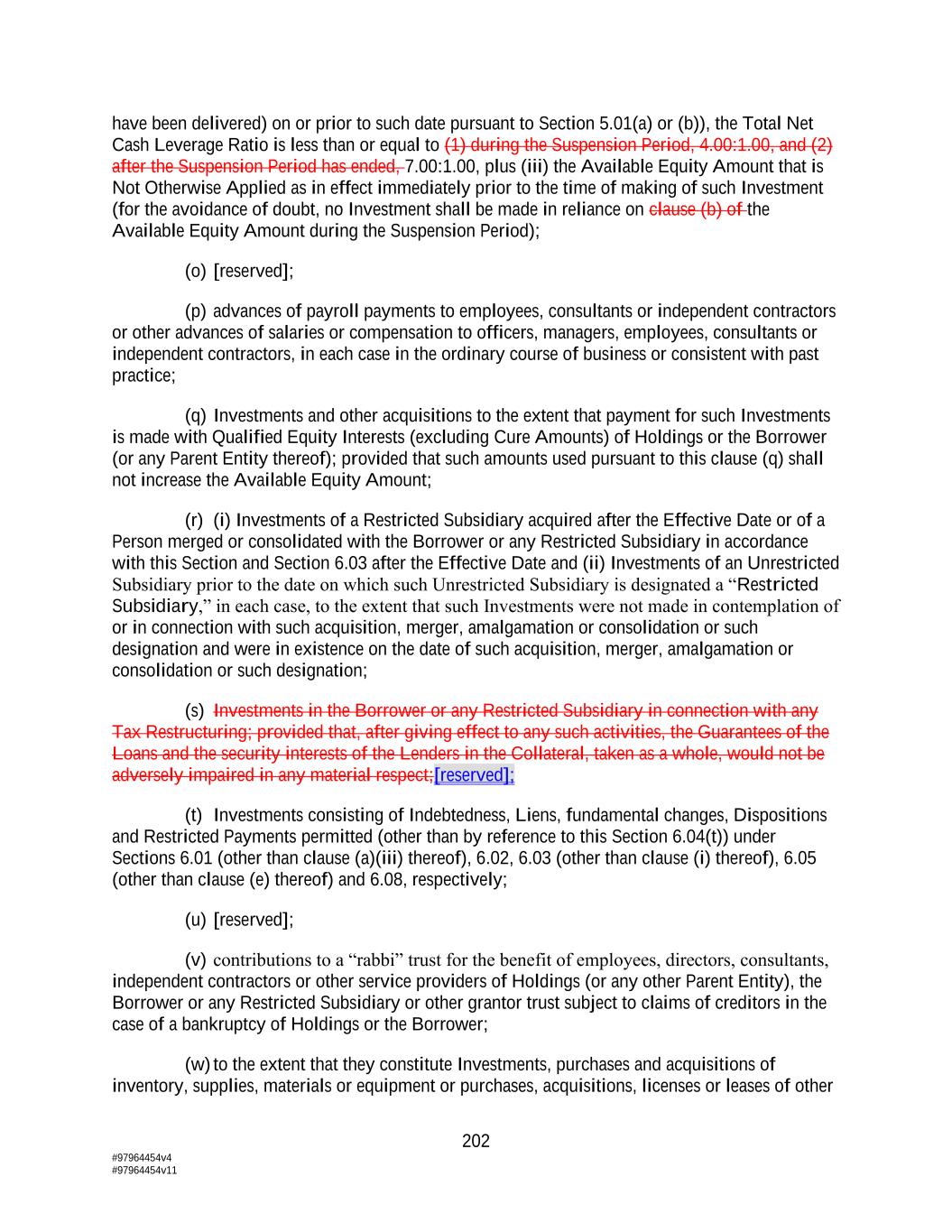 202 #97964454v4 #97964454v11 have been delivered) on or prior to such date pursuant to Section 5.01(a) or (b)), the Total Net Cash Leverage Ratio is less than or equal to (1) during the Suspension Period, 4.00:1.00, and (2) after the Suspension Period has ended, 7.00:1.00, plus (iii) the Available Equity Amount that is Not Otherwise Applied as in effect immediately prior to the time of making of such Investment (for the avoidance of doubt, no Investment shall be made in reliance on clause (b) of the Available Equity Amount during the Suspension Period); (o) [reserved]; (p) advances of payroll payments to employees, consultants or independent contractors or other advances of salaries or compensation to officers, managers, employees, consultants or independent contractors, in each case in the ordinary course of business or consistent with past practice; (q) Investments and other acquisitions to the extent that payment for such Investments is made with Qualified Equity Interests (excluding Cure Amounts) of Holdings or the Borrower (or any Parent Entity thereof); provided that such amounts used pursuant to this clause (q) shall not increase the Available Equity Amount; (r) (i) Investments of a Restricted Subsidiary acquired after the Effective Date or of a Person merged or consolidated with the Borrower or any Restricted Subsidiary in accordance with this Section and Section 6.03 after the Effective Date and (ii) Investments of an Unrestricted Subsidiary prior to the date on which such Unrestricted Subsidiary is designated a “Restricted Subsidiary,” in each case, to the extent that such Investments were not made in contemplation of or in connection with such acquisition, merger, amalgamation or consolidation or such designation and were in existence on the date of such acquisition, merger, amalgamation or consolidation or such designation; (s) Investments in the Borrower or any Restricted Subsidiary in connection with any Tax Restructuring; provided that, after giving effect to any such activities, the Guarantees of the Loans and the security interests of the Lenders in the Collateral, taken as a whole, would not be adversely impaired in any material respect;[reserved]; (t) Investments consisting of Indebtedness, Liens, fundamental changes, Dispositions and Restricted Payments permitted (other than by reference to this Section 6.04(t)) under Sections 6.01 (other than clause (a)(iii) thereof), 6.02, 6.03 (other than clause (i) thereof), 6.05 (other than clause (e) thereof) and 6.08, respectively; (u) [reserved]; (v) contributions to a “rabbi” trust for the benefit of employees, directors, consultants, independent contractors or other service providers of Holdings (or any other Parent Entity), the Borrower or any Restricted Subsidiary or other grantor trust subject to claims of creditors in the case of a bankruptcy of Holdings or the Borrower; (w) to the extent that they constitute Investments, purchases and acquisitions of inventory, supplies, materials or equipment or purchases, acquisitions, licenses or leases of other