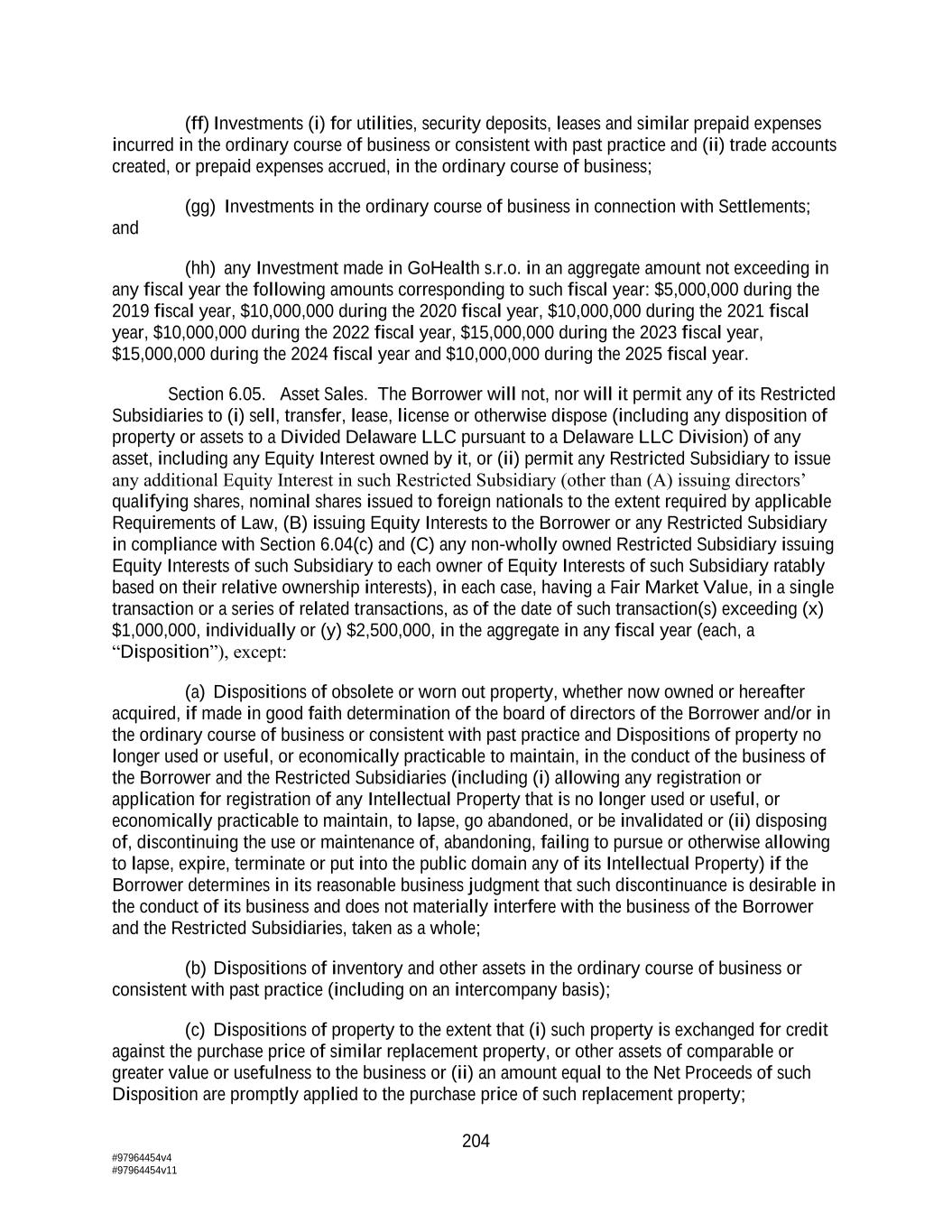 204 #97964454v4 #97964454v11 (ff) Investments (i) for utilities, security deposits, leases and similar prepaid expenses incurred in the ordinary course of business or consistent with past practice and (ii) trade accounts created, or prepaid expenses accrued, in the ordinary course of business; (gg) Investments in the ordinary course of business in connection with Settlements; and (hh) any Investment made in GoHealth s.r.o. in an aggregate amount not exceeding in any fiscal year the following amounts corresponding to such fiscal year: $5,000,000 during the 2019 fiscal year, $10,000,000 during the 2020 fiscal year, $10,000,000 during the 2021 fiscal year, $10,000,000 during the 2022 fiscal year, $15,000,000 during the 2023 fiscal year, $15,000,000 during the 2024 fiscal year and $10,000,000 during the 2025 fiscal year. Section 6.05. Asset Sales. The Borrower will not, nor will it permit any of its Restricted Subsidiaries to (i) sell, transfer, lease, license or otherwise dispose (including any disposition of property or assets to a Divided Delaware LLC pursuant to a Delaware LLC Division) of any asset, including any Equity Interest owned by it, or (ii) permit any Restricted Subsidiary to issue any additional Equity Interest in such Restricted Subsidiary (other than (A) issuing directors’ qualifying shares, nominal shares issued to foreign nationals to the extent required by applicable Requirements of Law, (B) issuing Equity Interests to the Borrower or any Restricted Subsidiary in compliance with Section 6.04(c) and (C) any non-wholly owned Restricted Subsidiary issuing Equity Interests of such Subsidiary to each owner of Equity Interests of such Subsidiary ratably based on their relative ownership interests), in each case, having a Fair Market Value, in a single transaction or a series of related transactions, as of the date of such transaction(s) exceeding (x) $1,000,000, individually or (y) $2,500,000, in the aggregate in any fiscal year (each, a “Disposition”), except: (a) Dispositions of obsolete or worn out property, whether now owned or hereafter acquired, if made in good faith determination of the board of directors of the Borrower and/or in the ordinary course of business or consistent with past practice and Dispositions of property no longer used or useful, or economically practicable to maintain, in the conduct of the business of the Borrower and the Restricted Subsidiaries (including (i) allowing any registration or application for registration of any Intellectual Property that is no longer used or useful, or economically practicable to maintain, to lapse, go abandoned, or be invalidated or (ii) disposing of, discontinuing the use or maintenance of, abandoning, failing to pursue or otherwise allowing to lapse, expire, terminate or put into the public domain any of its Intellectual Property) if the Borrower determines in its reasonable business judgment that such discontinuance is desirable in the conduct of its business and does not materially interfere with the business of the Borrower and the Restricted Subsidiaries, taken as a whole; (b) Dispositions of inventory and other assets in the ordinary course of business or consistent with past practice (including on an intercompany basis); (c) Dispositions of property to the extent that (i) such property is exchanged for credit against the purchase price of similar replacement property, or other assets of comparable or greater value or usefulness to the business or (ii) an amount equal to the Net Proceeds of such Disposition are promptly applied to the purchase price of such replacement property;