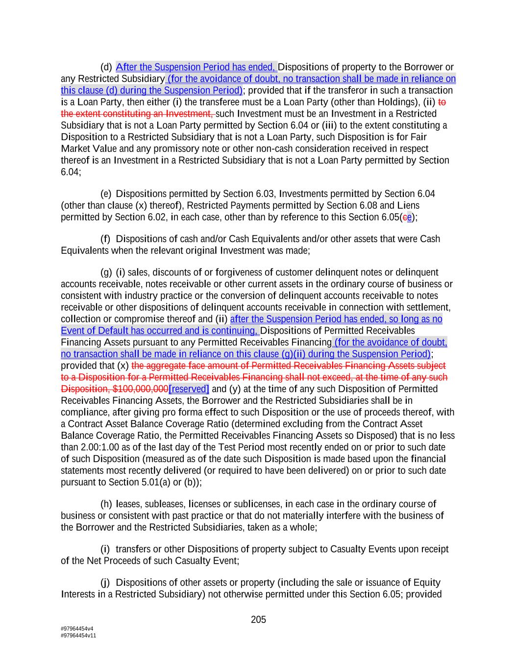 205 #97964454v4 #97964454v11 (d) After the Suspension Period has ended, Dispositions of property to the Borrower or any Restricted Subsidiary (for the avoidance of doubt, no transaction shall be made in reliance on this clause (d) during the Suspension Period); provided that if the transferor in such a transaction is a Loan Party, then either (i) the transferee must be a Loan Party (other than Holdings), (ii) to the extent constituting an Investment, such Investment must be an Investment in a Restricted Subsidiary that is not a Loan Party permitted by Section 6.04 or (iii) to the extent constituting a Disposition to a Restricted Subsidiary that is not a Loan Party, such Disposition is for Fair Market Value and any promissory note or other non-cash consideration received in respect thereof is an Investment in a Restricted Subsidiary that is not a Loan Party permitted by Section 6.04; (e) Dispositions permitted by Section 6.03, Investments permitted by Section 6.04 (other than clause (x) thereof), Restricted Payments permitted by Section 6.08 and Liens permitted by Section 6.02, in each case, other than by reference to this Section 6.05(ce); (f) Dispositions of cash and/or Cash Equivalents and/or other assets that were Cash Equivalents when the relevant original Investment was made; (g) (i) sales, discounts of or forgiveness of customer delinquent notes or delinquent accounts receivable, notes receivable or other current assets in the ordinary course of business or consistent with industry practice or the conversion of delinquent accounts receivable to notes receivable or other dispositions of delinquent accounts receivable in connection with settlement, collection or compromise thereof and (ii) after the Suspension Period has ended, so long as no Event of Default has occurred and is continuing, Dispositions of Permitted Receivables Financing Assets pursuant to any Permitted Receivables Financing (for the avoidance of doubt, no transaction shall be made in reliance on this clause (g)(ii) during the Suspension Period); provided that (x) the aggregate face amount of Permitted Receivables Financing Assets subject to a Disposition for a Permitted Receivables Financing shall not exceed, at the time of any such Disposition, $100,000,000[reserved] and (y) at the time of any such Disposition of Permitted Receivables Financing Assets, the Borrower and the Restricted Subsidiaries shall be in compliance, after giving pro forma effect to such Disposition or the use of proceeds thereof, with a Contract Asset Balance Coverage Ratio (determined excluding from the Contract Asset Balance Coverage Ratio, the Permitted Receivables Financing Assets so Disposed) that is no less than 2.00:1.00 as of the last day of the Test Period most recently ended on or prior to such date of such Disposition (measured as of the date such Disposition is made based upon the financial statements most recently delivered (or required to have been delivered) on or prior to such date pursuant to Section 5.01(a) or (b)); (h) leases, subleases, licenses or sublicenses, in each case in the ordinary course of business or consistent with past practice or that do not materially interfere with the business of the Borrower and the Restricted Subsidiaries, taken as a whole; (i) transfers or other Dispositions of property subject to Casualty Events upon receipt of the Net Proceeds of such Casualty Event; (j) Dispositions of other assets or property (including the sale or issuance of Equity Interests in a Restricted Subsidiary) not otherwise permitted under this Section 6.05; provided