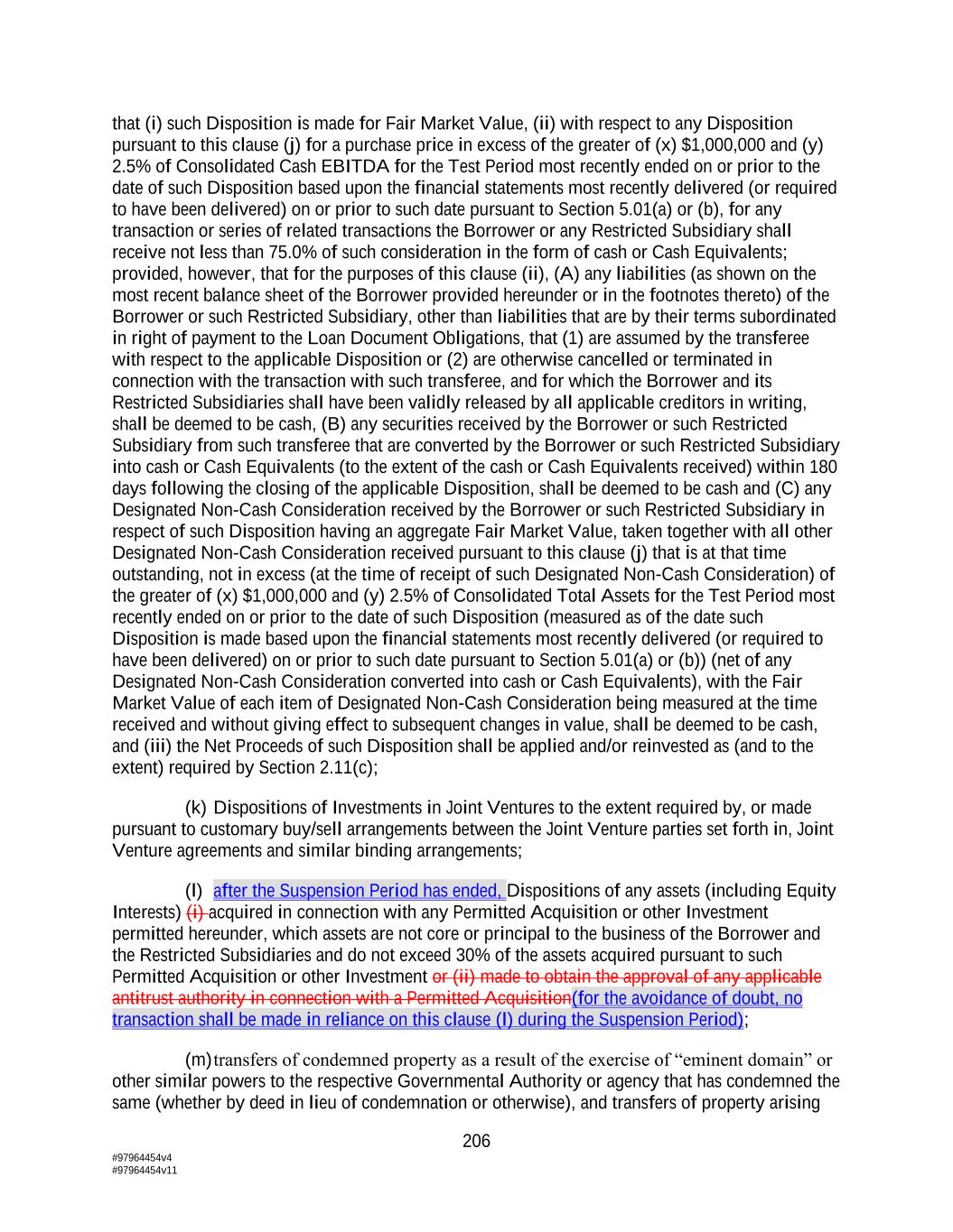206 #97964454v4 #97964454v11 that (i) such Disposition is made for Fair Market Value, (ii) with respect to any Disposition pursuant to this clause (j) for a purchase price in excess of the greater of (x) $1,000,000 and (y) 2.5% of Consolidated Cash EBITDA for the Test Period most recently ended on or prior to the date of such Disposition based upon the financial statements most recently delivered (or required to have been delivered) on or prior to such date pursuant to Section 5.01(a) or (b), for any transaction or series of related transactions the Borrower or any Restricted Subsidiary shall receive not less than 75.0% of such consideration in the form of cash or Cash Equivalents; provided, however, that for the purposes of this clause (ii), (A) any liabilities (as shown on the most recent balance sheet of the Borrower provided hereunder or in the footnotes thereto) of the Borrower or such Restricted Subsidiary, other than liabilities that are by their terms subordinated in right of payment to the Loan Document Obligations, that (1) are assumed by the transferee with respect to the applicable Disposition or (2) are otherwise cancelled or terminated in connection with the transaction with such transferee, and for which the Borrower and its Restricted Subsidiaries shall have been validly released by all applicable creditors in writing, shall be deemed to be cash, (B) any securities received by the Borrower or such Restricted Subsidiary from such transferee that are converted by the Borrower or such Restricted Subsidiary into cash or Cash Equivalents (to the extent of the cash or Cash Equivalents received) within 180 days following the closing of the applicable Disposition, shall be deemed to be cash and (C) any Designated Non-Cash Consideration received by the Borrower or such Restricted Subsidiary in respect of such Disposition having an aggregate Fair Market Value, taken together with all other Designated Non-Cash Consideration received pursuant to this clause (j) that is at that time outstanding, not in excess (at the time of receipt of such Designated Non-Cash Consideration) of the greater of (x) $1,000,000 and (y) 2.5% of Consolidated Total Assets for the Test Period most recently ended on or prior to the date of such Disposition (measured as of the date such Disposition is made based upon the financial statements most recently delivered (or required to have been delivered) on or prior to such date pursuant to Section 5.01(a) or (b)) (net of any Designated Non-Cash Consideration converted into cash or Cash Equivalents), with the Fair Market Value of each item of Designated Non-Cash Consideration being measured at the time received and without giving effect to subsequent changes in value, shall be deemed to be cash, and (iii) the Net Proceeds of such Disposition shall be applied and/or reinvested as (and to the extent) required by Section 2.11(c); (k) Dispositions of Investments in Joint Ventures to the extent required by, or made pursuant to customary buy/sell arrangements between the Joint Venture parties set forth in, Joint Venture agreements and similar binding arrangements; (l) after the Suspension Period has ended, Dispositions of any assets (including Equity Interests) (i) acquired in connection with any Permitted Acquisition or other Investment permitted hereunder, which assets are not core or principal to the business of the Borrower and the Restricted Subsidiaries and do not exceed 30% of the assets acquired pursuant to such Permitted Acquisition or other Investment or (ii) made to obtain the approval of any applicable antitrust authority in connection with a Permitted Acquisition(for the avoidance of doubt, no transaction shall be made in reliance on this clause (l) during the Suspension Period); (m) transfers of condemned property as a result of the exercise of “eminent domain” or other similar powers to the respective Governmental Authority or agency that has condemned the same (whether by deed in lieu of condemnation or otherwise), and transfers of property arising