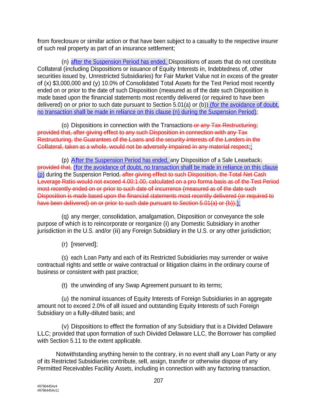 207 #97964454v4 #97964454v11 from foreclosure or similar action or that have been subject to a casualty to the respective insurer of such real property as part of an insurance settlement; (n) after the Suspension Period has ended, Dispositions of assets that do not constitute Collateral (including Dispositions or issuance of Equity Interests in, Indebtedness of, other securities issued by, Unrestricted Subsidiaries) for Fair Market Value not in excess of the greater of (x) $3,000,000 and (y) 10.0% of Consolidated Total Assets for the Test Period most recently ended on or prior to the date of such Disposition (measured as of the date such Disposition is made based upon the financial statements most recently delivered (or required to have been delivered) on or prior to such date pursuant to Section 5.01(a) or (b)) (for the avoidance of doubt, no transaction shall be made in reliance on this clause (n) during the Suspension Period); (o) Dispositions in connection with the Transactions or any Tax Restructuring; provided that, after giving effect to any such Disposition in connection with any Tax Restructuring, the Guarantees of the Loans and the security interests of the Lenders in the Collateral, taken as a whole, would not be adversely impaired in any material respect;; (p) After the Suspension Period has ended, any Disposition of a Sale Leaseback; provided that, (for the avoidance of doubt, no transaction shall be made in reliance on this clause (p) during the Suspension Period, after giving effect to such Disposition, the Total Net Cash Leverage Ratio would not exceed 4.00:1.00, calculated on a pro forma basis as of the Test Period most recently ended on or prior to such date of incurrence (measured as of the date such Disposition is made based upon the financial statements most recently delivered (or required to have been delivered) on or prior to such date pursuant to Section 5.01(a) or (b));); (q) any merger, consolidation, amalgamation, Disposition or conveyance the sole purpose of which is to reincorporate or reorganize (i) any Domestic Subsidiary in another jurisdiction in the U.S. and/or (ii) any Foreign Subsidiary in the U.S. or any other jurisdiction; (r) [reserved]; (s) each Loan Party and each of its Restricted Subsidiaries may surrender or waive contractual rights and settle or waive contractual or litigation claims in the ordinary course of business or consistent with past practice; (t) the unwinding of any Swap Agreement pursuant to its terms; (u) the nominal issuances of Equity Interests of Foreign Subsidiaries in an aggregate amount not to exceed 2.0% of all issued and outstanding Equity Interests of such Foreign Subsidiary on a fully-diluted basis; and (v) Dispositions to effect the formation of any Subsidiary that is a Divided Delaware LLC; provided that upon formation of such Divided Delaware LLC, the Borrower has complied with Section 5.11 to the extent applicable. Notwithstanding anything herein to the contrary, in no event shall any Loan Party or any of its Restricted Subsidiaries contribute, sell, assign, transfer or otherwise dispose of any Permitted Receivables Facility Assets, including in connection with any factoring transaction,