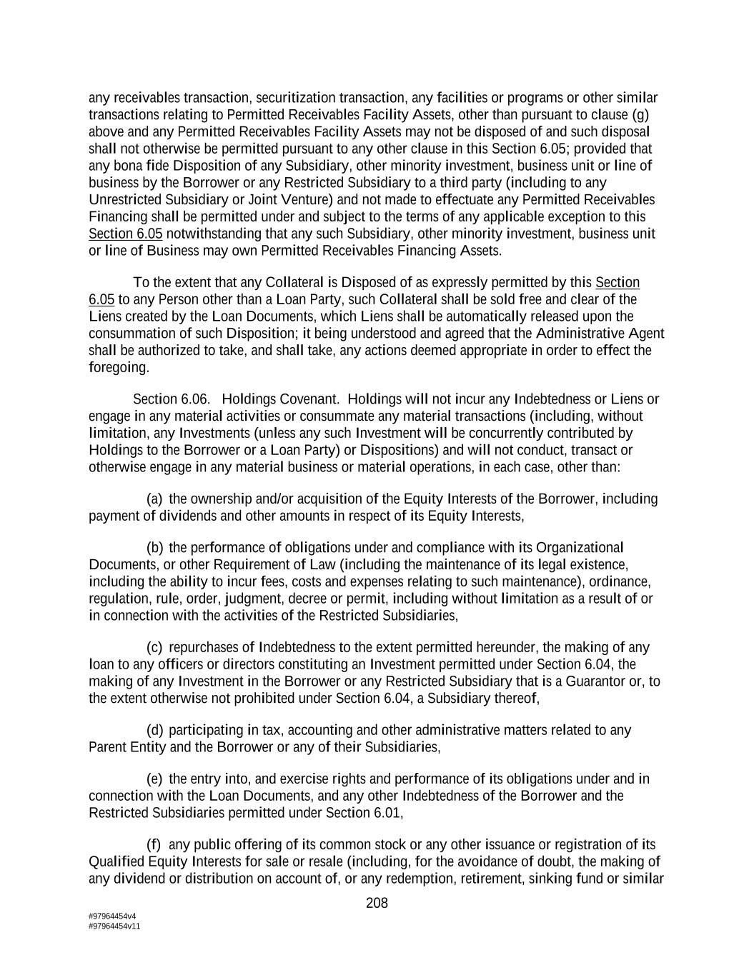 208 #97964454v4 #97964454v11 any receivables transaction, securitization transaction, any facilities or programs or other similar transactions relating to Permitted Receivables Facility Assets, other than pursuant to clause (g) above and any Permitted Receivables Facility Assets may not be disposed of and such disposal shall not otherwise be permitted pursuant to any other clause in this Section 6.05; provided that any bona fide Disposition of any Subsidiary, other minority investment, business unit or line of business by the Borrower or any Restricted Subsidiary to a third party (including to any Unrestricted Subsidiary or Joint Venture) and not made to effectuate any Permitted Receivables Financing shall be permitted under and subject to the terms of any applicable exception to this Section 6.05 notwithstanding that any such Subsidiary, other minority investment, business unit or line of Business may own Permitted Receivables Financing Assets. To the extent that any Collateral is Disposed of as expressly permitted by this Section 6.05 to any Person other than a Loan Party, such Collateral shall be sold free and clear of the Liens created by the Loan Documents, which Liens shall be automatically released upon the consummation of such Disposition; it being understood and agreed that the Administrative Agent shall be authorized to take, and shall take, any actions deemed appropriate in order to effect the foregoing. Section 6.06. Holdings Covenant. Holdings will not incur any Indebtedness or Liens or engage in any material activities or consummate any material transactions (including, without limitation, any Investments (unless any such Investment will be concurrently contributed by Holdings to the Borrower or a Loan Party) or Dispositions) and will not conduct, transact or otherwise engage in any material business or material operations, in each case, other than: (a) the ownership and/or acquisition of the Equity Interests of the Borrower, including payment of dividends and other amounts in respect of its Equity Interests, (b) the performance of obligations under and compliance with its Organizational Documents, or other Requirement of Law (including the maintenance of its legal existence, including the ability to incur fees, costs and expenses relating to such maintenance), ordinance, regulation, rule, order, judgment, decree or permit, including without limitation as a result of or in connection with the activities of the Restricted Subsidiaries, (c) repurchases of Indebtedness to the extent permitted hereunder, the making of any loan to any officers or directors constituting an Investment permitted under Section 6.04, the making of any Investment in the Borrower or any Restricted Subsidiary that is a Guarantor or, to the extent otherwise not prohibited under Section 6.04, a Subsidiary thereof, (d) participating in tax, accounting and other administrative matters related to any Parent Entity and the Borrower or any of their Subsidiaries, (e) the entry into, and exercise rights and performance of its obligations under and in connection with the Loan Documents, and any other Indebtedness of the Borrower and the Restricted Subsidiaries permitted under Section 6.01, (f) any public offering of its common stock or any other issuance or registration of its Qualified Equity Interests for sale or resale (including, for the avoidance of doubt, the making of any dividend or distribution on account of, or any redemption, retirement, sinking fund or similar
