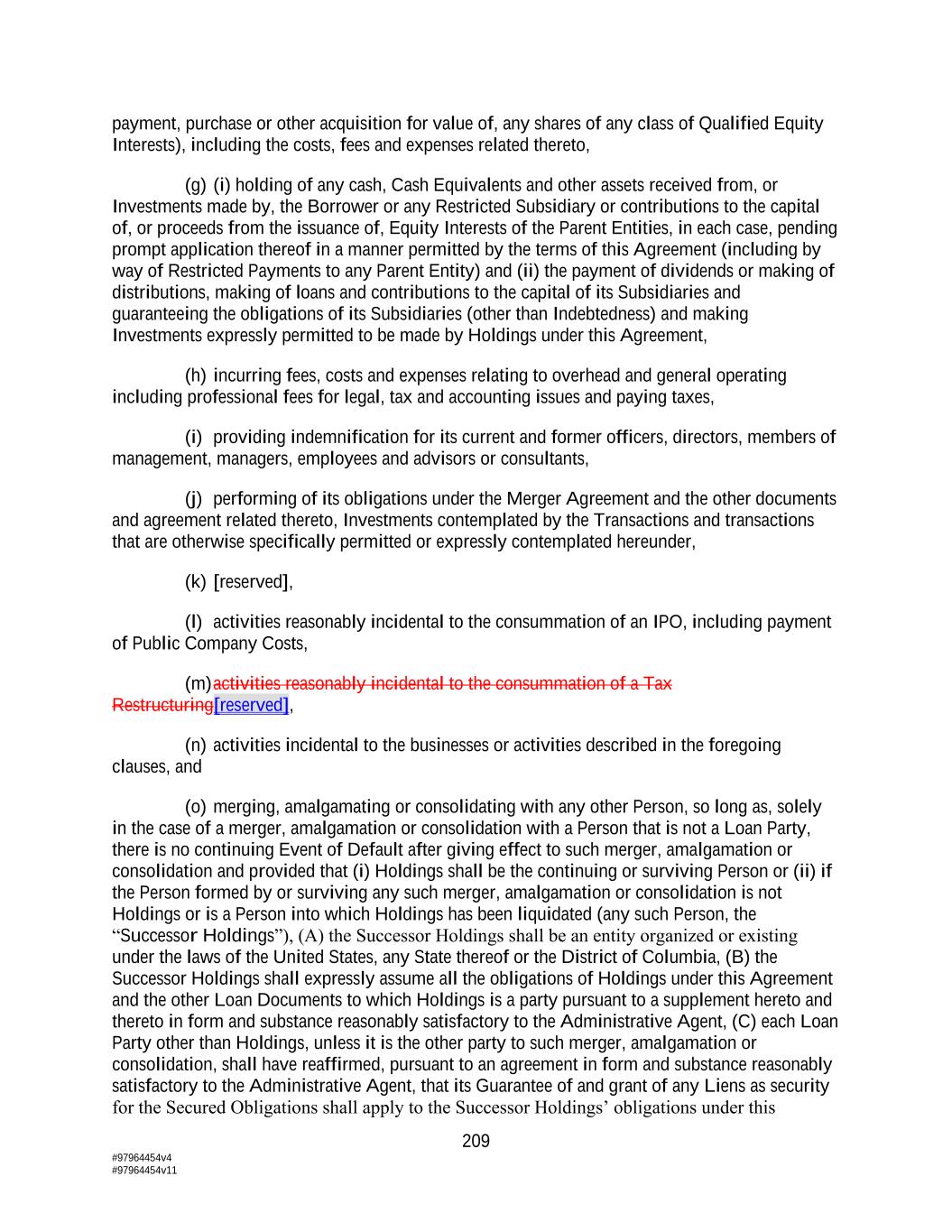 209 #97964454v4 #97964454v11 payment, purchase or other acquisition for value of, any shares of any class of Qualified Equity Interests), including the costs, fees and expenses related thereto, (g) (i) holding of any cash, Cash Equivalents and other assets received from, or Investments made by, the Borrower or any Restricted Subsidiary or contributions to the capital of, or proceeds from the issuance of, Equity Interests of the Parent Entities, in each case, pending prompt application thereof in a manner permitted by the terms of this Agreement (including by way of Restricted Payments to any Parent Entity) and (ii) the payment of dividends or making of distributions, making of loans and contributions to the capital of its Subsidiaries and guaranteeing the obligations of its Subsidiaries (other than Indebtedness) and making Investments expressly permitted to be made by Holdings under this Agreement, (h) incurring fees, costs and expenses relating to overhead and general operating including professional fees for legal, tax and accounting issues and paying taxes, (i) providing indemnification for its current and former officers, directors, members of management, managers, employees and advisors or consultants, (j) performing of its obligations under the Merger Agreement and the other documents and agreement related thereto, Investments contemplated by the Transactions and transactions that are otherwise specifically permitted or expressly contemplated hereunder, (k) [reserved], (l) activities reasonably incidental to the consummation of an IPO, including payment of Public Company Costs, (m) activities reasonably incidental to the consummation of a Tax Restructuring[reserved], (n) activities incidental to the businesses or activities described in the foregoing clauses, and (o) merging, amalgamating or consolidating with any other Person, so long as, solely in the case of a merger, amalgamation or consolidation with a Person that is not a Loan Party, there is no continuing Event of Default after giving effect to such merger, amalgamation or consolidation and provided that (i) Holdings shall be the continuing or surviving Person or (ii) if the Person formed by or surviving any such merger, amalgamation or consolidation is not Holdings or is a Person into which Holdings has been liquidated (any such Person, the “Successor Holdings”), (A) the Successor Holdings shall be an entity organized or existing under the laws of the United States, any State thereof or the District of Columbia, (B) the Successor Holdings shall expressly assume all the obligations of Holdings under this Agreement and the other Loan Documents to which Holdings is a party pursuant to a supplement hereto and thereto in form and substance reasonably satisfactory to the Administrative Agent, (C) each Loan Party other than Holdings, unless it is the other party to such merger, amalgamation or consolidation, shall have reaffirmed, pursuant to an agreement in form and substance reasonably satisfactory to the Administrative Agent, that its Guarantee of and grant of any Liens as security for the Secured Obligations shall apply to the Successor Holdings’ obligations under this
