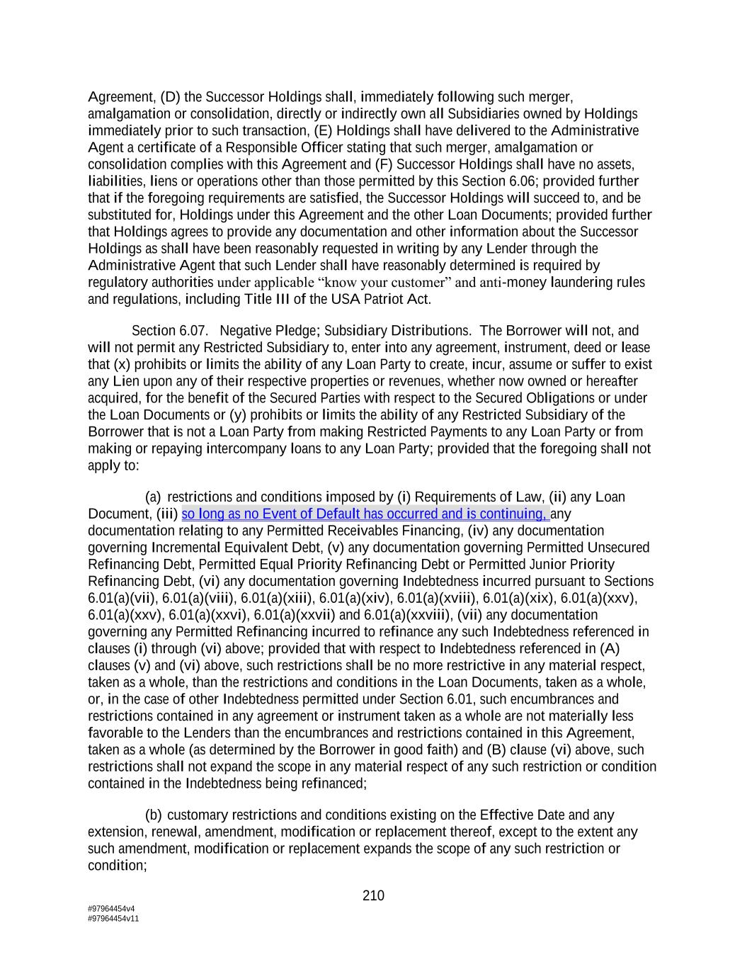 210 #97964454v4 #97964454v11 Agreement, (D) the Successor Holdings shall, immediately following such merger, amalgamation or consolidation, directly or indirectly own all Subsidiaries owned by Holdings immediately prior to such transaction, (E) Holdings shall have delivered to the Administrative Agent a certificate of a Responsible Officer stating that such merger, amalgamation or consolidation complies with this Agreement and (F) Successor Holdings shall have no assets, liabilities, liens or operations other than those permitted by this Section 6.06; provided further that if the foregoing requirements are satisfied, the Successor Holdings will succeed to, and be substituted for, Holdings under this Agreement and the other Loan Documents; provided further that Holdings agrees to provide any documentation and other information about the Successor Holdings as shall have been reasonably requested in writing by any Lender through the Administrative Agent that such Lender shall have reasonably determined is required by regulatory authorities under applicable “know your customer” and anti-money laundering rules and regulations, including Title III of the USA Patriot Act. Section 6.07. Negative Pledge; Subsidiary Distributions. The Borrower will not, and will not permit any Restricted Subsidiary to, enter into any agreement, instrument, deed or lease that (x) prohibits or limits the ability of any Loan Party to create, incur, assume or suffer to exist any Lien upon any of their respective properties or revenues, whether now owned or hereafter acquired, for the benefit of the Secured Parties with respect to the Secured Obligations or under the Loan Documents or (y) prohibits or limits the ability of any Restricted Subsidiary of the Borrower that is not a Loan Party from making Restricted Payments to any Loan Party or from making or repaying intercompany loans to any Loan Party; provided that the foregoing shall not apply to: (a) restrictions and conditions imposed by (i) Requirements of Law, (ii) any Loan Document, (iii) so long as no Event of Default has occurred and is continuing, any documentation relating to any Permitted Receivables Financing, (iv) any documentation governing Incremental Equivalent Debt, (v) any documentation governing Permitted Unsecured Refinancing Debt, Permitted Equal Priority Refinancing Debt or Permitted Junior Priority Refinancing Debt, (vi) any documentation governing Indebtedness incurred pursuant to Sections 6.01(a)(vii), 6.01(a)(viii), 6.01(a)(xiii), 6.01(a)(xiv), 6.01(a)(xviii), 6.01(a)(xix), 6.01(a)(xxv), 6.01(a)(xxv), 6.01(a)(xxvi), 6.01(a)(xxvii) and 6.01(a)(xxviii), (vii) any documentation governing any Permitted Refinancing incurred to refinance any such Indebtedness referenced in clauses (i) through (vi) above; provided that with respect to Indebtedness referenced in (A) clauses (v) and (vi) above, such restrictions shall be no more restrictive in any material respect, taken as a whole, than the restrictions and conditions in the Loan Documents, taken as a whole, or, in the case of other Indebtedness permitted under Section 6.01, such encumbrances and restrictions contained in any agreement or instrument taken as a whole are not materially less favorable to the Lenders than the encumbrances and restrictions contained in this Agreement, taken as a whole (as determined by the Borrower in good faith) and (B) clause (vi) above, such restrictions shall not expand the scope in any material respect of any such restriction or condition contained in the Indebtedness being refinanced; (b) customary restrictions and conditions existing on the Effective Date and any extension, renewal, amendment, modification or replacement thereof, except to the extent any such amendment, modification or replacement expands the scope of any such restriction or condition;