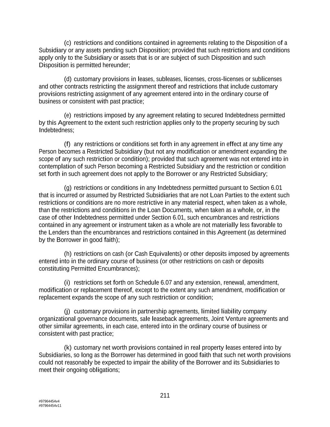 211 #97964454v4 #97964454v11 (c) restrictions and conditions contained in agreements relating to the Disposition of a Subsidiary or any assets pending such Disposition; provided that such restrictions and conditions apply only to the Subsidiary or assets that is or are subject of such Disposition and such Disposition is permitted hereunder; (d) customary provisions in leases, subleases, licenses, cross-licenses or sublicenses and other contracts restricting the assignment thereof and restrictions that include customary provisions restricting assignment of any agreement entered into in the ordinary course of business or consistent with past practice; (e) restrictions imposed by any agreement relating to secured Indebtedness permitted by this Agreement to the extent such restriction applies only to the property securing by such Indebtedness; (f) any restrictions or conditions set forth in any agreement in effect at any time any Person becomes a Restricted Subsidiary (but not any modification or amendment expanding the scope of any such restriction or condition); provided that such agreement was not entered into in contemplation of such Person becoming a Restricted Subsidiary and the restriction or condition set forth in such agreement does not apply to the Borrower or any Restricted Subsidiary; (g) restrictions or conditions in any Indebtedness permitted pursuant to Section 6.01 that is incurred or assumed by Restricted Subsidiaries that are not Loan Parties to the extent such restrictions or conditions are no more restrictive in any material respect, when taken as a whole, than the restrictions and conditions in the Loan Documents, when taken as a whole, or, in the case of other Indebtedness permitted under Section 6.01, such encumbrances and restrictions contained in any agreement or instrument taken as a whole are not materially less favorable to the Lenders than the encumbrances and restrictions contained in this Agreement (as determined by the Borrower in good faith); (h) restrictions on cash (or Cash Equivalents) or other deposits imposed by agreements entered into in the ordinary course of business (or other restrictions on cash or deposits constituting Permitted Encumbrances); (i) restrictions set forth on Schedule 6.07 and any extension, renewal, amendment, modification or replacement thereof, except to the extent any such amendment, modification or replacement expands the scope of any such restriction or condition; (j) customary provisions in partnership agreements, limited liability company organizational governance documents, sale leaseback agreements, Joint Venture agreements and other similar agreements, in each case, entered into in the ordinary course of business or consistent with past practice; (k) customary net worth provisions contained in real property leases entered into by Subsidiaries, so long as the Borrower has determined in good faith that such net worth provisions could not reasonably be expected to impair the ability of the Borrower and its Subsidiaries to meet their ongoing obligations;