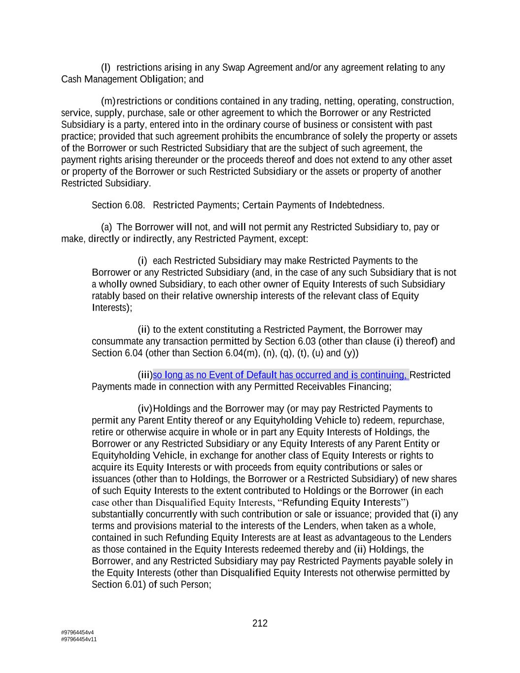 212 #97964454v4 #97964454v11 (l) restrictions arising in any Swap Agreement and/or any agreement relating to any Cash Management Obligation; and (m) restrictions or conditions contained in any trading, netting, operating, construction, service, supply, purchase, sale or other agreement to which the Borrower or any Restricted Subsidiary is a party, entered into in the ordinary course of business or consistent with past practice; provided that such agreement prohibits the encumbrance of solely the property or assets of the Borrower or such Restricted Subsidiary that are the subject of such agreement, the payment rights arising thereunder or the proceeds thereof and does not extend to any other asset or property of the Borrower or such Restricted Subsidiary or the assets or property of another Restricted Subsidiary. Section 6.08. Restricted Payments; Certain Payments of Indebtedness. (a) The Borrower will not, and will not permit any Restricted Subsidiary to, pay or make, directly or indirectly, any Restricted Payment, except: (i) each Restricted Subsidiary may make Restricted Payments to the Borrower or any Restricted Subsidiary (and, in the case of any such Subsidiary that is not a wholly owned Subsidiary, to each other owner of Equity Interests of such Subsidiary ratably based on their relative ownership interests of the relevant class of Equity Interests); (ii) to the extent constituting a Restricted Payment, the Borrower may consummate any transaction permitted by Section 6.03 (other than clause (i) thereof) and Section 6.04 (other than Section 6.04(m), (n), (q), (t), (u) and (y)) (iii)so long as no Event of Default has occurred and is continuing, Restricted Payments made in connection with any Permitted Receivables Financing; (iv) Holdings and the Borrower may (or may pay Restricted Payments to permit any Parent Entity thereof or any Equityholding Vehicle to) redeem, repurchase, retire or otherwise acquire in whole or in part any Equity Interests of Holdings, the Borrower or any Restricted Subsidiary or any Equity Interests of any Parent Entity or Equityholding Vehicle, in exchange for another class of Equity Interests or rights to acquire its Equity Interests or with proceeds from equity contributions or sales or issuances (other than to Holdings, the Borrower or a Restricted Subsidiary) of new shares of such Equity Interests to the extent contributed to Holdings or the Borrower (in each case other than Disqualified Equity Interests, “Refunding Equity Interests”) substantially concurrently with such contribution or sale or issuance; provided that (i) any terms and provisions material to the interests of the Lenders, when taken as a whole, contained in such Refunding Equity Interests are at least as advantageous to the Lenders as those contained in the Equity Interests redeemed thereby and (ii) Holdings, the Borrower, and any Restricted Subsidiary may pay Restricted Payments payable solely in the Equity Interests (other than Disqualified Equity Interests not otherwise permitted by Section 6.01) of such Person;
