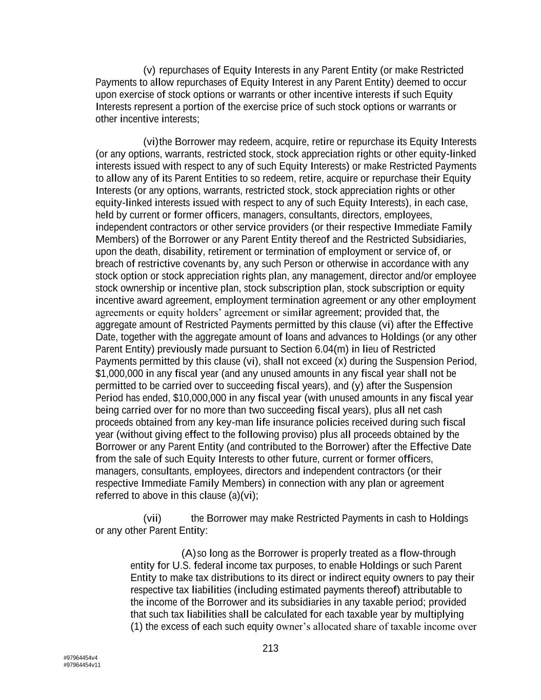 213 #97964454v4 #97964454v11 (v) repurchases of Equity Interests in any Parent Entity (or make Restricted Payments to allow repurchases of Equity Interest in any Parent Entity) deemed to occur upon exercise of stock options or warrants or other incentive interests if such Equity Interests represent a portion of the exercise price of such stock options or warrants or other incentive interests; (vi) the Borrower may redeem, acquire, retire or repurchase its Equity Interests (or any options, warrants, restricted stock, stock appreciation rights or other equity-linked interests issued with respect to any of such Equity Interests) or make Restricted Payments to allow any of its Parent Entities to so redeem, retire, acquire or repurchase their Equity Interests (or any options, warrants, restricted stock, stock appreciation rights or other equity-linked interests issued with respect to any of such Equity Interests), in each case, held by current or former officers, managers, consultants, directors, employees, independent contractors or other service providers (or their respective Immediate Family Members) of the Borrower or any Parent Entity thereof and the Restricted Subsidiaries, upon the death, disability, retirement or termination of employment or service of, or breach of restrictive covenants by, any such Person or otherwise in accordance with any stock option or stock appreciation rights plan, any management, director and/or employee stock ownership or incentive plan, stock subscription plan, stock subscription or equity incentive award agreement, employment termination agreement or any other employment agreements or equity holders’ agreement or similar agreement; provided that, the aggregate amount of Restricted Payments permitted by this clause (vi) after the Effective Date, together with the aggregate amount of loans and advances to Holdings (or any other Parent Entity) previously made pursuant to Section 6.04(m) in lieu of Restricted Payments permitted by this clause (vi), shall not exceed (x) during the Suspension Period, $1,000,000 in any fiscal year (and any unused amounts in any fiscal year shall not be permitted to be carried over to succeeding fiscal years), and (y) after the Suspension Period has ended, $10,000,000 in any fiscal year (with unused amounts in any fiscal year being carried over for no more than two succeeding fiscal years), plus all net cash proceeds obtained from any key-man life insurance policies received during such fiscal year (without giving effect to the following proviso) plus all proceeds obtained by the Borrower or any Parent Entity (and contributed to the Borrower) after the Effective Date from the sale of such Equity Interests to other future, current or former officers, managers, consultants, employees, directors and independent contractors (or their respective Immediate Family Members) in connection with any plan or agreement referred to above in this clause (a)(vi); (vii) the Borrower may make Restricted Payments in cash to Holdings or any other Parent Entity: (A) so long as the Borrower is properly treated as a flow-through entity for U.S. federal income tax purposes, to enable Holdings or such Parent Entity to make tax distributions to its direct or indirect equity owners to pay their respective tax liabilities (including estimated payments thereof) attributable to the income of the Borrower and its subsidiaries in any taxable period; provided that such tax liabilities shall be calculated for each taxable year by multiplying (1) the excess of each such equity owner’s allocated share of taxable income over
