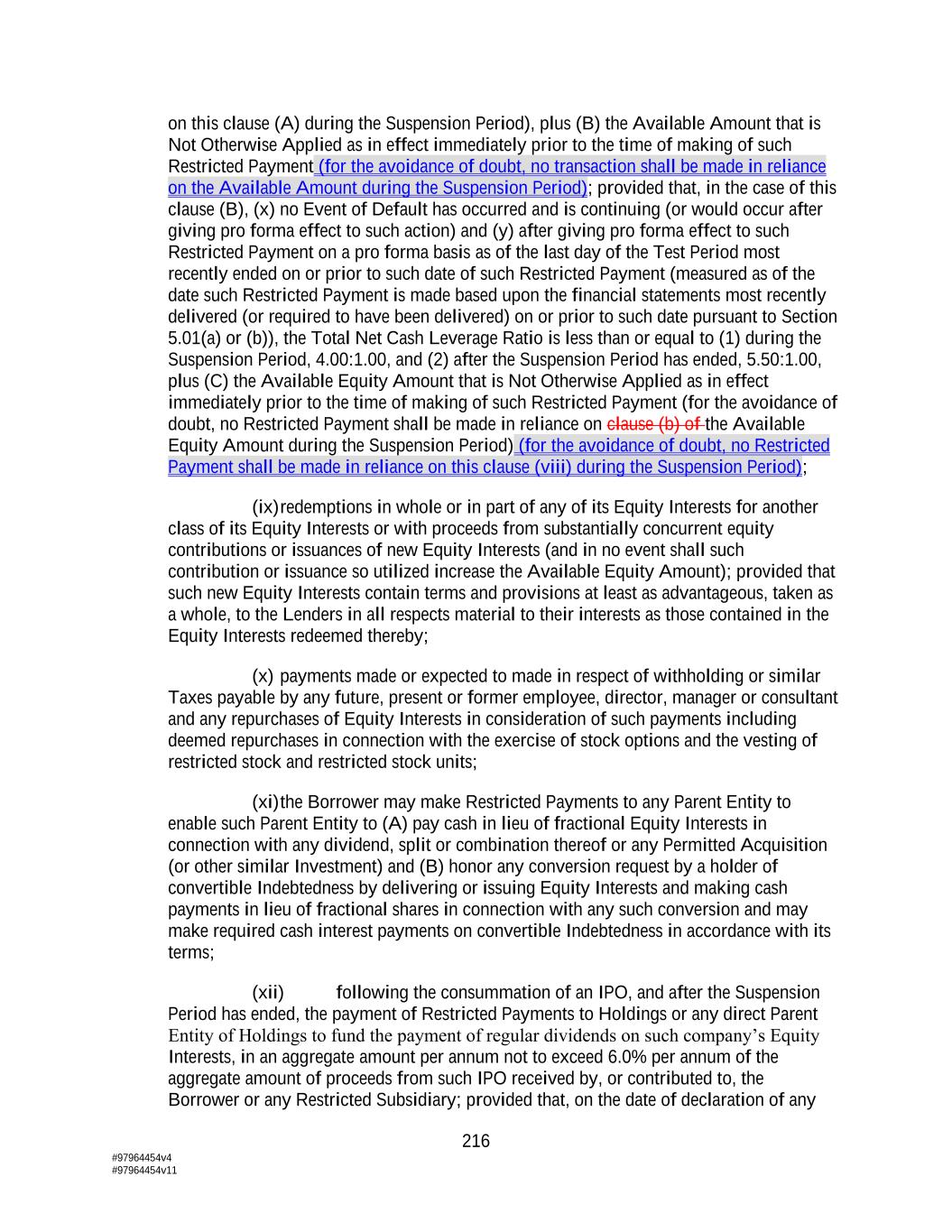 216 #97964454v4 #97964454v11 on this clause (A) during the Suspension Period), plus (B) the Available Amount that is Not Otherwise Applied as in effect immediately prior to the time of making of such Restricted Payment (for the avoidance of doubt, no transaction shall be made in reliance on the Available Amount during the Suspension Period); provided that, in the case of this clause (B), (x) no Event of Default has occurred and is continuing (or would occur after giving pro forma effect to such action) and (y) after giving pro forma effect to such Restricted Payment on a pro forma basis as of the last day of the Test Period most recently ended on or prior to such date of such Restricted Payment (measured as of the date such Restricted Payment is made based upon the financial statements most recently delivered (or required to have been delivered) on or prior to such date pursuant to Section 5.01(a) or (b)), the Total Net Cash Leverage Ratio is less than or equal to (1) during the Suspension Period, 4.00:1.00, and (2) after the Suspension Period has ended, 5.50:1.00, plus (C) the Available Equity Amount that is Not Otherwise Applied as in effect immediately prior to the time of making of such Restricted Payment (for the avoidance of doubt, no Restricted Payment shall be made in reliance on clause (b) of the Available Equity Amount during the Suspension Period) (for the avoidance of doubt, no Restricted Payment shall be made in reliance on this clause (viii) during the Suspension Period); (ix) redemptions in whole or in part of any of its Equity Interests for another class of its Equity Interests or with proceeds from substantially concurrent equity contributions or issuances of new Equity Interests (and in no event shall such contribution or issuance so utilized increase the Available Equity Amount); provided that such new Equity Interests contain terms and provisions at least as advantageous, taken as a whole, to the Lenders in all respects material to their interests as those contained in the Equity Interests redeemed thereby; (x) payments made or expected to made in respect of withholding or similar Taxes payable by any future, present or former employee, director, manager or consultant and any repurchases of Equity Interests in consideration of such payments including deemed repurchases in connection with the exercise of stock options and the vesting of restricted stock and restricted stock units; (xi) the Borrower may make Restricted Payments to any Parent Entity to enable such Parent Entity to (A) pay cash in lieu of fractional Equity Interests in connection with any dividend, split or combination thereof or any Permitted Acquisition (or other similar Investment) and (B) honor any conversion request by a holder of convertible Indebtedness by delivering or issuing Equity Interests and making cash payments in lieu of fractional shares in connection with any such conversion and may make required cash interest payments on convertible Indebtedness in accordance with its terms; (xii) following the consummation of an IPO, and after the Suspension Period has ended, the payment of Restricted Payments to Holdings or any direct Parent Entity of Holdings to fund the payment of regular dividends on such company’s Equity Interests, in an aggregate amount per annum not to exceed 6.0% per annum of the aggregate amount of proceeds from such IPO received by, or contributed to, the Borrower or any Restricted Subsidiary; provided that, on the date of declaration of any