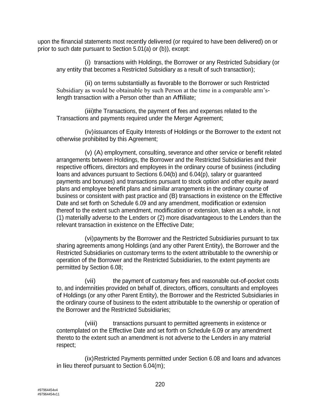 220 #97964454v4 #97964454v11 upon the financial statements most recently delivered (or required to have been delivered) on or prior to such date pursuant to Section 5.01(a) or (b)), except: (i) transactions with Holdings, the Borrower or any Restricted Subsidiary (or any entity that becomes a Restricted Subsidiary as a result of such transaction); (ii) on terms substantially as favorable to the Borrower or such Restricted Subsidiary as would be obtainable by such Person at the time in a comparable arm’s- length transaction with a Person other than an Affiliate; (iii)the Transactions, the payment of fees and expenses related to the Transactions and payments required under the Merger Agreement; (iv) issuances of Equity Interests of Holdings or the Borrower to the extent not otherwise prohibited by this Agreement; (v) (A) employment, consulting, severance and other service or benefit related arrangements between Holdings, the Borrower and the Restricted Subsidiaries and their respective officers, directors and employees in the ordinary course of business (including loans and advances pursuant to Sections 6.04(b) and 6.04(p), salary or guaranteed payments and bonuses) and transactions pursuant to stock option and other equity award plans and employee benefit plans and similar arrangements in the ordinary course of business or consistent with past practice and (B) transactions in existence on the Effective Date and set forth on Schedule 6.09 and any amendment, modification or extension thereof to the extent such amendment, modification or extension, taken as a whole, is not (1) materially adverse to the Lenders or (2) more disadvantageous to the Lenders than the relevant transaction in existence on the Effective Date; (vi) payments by the Borrower and the Restricted Subsidiaries pursuant to tax sharing agreements among Holdings (and any other Parent Entity), the Borrower and the Restricted Subsidiaries on customary terms to the extent attributable to the ownership or operation of the Borrower and the Restricted Subsidiaries, to the extent payments are permitted by Section 6.08; (vii) the payment of customary fees and reasonable out-of-pocket costs to, and indemnities provided on behalf of, directors, officers, consultants and employees of Holdings (or any other Parent Entity), the Borrower and the Restricted Subsidiaries in the ordinary course of business to the extent attributable to the ownership or operation of the Borrower and the Restricted Subsidiaries; (viii) transactions pursuant to permitted agreements in existence or contemplated on the Effective Date and set forth on Schedule 6.09 or any amendment thereto to the extent such an amendment is not adverse to the Lenders in any material respect; (ix) Restricted Payments permitted under Section 6.08 and loans and advances in lieu thereof pursuant to Section 6.04(m);