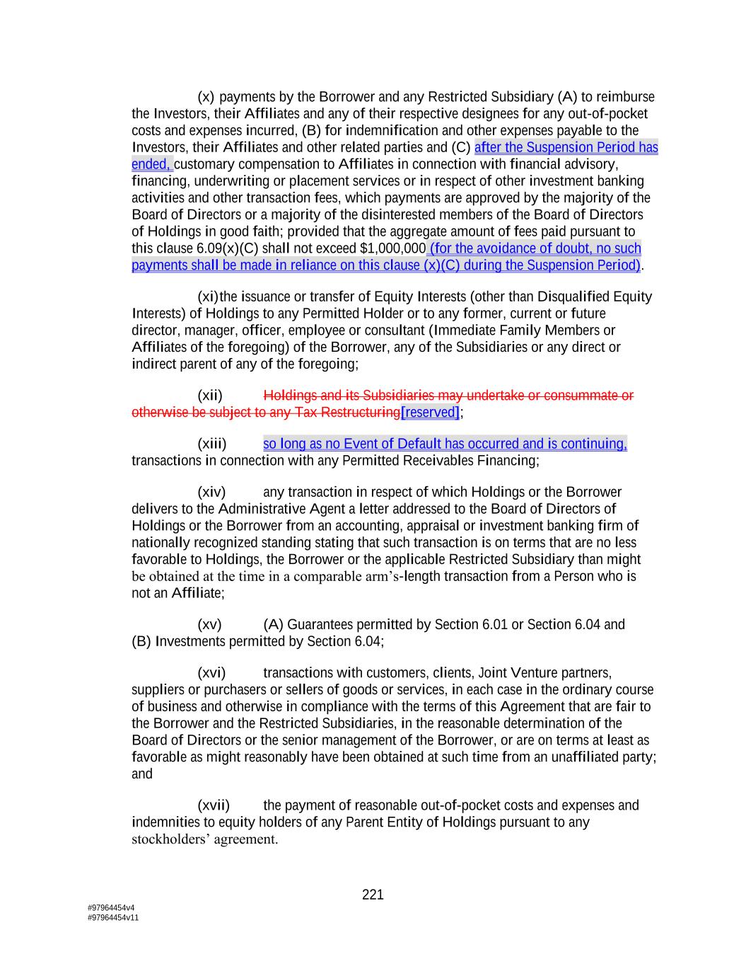 221 #97964454v4 #97964454v11 (x) payments by the Borrower and any Restricted Subsidiary (A) to reimburse the Investors, their Affiliates and any of their respective designees for any out-of-pocket costs and expenses incurred, (B) for indemnification and other expenses payable to the Investors, their Affiliates and other related parties and (C) after the Suspension Period has ended, customary compensation to Affiliates in connection with financial advisory, financing, underwriting or placement services or in respect of other investment banking activities and other transaction fees, which payments are approved by the majority of the Board of Directors or a majority of the disinterested members of the Board of Directors of Holdings in good faith; provided that the aggregate amount of fees paid pursuant to this clause 6.09(x)(C) shall not exceed $1,000,000 (for the avoidance of doubt, no such payments shall be made in reliance on this clause (x)(C) during the Suspension Period). (xi) the issuance or transfer of Equity Interests (other than Disqualified Equity Interests) of Holdings to any Permitted Holder or to any former, current or future director, manager, officer, employee or consultant (Immediate Family Members or Affiliates of the foregoing) of the Borrower, any of the Subsidiaries or any direct or indirect parent of any of the foregoing; (xii) Holdings and its Subsidiaries may undertake or consummate or otherwise be subject to any Tax Restructuring[reserved]; (xiii) so long as no Event of Default has occurred and is continuing, transactions in connection with any Permitted Receivables Financing; (xiv) any transaction in respect of which Holdings or the Borrower delivers to the Administrative Agent a letter addressed to the Board of Directors of Holdings or the Borrower from an accounting, appraisal or investment banking firm of nationally recognized standing stating that such transaction is on terms that are no less favorable to Holdings, the Borrower or the applicable Restricted Subsidiary than might be obtained at the time in a comparable arm’s-length transaction from a Person who is not an Affiliate; (xv) (A) Guarantees permitted by Section 6.01 or Section 6.04 and (B) Investments permitted by Section 6.04; (xvi) transactions with customers, clients, Joint Venture partners, suppliers or purchasers or sellers of goods or services, in each case in the ordinary course of business and otherwise in compliance with the terms of this Agreement that are fair to the Borrower and the Restricted Subsidiaries, in the reasonable determination of the Board of Directors or the senior management of the Borrower, or are on terms at least as favorable as might reasonably have been obtained at such time from an unaffiliated party; and (xvii) the payment of reasonable out-of-pocket costs and expenses and indemnities to equity holders of any Parent Entity of Holdings pursuant to any stockholders’ agreement.
