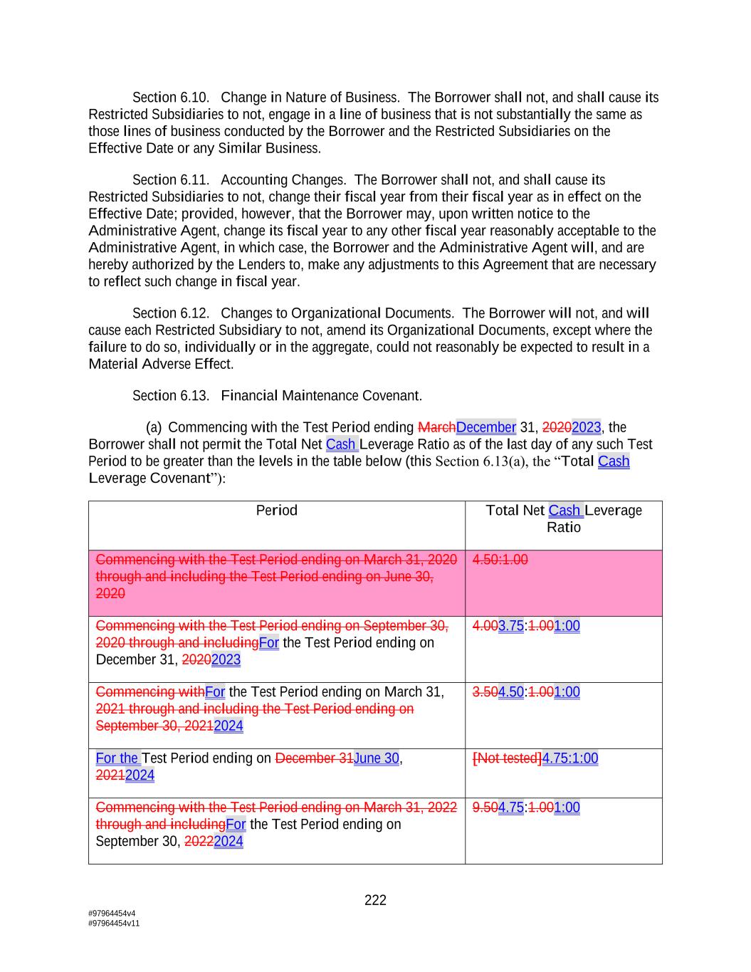 222 #97964454v4 #97964454v11 Section 6.10. Change in Nature of Business. The Borrower shall not, and shall cause its Restricted Subsidiaries to not, engage in a line of business that is not substantially the same as those lines of business conducted by the Borrower and the Restricted Subsidiaries on the Effective Date or any Similar Business. Section 6.11. Accounting Changes. The Borrower shall not, and shall cause its Restricted Subsidiaries to not, change their fiscal year from their fiscal year as in effect on the Effective Date; provided, however, that the Borrower may, upon written notice to the Administrative Agent, change its fiscal year to any other fiscal year reasonably acceptable to the Administrative Agent, in which case, the Borrower and the Administrative Agent will, and are hereby authorized by the Lenders to, make any adjustments to this Agreement that are necessary to reflect such change in fiscal year. Section 6.12. Changes to Organizational Documents. The Borrower will not, and will cause each Restricted Subsidiary to not, amend its Organizational Documents, except where the failure to do so, individually or in the aggregate, could not reasonably be expected to result in a Material Adverse Effect. Section 6.13. Financial Maintenance Covenant. (a) Commencing with the Test Period ending MarchDecember 31, 20202023, the Borrower shall not permit the Total Net Cash Leverage Ratio as of the last day of any such Test Period to be greater than the levels in the table below (this Section 6.13(a), the “Total Cash Leverage Covenant”): Period Total Net Cash Leverage Ratio Commencing with the Test Period ending on March 31, 2020 through and including the Test Period ending on June 30, 2020 4.50:1.00 Commencing with the Test Period ending on September 30, 2020 through and includingFor the Test Period ending on December 31, 20202023 4.003.75:1.001:00 Commencing withFor the Test Period ending on March 31, 2021 through and including the Test Period ending on September 30, 20212024 3.504.50:1.001:00 For the Test Period ending on December 31June 30, 20212024 [Not tested]4.75:1:00 Commencing with the Test Period ending on March 31, 2022 through and includingFor the Test Period ending on September 30, 20222024 9.504.75:1.001:00