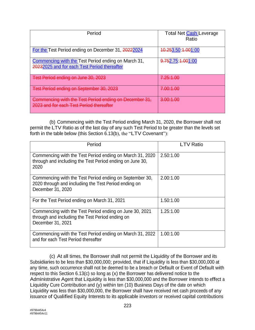 223 #97964454v4 #97964454v11 Period Total Net Cash Leverage Ratio For the Test Period ending on December 31, 20222024 10.253.50:1.001:00 Commencing with the Test Period ending on March 31, 20232025 and for each Test Period thereafter 9.752.75:1.001:00 Test Period ending on June 30, 2023 7.25:1.00 Test Period ending on September 30, 2023 7.00:1.00 Commencing with the Test Period ending on December 31, 2023 and for each Test Period thereafter 3.00:1.00 (b) Commencing with the Test Period ending March 31, 2020, the Borrower shall not permit the LTV Ratio as of the last day of any such Test Period to be greater than the levels set forth in the table below (this Section 6.13(b), the “LTV Covenant”): Period LTV Ratio Commencing with the Test Period ending on March 31, 2020 through and including the Test Period ending on June 30, 2020 2.50:1.00 Commencing with the Test Period ending on September 30, 2020 through and including the Test Period ending on December 31, 2020 2.00:1.00 For the Test Period ending on March 31, 2021 1.50:1.00 Commencing with the Test Period ending on June 30, 2021 through and including the Test Period ending on December 31, 2021 1.25:1.00 Commencing with the Test Period ending on March 31, 2022 and for each Test Period thereafter 1.00:1.00 (c) At all times, the Borrower shall not permit the Liquidity of the Borrower and its Subsidiaries to be less than $30,000,000; provided, that if Liquidity is less than $30,000,000 at any time, such occurrence shall not be deemed to be a breach or Default or Event of Default with respect to this Section 6.13(c) so long as (x) the Borrower has delivered notice to the Administrative Agent that Liquidity is less than $30,000,000 and the Borrower intends to effect a Liquidity Cure Contribution and (y) within ten (10) Business Days of the date on which Liquidity was less than $30,000,000, the Borrower shall have received net cash proceeds of any issuance of Qualified Equity Interests to its applicable investors or received capital contributions