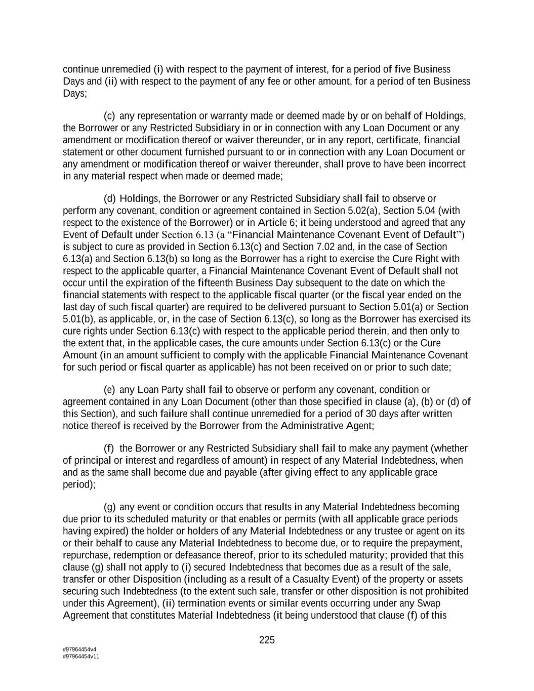 225 #97964454v4 #97964454v11 continue unremedied (i) with respect to the payment of interest, for a period of five Business Days and (ii) with respect to the payment of any fee or other amount, for a period of ten Business Days; (c) any representation or warranty made or deemed made by or on behalf of Holdings, the Borrower or any Restricted Subsidiary in or in connection with any Loan Document or any amendment or modification thereof or waiver thereunder, or in any report, certificate, financial statement or other document furnished pursuant to or in connection with any Loan Document or any amendment or modification thereof or waiver thereunder, shall prove to have been incorrect in any material respect when made or deemed made; (d) Holdings, the Borrower or any Restricted Subsidiary shall fail to observe or perform any covenant, condition or agreement contained in Section 5.02(a), Section 5.04 (with respect to the existence of the Borrower) or in Article 6; it being understood and agreed that any Event of Default under Section 6.13 (a “Financial Maintenance Covenant Event of Default”) is subject to cure as provided in Section 6.13(c) and Section 7.02 and, in the case of Section 6.13(a) and Section 6.13(b) so long as the Borrower has a right to exercise the Cure Right with respect to the applicable quarter, a Financial Maintenance Covenant Event of Default shall not occur until the expiration of the fifteenth Business Day subsequent to the date on which the financial statements with respect to the applicable fiscal quarter (or the fiscal year ended on the last day of such fiscal quarter) are required to be delivered pursuant to Section 5.01(a) or Section 5.01(b), as applicable, or, in the case of Section 6.13(c), so long as the Borrower has exercised its cure rights under Section 6.13(c) with respect to the applicable period therein, and then only to the extent that, in the applicable cases, the cure amounts under Section 6.13(c) or the Cure Amount (in an amount sufficient to comply with the applicable Financial Maintenance Covenant for such period or fiscal quarter as applicable) has not been received on or prior to such date; (e) any Loan Party shall fail to observe or perform any covenant, condition or agreement contained in any Loan Document (other than those specified in clause (a), (b) or (d) of this Section), and such failure shall continue unremedied for a period of 30 days after written notice thereof is received by the Borrower from the Administrative Agent; (f) the Borrower or any Restricted Subsidiary shall fail to make any payment (whether of principal or interest and regardless of amount) in respect of any Material Indebtedness, when and as the same shall become due and payable (after giving effect to any applicable grace period); (g) any event or condition occurs that results in any Material Indebtedness becoming due prior to its scheduled maturity or that enables or permits (with all applicable grace periods having expired) the holder or holders of any Material Indebtedness or any trustee or agent on its or their behalf to cause any Material Indebtedness to become due, or to require the prepayment, repurchase, redemption or defeasance thereof, prior to its scheduled maturity; provided that this clause (g) shall not apply to (i) secured Indebtedness that becomes due as a result of the sale, transfer or other Disposition (including as a result of a Casualty Event) of the property or assets securing such Indebtedness (to the extent such sale, transfer or other disposition is not prohibited under this Agreement), (ii) termination events or similar events occurring under any Swap Agreement that constitutes Material Indebtedness (it being understood that clause (f) of this