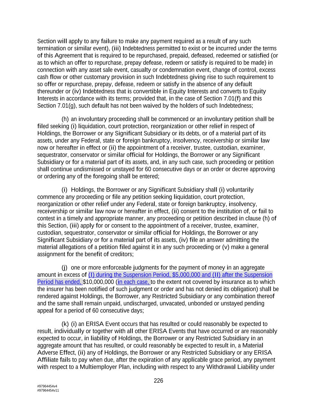 226 #97964454v4 #97964454v11 Section will apply to any failure to make any payment required as a result of any such termination or similar event), (iii) Indebtedness permitted to exist or be incurred under the terms of this Agreement that is required to be repurchased, prepaid, defeased, redeemed or satisfied (or as to which an offer to repurchase, prepay defease, redeem or satisfy is required to be made) in connection with any asset sale event, casualty or condemnation event, change of control, excess cash flow or other customary provision in such Indebtedness giving rise to such requirement to so offer or repurchase, prepay, defease, redeem or satisfy in the absence of any default thereunder or (iv) Indebtedness that is convertible in Equity Interests and converts to Equity Interests in accordance with its terms; provided that, in the case of Section 7.01(f) and this Section 7.01(g), such default has not been waived by the holders of such Indebtedness; (h) an involuntary proceeding shall be commenced or an involuntary petition shall be filed seeking (i) liquidation, court protection, reorganization or other relief in respect of Holdings, the Borrower or any Significant Subsidiary or its debts, or of a material part of its assets, under any Federal, state or foreign bankruptcy, insolvency, receivership or similar law now or hereafter in effect or (ii) the appointment of a receiver, trustee, custodian, examiner, sequestrator, conservator or similar official for Holdings, the Borrower or any Significant Subsidiary or for a material part of its assets, and, in any such case, such proceeding or petition shall continue undismissed or unstayed for 60 consecutive days or an order or decree approving or ordering any of the foregoing shall be entered; (i) Holdings, the Borrower or any Significant Subsidiary shall (i) voluntarily commence any proceeding or file any petition seeking liquidation, court protection, reorganization or other relief under any Federal, state or foreign bankruptcy, insolvency, receivership or similar law now or hereafter in effect, (ii) consent to the institution of, or fail to contest in a timely and appropriate manner, any proceeding or petition described in clause (h) of this Section, (iii) apply for or consent to the appointment of a receiver, trustee, examiner, custodian, sequestrator, conservator or similar official for Holdings, the Borrower or any Significant Subsidiary or for a material part of its assets, (iv) file an answer admitting the material allegations of a petition filed against it in any such proceeding or (v) make a general assignment for the benefit of creditors; (j) one or more enforceable judgments for the payment of money in an aggregate amount in excess of (I) during the Suspension Period, $5,000,000 and (II) after the Suspension Period has ended, $10,000,000 (in each case, to the extent not covered by insurance as to which the insurer has been notified of such judgment or order and has not denied its obligation) shall be rendered against Holdings, the Borrower, any Restricted Subsidiary or any combination thereof and the same shall remain unpaid, undischarged, unvacated, unbonded or unstayed pending appeal for a period of 60 consecutive days; (k) (i) an ERISA Event occurs that has resulted or could reasonably be expected to result, individually or together with all other ERISA Events that have occurred or are reasonably expected to occur, in liability of Holdings, the Borrower or any Restricted Subsidiary in an aggregate amount that has resulted, or could reasonably be expected to result in, a Material Adverse Effect, (ii) any of Holdings, the Borrower or any Restricted Subsidiary or any ERISA Affiliate fails to pay when due, after the expiration of any applicable grace period, any payment with respect to a Multiemployer Plan, including with respect to any Withdrawal Liability under