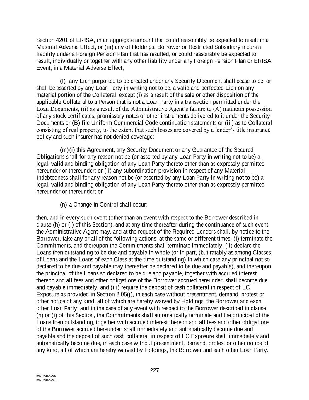 227 #97964454v4 #97964454v11 Section 4201 of ERISA, in an aggregate amount that could reasonably be expected to result in a Material Adverse Effect, or (iii) any of Holdings, Borrower or Restricted Subsidiary incurs a liability under a Foreign Pension Plan that has resulted, or could reasonably be expected to result, individually or together with any other liability under any Foreign Pension Plan or ERISA Event, in a Material Adverse Effect; (l) any Lien purported to be created under any Security Document shall cease to be, or shall be asserted by any Loan Party in writing not to be, a valid and perfected Lien on any material portion of the Collateral, except (i) as a result of the sale or other disposition of the applicable Collateral to a Person that is not a Loan Party in a transaction permitted under the Loan Documents, (ii) as a result of the Administrative Agent’s failure to (A) maintain possession of any stock certificates, promissory notes or other instruments delivered to it under the Security Documents or (B) file Uniform Commercial Code continuation statements or (iii) as to Collateral consisting of real property, to the extent that such losses are covered by a lender’s title insurance policy and such insurer has not denied coverage; (m) (i) this Agreement, any Security Document or any Guarantee of the Secured Obligations shall for any reason not be (or asserted by any Loan Party in writing not to be) a legal, valid and binding obligation of any Loan Party thereto other than as expressly permitted hereunder or thereunder; or (ii) any subordination provision in respect of any Material Indebtedness shall for any reason not be (or asserted by any Loan Party in writing not to be) a legal, valid and binding obligation of any Loan Party thereto other than as expressly permitted hereunder or thereunder; or (n) a Change in Control shall occur; then, and in every such event (other than an event with respect to the Borrower described in clause (h) or (i) of this Section), and at any time thereafter during the continuance of such event, the Administrative Agent may, and at the request of the Required Lenders shall, by notice to the Borrower, take any or all of the following actions, at the same or different times: (i) terminate the Commitments, and thereupon the Commitments shall terminate immediately, (ii) declare the Loans then outstanding to be due and payable in whole (or in part, (but ratably as among Classes of Loans and the Loans of each Class at the time outstanding) in which case any principal not so declared to be due and payable may thereafter be declared to be due and payable), and thereupon the principal of the Loans so declared to be due and payable, together with accrued interest thereon and all fees and other obligations of the Borrower accrued hereunder, shall become due and payable immediately, and (iii) require the deposit of cash collateral in respect of LC Exposure as provided in Section 2.05(j), in each case without presentment, demand, protest or other notice of any kind, all of which are hereby waived by Holdings, the Borrower and each other Loan Party; and in the case of any event with respect to the Borrower described in clause (h) or (i) of this Section, the Commitments shall automatically terminate and the principal of the Loans then outstanding, together with accrued interest thereon and all fees and other obligations of the Borrower accrued hereunder, shall immediately and automatically become due and payable and the deposit of such cash collateral in respect of LC Exposure shall immediately and automatically become due, in each case without presentment, demand, protest or other notice of any kind, all of which are hereby waived by Holdings, the Borrower and each other Loan Party.