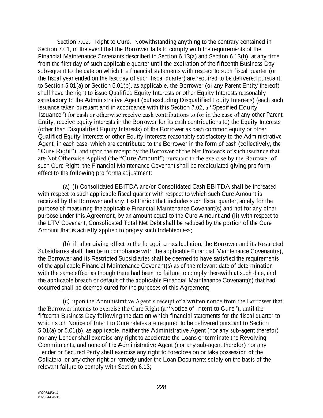 228 #97964454v4 #97964454v11 Section 7.02. Right to Cure. Notwithstanding anything to the contrary contained in Section 7.01, in the event that the Borrower fails to comply with the requirements of the Financial Maintenance Covenants described in Section 6.13(a) and Section 6.13(b), at any time from the first day of such applicable quarter until the expiration of the fifteenth Business Day subsequent to the date on which the financial statements with respect to such fiscal quarter (or the fiscal year ended on the last day of such fiscal quarter) are required to be delivered pursuant to Section 5.01(a) or Section 5.01(b), as applicable, the Borrower (or any Parent Entity thereof) shall have the right to issue Qualified Equity Interests or other Equity Interests reasonably satisfactory to the Administrative Agent (but excluding Disqualified Equity Interests) (each such issuance taken pursuant and in accordance with this Section 7.02, a “Specified Equity Issuance”) for cash or otherwise receive cash contributions to (or in the case of any other Parent Entity, receive equity interests in the Borrower for its cash contributions to) the Equity Interests (other than Disqualified Equity Interests) of the Borrower as cash common equity or other Qualified Equity Interests or other Equity Interests reasonably satisfactory to the Administrative Agent, in each case, which are contributed to the Borrower in the form of cash (collectively, the “Cure Right”), and upon the receipt by the Borrower of the Net Proceeds of such issuance that are Not Otherwise Applied (the “Cure Amount”) pursuant to the exercise by the Borrower of such Cure Right, the Financial Maintenance Covenant shall be recalculated giving pro form effect to the following pro forma adjustment: (a) (i) Consolidated EBITDA and/or Consolidated Cash EBITDA shall be increased with respect to such applicable fiscal quarter with respect to which such Cure Amount is received by the Borrower and any Test Period that includes such fiscal quarter, solely for the purpose of measuring the applicable Financial Maintenance Covenant(s) and not for any other purpose under this Agreement, by an amount equal to the Cure Amount and (ii) with respect to the LTV Covenant, Consolidated Total Net Debt shall be reduced by the portion of the Cure Amount that is actually applied to prepay such Indebtedness; (b) if, after giving effect to the foregoing recalculation, the Borrower and its Restricted Subsidiaries shall then be in compliance with the applicable Financial Maintenance Covenant(s), the Borrower and its Restricted Subsidiaries shall be deemed to have satisfied the requirements of the applicable Financial Maintenance Covenant(s) as of the relevant date of determination with the same effect as though there had been no failure to comply therewith at such date, and the applicable breach or default of the applicable Financial Maintenance Covenant(s) that had occurred shall be deemed cured for the purposes of this Agreement; (c) upon the Administrative Agent’s receipt of a written notice from the Borrower that the Borrower intends to exercise the Cure Right (a “Notice of Intent to Cure”), until the fifteenth Business Day following the date on which financial statements for the fiscal quarter to which such Notice of Intent to Cure relates are required to be delivered pursuant to Section 5.01(a) or 5.01(b), as applicable, neither the Administrative Agent (nor any sub-agent therefor) nor any Lender shall exercise any right to accelerate the Loans or terminate the Revolving Commitments, and none of the Administrative Agent (nor any sub-agent therefor) nor any Lender or Secured Party shall exercise any right to foreclose on or take possession of the Collateral or any other right or remedy under the Loan Documents solely on the basis of the relevant failure to comply with Section 6.13;