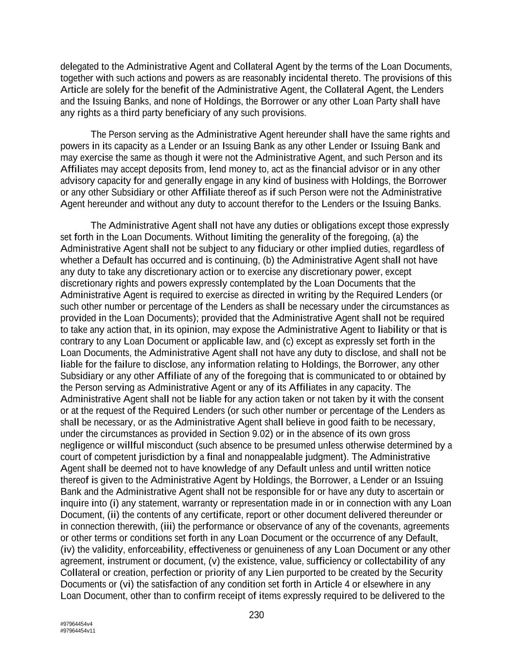 230 #97964454v4 #97964454v11 delegated to the Administrative Agent and Collateral Agent by the terms of the Loan Documents, together with such actions and powers as are reasonably incidental thereto. The provisions of this Article are solely for the benefit of the Administrative Agent, the Collateral Agent, the Lenders and the Issuing Banks, and none of Holdings, the Borrower or any other Loan Party shall have any rights as a third party beneficiary of any such provisions. The Person serving as the Administrative Agent hereunder shall have the same rights and powers in its capacity as a Lender or an Issuing Bank as any other Lender or Issuing Bank and may exercise the same as though it were not the Administrative Agent, and such Person and its Affiliates may accept deposits from, lend money to, act as the financial advisor or in any other advisory capacity for and generally engage in any kind of business with Holdings, the Borrower or any other Subsidiary or other Affiliate thereof as if such Person were not the Administrative Agent hereunder and without any duty to account therefor to the Lenders or the Issuing Banks. The Administrative Agent shall not have any duties or obligations except those expressly set forth in the Loan Documents. Without limiting the generality of the foregoing, (a) the Administrative Agent shall not be subject to any fiduciary or other implied duties, regardless of whether a Default has occurred and is continuing, (b) the Administrative Agent shall not have any duty to take any discretionary action or to exercise any discretionary power, except discretionary rights and powers expressly contemplated by the Loan Documents that the Administrative Agent is required to exercise as directed in writing by the Required Lenders (or such other number or percentage of the Lenders as shall be necessary under the circumstances as provided in the Loan Documents); provided that the Administrative Agent shall not be required to take any action that, in its opinion, may expose the Administrative Agent to liability or that is contrary to any Loan Document or applicable law, and (c) except as expressly set forth in the Loan Documents, the Administrative Agent shall not have any duty to disclose, and shall not be liable for the failure to disclose, any information relating to Holdings, the Borrower, any other Subsidiary or any other Affiliate of any of the foregoing that is communicated to or obtained by the Person serving as Administrative Agent or any of its Affiliates in any capacity. The Administrative Agent shall not be liable for any action taken or not taken by it with the consent or at the request of the Required Lenders (or such other number or percentage of the Lenders as shall be necessary, or as the Administrative Agent shall believe in good faith to be necessary, under the circumstances as provided in Section 9.02) or in the absence of its own gross negligence or willful misconduct (such absence to be presumed unless otherwise determined by a court of competent jurisdiction by a final and nonappealable judgment). The Administrative Agent shall be deemed not to have knowledge of any Default unless and until written notice thereof is given to the Administrative Agent by Holdings, the Borrower, a Lender or an Issuing Bank and the Administrative Agent shall not be responsible for or have any duty to ascertain or inquire into (i) any statement, warranty or representation made in or in connection with any Loan Document, (ii) the contents of any certificate, report or other document delivered thereunder or in connection therewith, (iii) the performance or observance of any of the covenants, agreements or other terms or conditions set forth in any Loan Document or the occurrence of any Default, (iv) the validity, enforceability, effectiveness or genuineness of any Loan Document or any other agreement, instrument or document, (v) the existence, value, sufficiency or collectability of any Collateral or creation, perfection or priority of any Lien purported to be created by the Security Documents or (vi) the satisfaction of any condition set forth in Article 4 or elsewhere in any Loan Document, other than to confirm receipt of items expressly required to be delivered to the