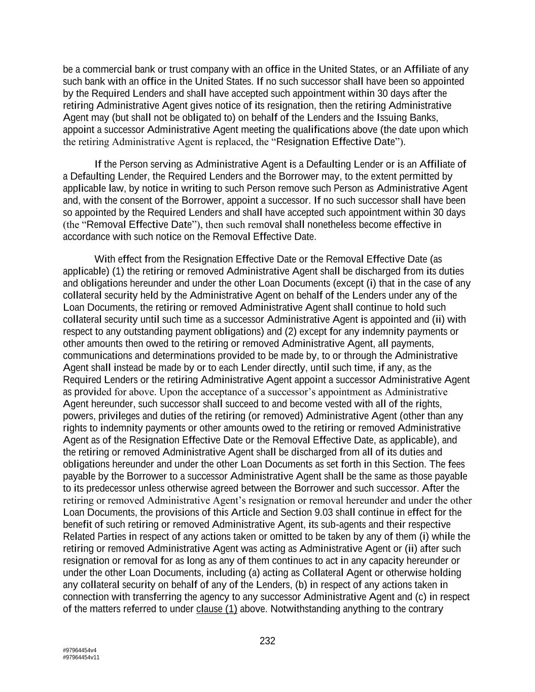 232 #97964454v4 #97964454v11 be a commercial bank or trust company with an office in the United States, or an Affiliate of any such bank with an office in the United States. If no such successor shall have been so appointed by the Required Lenders and shall have accepted such appointment within 30 days after the retiring Administrative Agent gives notice of its resignation, then the retiring Administrative Agent may (but shall not be obligated to) on behalf of the Lenders and the Issuing Banks, appoint a successor Administrative Agent meeting the qualifications above (the date upon which the retiring Administrative Agent is replaced, the “Resignation Effective Date”). If the Person serving as Administrative Agent is a Defaulting Lender or is an Affiliate of a Defaulting Lender, the Required Lenders and the Borrower may, to the extent permitted by applicable law, by notice in writing to such Person remove such Person as Administrative Agent and, with the consent of the Borrower, appoint a successor. If no such successor shall have been so appointed by the Required Lenders and shall have accepted such appointment within 30 days (the “Removal Effective Date”), then such removal shall nonetheless become effective in accordance with such notice on the Removal Effective Date. With effect from the Resignation Effective Date or the Removal Effective Date (as applicable) (1) the retiring or removed Administrative Agent shall be discharged from its duties and obligations hereunder and under the other Loan Documents (except (i) that in the case of any collateral security held by the Administrative Agent on behalf of the Lenders under any of the Loan Documents, the retiring or removed Administrative Agent shall continue to hold such collateral security until such time as a successor Administrative Agent is appointed and (ii) with respect to any outstanding payment obligations) and (2) except for any indemnity payments or other amounts then owed to the retiring or removed Administrative Agent, all payments, communications and determinations provided to be made by, to or through the Administrative Agent shall instead be made by or to each Lender directly, until such time, if any, as the Required Lenders or the retiring Administrative Agent appoint a successor Administrative Agent as provided for above. Upon the acceptance of a successor’s appointment as Administrative Agent hereunder, such successor shall succeed to and become vested with all of the rights, powers, privileges and duties of the retiring (or removed) Administrative Agent (other than any rights to indemnity payments or other amounts owed to the retiring or removed Administrative Agent as of the Resignation Effective Date or the Removal Effective Date, as applicable), and the retiring or removed Administrative Agent shall be discharged from all of its duties and obligations hereunder and under the other Loan Documents as set forth in this Section. The fees payable by the Borrower to a successor Administrative Agent shall be the same as those payable to its predecessor unless otherwise agreed between the Borrower and such successor. After the retiring or removed Administrative Agent’s resignation or removal hereunder and under the other Loan Documents, the provisions of this Article and Section 9.03 shall continue in effect for the benefit of such retiring or removed Administrative Agent, its sub-agents and their respective Related Parties in respect of any actions taken or omitted to be taken by any of them (i) while the retiring or removed Administrative Agent was acting as Administrative Agent or (ii) after such resignation or removal for as long as any of them continues to act in any capacity hereunder or under the other Loan Documents, including (a) acting as Collateral Agent or otherwise holding any collateral security on behalf of any of the Lenders, (b) in respect of any actions taken in connection with transferring the agency to any successor Administrative Agent and (c) in respect of the matters referred to under clause (1) above. Notwithstanding anything to the contrary