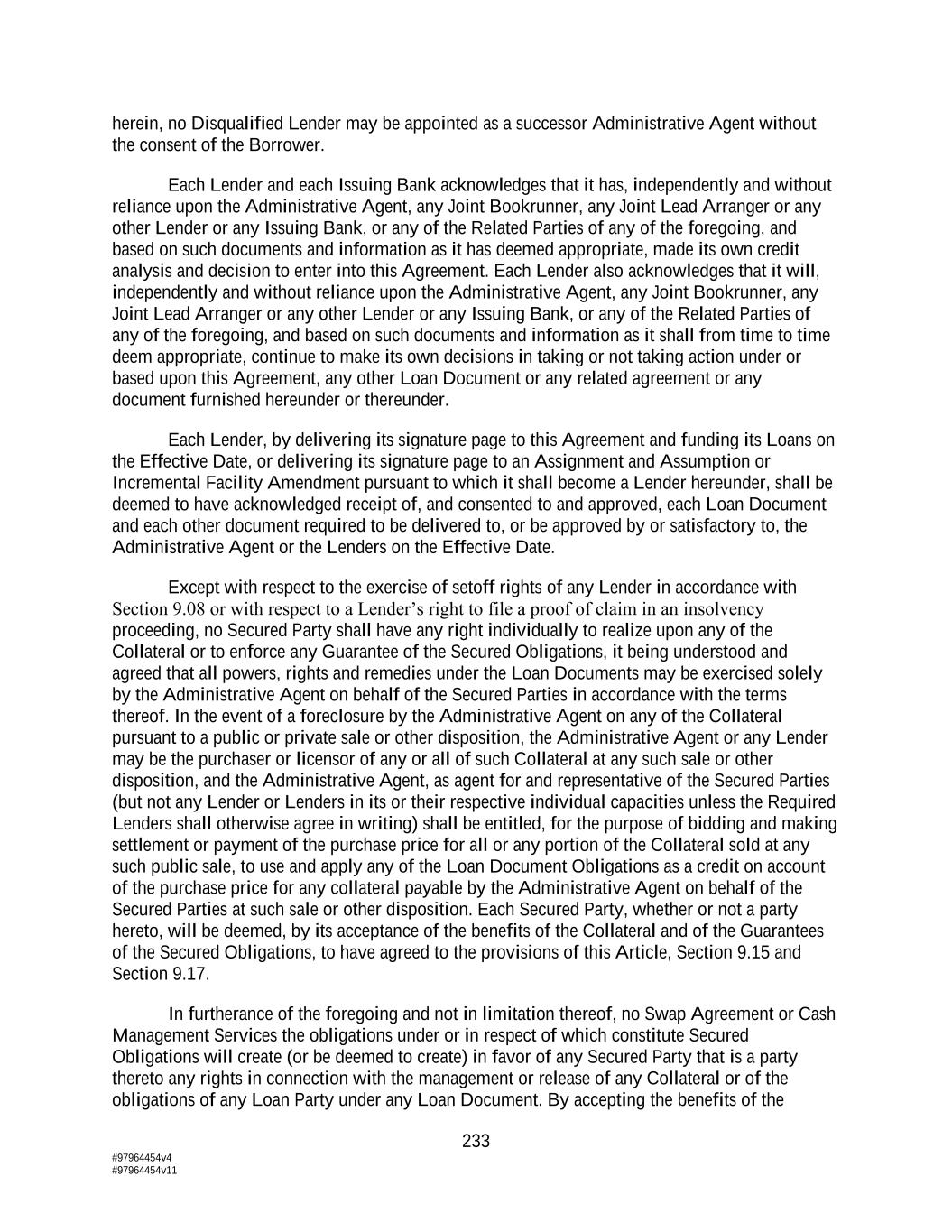 233 #97964454v4 #97964454v11 herein, no Disqualified Lender may be appointed as a successor Administrative Agent without the consent of the Borrower. Each Lender and each Issuing Bank acknowledges that it has, independently and without reliance upon the Administrative Agent, any Joint Bookrunner, any Joint Lead Arranger or any other Lender or any Issuing Bank, or any of the Related Parties of any of the foregoing, and based on such documents and information as it has deemed appropriate, made its own credit analysis and decision to enter into this Agreement. Each Lender also acknowledges that it will, independently and without reliance upon the Administrative Agent, any Joint Bookrunner, any Joint Lead Arranger or any other Lender or any Issuing Bank, or any of the Related Parties of any of the foregoing, and based on such documents and information as it shall from time to time deem appropriate, continue to make its own decisions in taking or not taking action under or based upon this Agreement, any other Loan Document or any related agreement or any document furnished hereunder or thereunder. Each Lender, by delivering its signature page to this Agreement and funding its Loans on the Effective Date, or delivering its signature page to an Assignment and Assumption or Incremental Facility Amendment pursuant to which it shall become a Lender hereunder, shall be deemed to have acknowledged receipt of, and consented to and approved, each Loan Document and each other document required to be delivered to, or be approved by or satisfactory to, the Administrative Agent or the Lenders on the Effective Date. Except with respect to the exercise of setoff rights of any Lender in accordance with Section 9.08 or with respect to a Lender’s right to file a proof of claim in an insolvency proceeding, no Secured Party shall have any right individually to realize upon any of the Collateral or to enforce any Guarantee of the Secured Obligations, it being understood and agreed that all powers, rights and remedies under the Loan Documents may be exercised solely by the Administrative Agent on behalf of the Secured Parties in accordance with the terms thereof. In the event of a foreclosure by the Administrative Agent on any of the Collateral pursuant to a public or private sale or other disposition, the Administrative Agent or any Lender may be the purchaser or licensor of any or all of such Collateral at any such sale or other disposition, and the Administrative Agent, as agent for and representative of the Secured Parties (but not any Lender or Lenders in its or their respective individual capacities unless the Required Lenders shall otherwise agree in writing) shall be entitled, for the purpose of bidding and making settlement or payment of the purchase price for all or any portion of the Collateral sold at any such public sale, to use and apply any of the Loan Document Obligations as a credit on account of the purchase price for any collateral payable by the Administrative Agent on behalf of the Secured Parties at such sale or other disposition. Each Secured Party, whether or not a party hereto, will be deemed, by its acceptance of the benefits of the Collateral and of the Guarantees of the Secured Obligations, to have agreed to the provisions of this Article, Section 9.15 and Section 9.17. In furtherance of the foregoing and not in limitation thereof, no Swap Agreement or Cash Management Services the obligations under or in respect of which constitute Secured Obligations will create (or be deemed to create) in favor of any Secured Party that is a party thereto any rights in connection with the management or release of any Collateral or of the obligations of any Loan Party under any Loan Document. By accepting the benefits of the