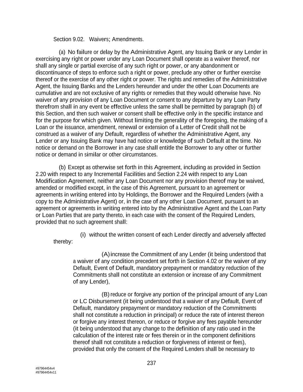 237 #97964454v4 #97964454v11 Section 9.02. Waivers; Amendments. (a) No failure or delay by the Administrative Agent, any Issuing Bank or any Lender in exercising any right or power under any Loan Document shall operate as a waiver thereof, nor shall any single or partial exercise of any such right or power, or any abandonment or discontinuance of steps to enforce such a right or power, preclude any other or further exercise thereof or the exercise of any other right or power. The rights and remedies of the Administrative Agent, the Issuing Banks and the Lenders hereunder and under the other Loan Documents are cumulative and are not exclusive of any rights or remedies that they would otherwise have. No waiver of any provision of any Loan Document or consent to any departure by any Loan Party therefrom shall in any event be effective unless the same shall be permitted by paragraph (b) of this Section, and then such waiver or consent shall be effective only in the specific instance and for the purpose for which given. Without limiting the generality of the foregoing, the making of a Loan or the issuance, amendment, renewal or extension of a Letter of Credit shall not be construed as a waiver of any Default, regardless of whether the Administrative Agent, any Lender or any Issuing Bank may have had notice or knowledge of such Default at the time. No notice or demand on the Borrower in any case shall entitle the Borrower to any other or further notice or demand in similar or other circumstances. (b) Except as otherwise set forth in this Agreement, including as provided in Section 2.20 with respect to any Incremental Facilities and Section 2.24 with respect to any Loan Modification Agreement, neither any Loan Document nor any provision thereof may be waived, amended or modified except, in the case of this Agreement, pursuant to an agreement or agreements in writing entered into by Holdings, the Borrower and the Required Lenders (with a copy to the Administrative Agent) or, in the case of any other Loan Document, pursuant to an agreement or agreements in writing entered into by the Administrative Agent and the Loan Party or Loan Parties that are party thereto, in each case with the consent of the Required Lenders, provided that no such agreement shall: (i) without the written consent of each Lender directly and adversely affected thereby: (A) increase the Commitment of any Lender (it being understood that a waiver of any condition precedent set forth in Section 4.02 or the waiver of any Default, Event of Default, mandatory prepayment or mandatory reduction of the Commitments shall not constitute an extension or increase of any Commitment of any Lender), (B) reduce or forgive any portion of the principal amount of any Loan or LC Disbursement (it being understood that a waiver of any Default, Event of Default, mandatory prepayment or mandatory reduction of the Commitments shall not constitute a reduction in principal) or reduce the rate of interest thereon or forgive any interest thereon, or reduce or forgive any fees payable hereunder (it being understood that any change to the definition of any ratio used in the calculation of the interest rate or fees therein or in the component definitions thereof shall not constitute a reduction or forgiveness of interest or fees), provided that only the consent of the Required Lenders shall be necessary to