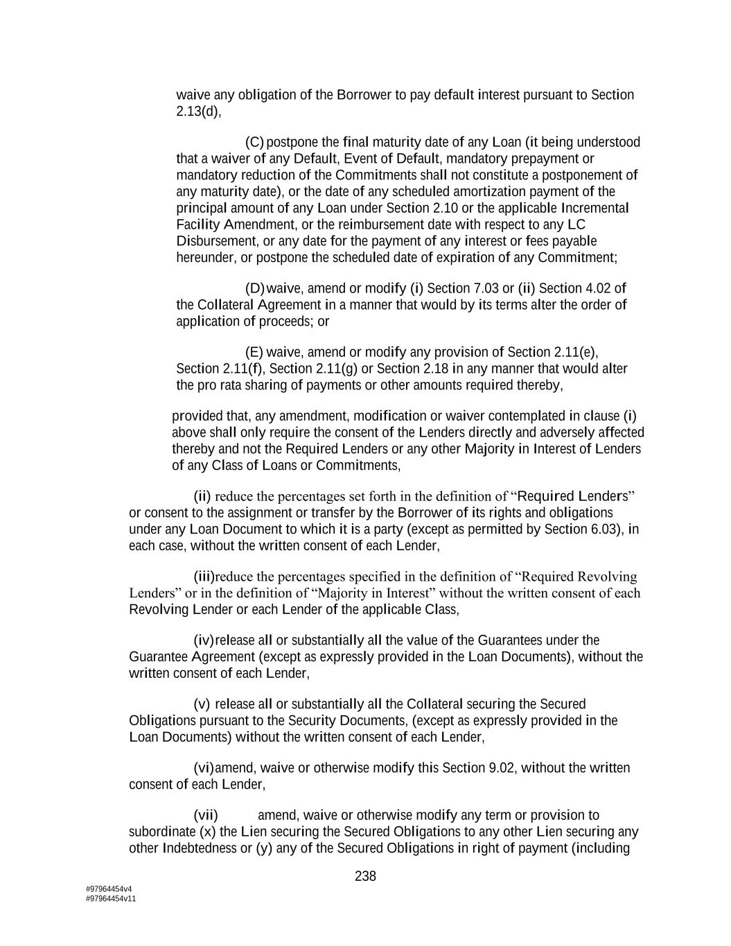 238 #97964454v4 #97964454v11 waive any obligation of the Borrower to pay default interest pursuant to Section 2.13(d), (C) postpone the final maturity date of any Loan (it being understood that a waiver of any Default, Event of Default, mandatory prepayment or mandatory reduction of the Commitments shall not constitute a postponement of any maturity date), or the date of any scheduled amortization payment of the principal amount of any Loan under Section 2.10 or the applicable Incremental Facility Amendment, or the reimbursement date with respect to any LC Disbursement, or any date for the payment of any interest or fees payable hereunder, or postpone the scheduled date of expiration of any Commitment; (D) waive, amend or modify (i) Section 7.03 or (ii) Section 4.02 of the Collateral Agreement in a manner that would by its terms alter the order of application of proceeds; or (E) waive, amend or modify any provision of Section 2.11(e), Section 2.11(f), Section 2.11(g) or Section 2.18 in any manner that would alter the pro rata sharing of payments or other amounts required thereby, provided that, any amendment, modification or waiver contemplated in clause (i) above shall only require the consent of the Lenders directly and adversely affected thereby and not the Required Lenders or any other Majority in Interest of Lenders of any Class of Loans or Commitments, (ii) reduce the percentages set forth in the definition of “Required Lenders” or consent to the assignment or transfer by the Borrower of its rights and obligations under any Loan Document to which it is a party (except as permitted by Section 6.03), in each case, without the written consent of each Lender, (iii)reduce the percentages specified in the definition of “Required Revolving Lenders” or in the definition of “Majority in Interest” without the written consent of each Revolving Lender or each Lender of the applicable Class, (iv) release all or substantially all the value of the Guarantees under the Guarantee Agreement (except as expressly provided in the Loan Documents), without the written consent of each Lender, (v) release all or substantially all the Collateral securing the Secured Obligations pursuant to the Security Documents, (except as expressly provided in the Loan Documents) without the written consent of each Lender, (vi) amend, waive or otherwise modify this Section 9.02, without the written consent of each Lender, (vii) amend, waive or otherwise modify any term or provision to subordinate (x) the Lien securing the Secured Obligations to any other Lien securing any other Indebtedness or (y) any of the Secured Obligations in right of payment (including