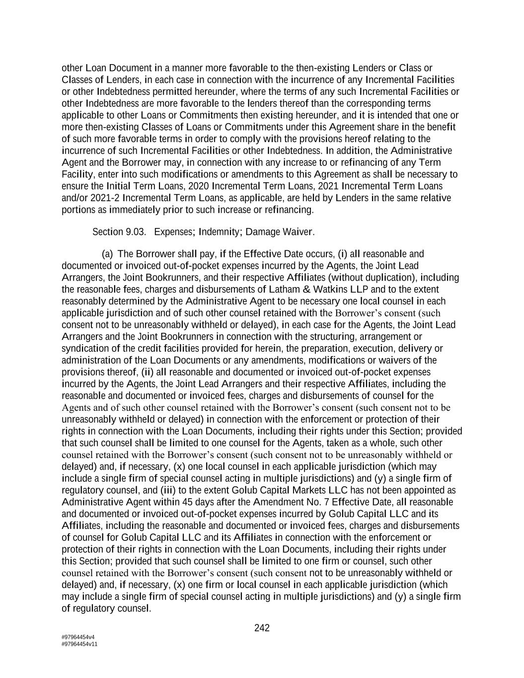 242 #97964454v4 #97964454v11 other Loan Document in a manner more favorable to the then-existing Lenders or Class or Classes of Lenders, in each case in connection with the incurrence of any Incremental Facilities or other Indebtedness permitted hereunder, where the terms of any such Incremental Facilities or other Indebtedness are more favorable to the lenders thereof than the corresponding terms applicable to other Loans or Commitments then existing hereunder, and it is intended that one or more then-existing Classes of Loans or Commitments under this Agreement share in the benefit of such more favorable terms in order to comply with the provisions hereof relating to the incurrence of such Incremental Facilities or other Indebtedness. In addition, the Administrative Agent and the Borrower may, in connection with any increase to or refinancing of any Term Facility, enter into such modifications or amendments to this Agreement as shall be necessary to ensure the Initial Term Loans, 2020 Incremental Term Loans, 2021 Incremental Term Loans and/or 2021-2 Incremental Term Loans, as applicable, are held by Lenders in the same relative portions as immediately prior to such increase or refinancing. Section 9.03. Expenses; Indemnity; Damage Waiver. (a) The Borrower shall pay, if the Effective Date occurs, (i) all reasonable and documented or invoiced out-of-pocket expenses incurred by the Agents, the Joint Lead Arrangers, the Joint Bookrunners, and their respective Affiliates (without duplication), including the reasonable fees, charges and disbursements of Latham & Watkins LLP and to the extent reasonably determined by the Administrative Agent to be necessary one local counsel in each applicable jurisdiction and of such other counsel retained with the Borrower’s consent (such consent not to be unreasonably withheld or delayed), in each case for the Agents, the Joint Lead Arrangers and the Joint Bookrunners in connection with the structuring, arrangement or syndication of the credit facilities provided for herein, the preparation, execution, delivery or administration of the Loan Documents or any amendments, modifications or waivers of the provisions thereof, (ii) all reasonable and documented or invoiced out-of-pocket expenses incurred by the Agents, the Joint Lead Arrangers and their respective Affiliates, including the reasonable and documented or invoiced fees, charges and disbursements of counsel for the Agents and of such other counsel retained with the Borrower’s consent (such consent not to be unreasonably withheld or delayed) in connection with the enforcement or protection of their rights in connection with the Loan Documents, including their rights under this Section; provided that such counsel shall be limited to one counsel for the Agents, taken as a whole, such other counsel retained with the Borrower’s consent (such consent not to be unreasonably withheld or delayed) and, if necessary, (x) one local counsel in each applicable jurisdiction (which may include a single firm of special counsel acting in multiple jurisdictions) and (y) a single firm of regulatory counsel, and (iii) to the extent Golub Capital Markets LLC has not been appointed as Administrative Agent within 45 days after the Amendment No. 7 Effective Date, all reasonable and documented or invoiced out-of-pocket expenses incurred by Golub Capital LLC and its Affiliates, including the reasonable and documented or invoiced fees, charges and disbursements of counsel for Golub Capital LLC and its Affiliates in connection with the enforcement or protection of their rights in connection with the Loan Documents, including their rights under this Section; provided that such counsel shall be limited to one firm or counsel, such other counsel retained with the Borrower’s consent (such consent not to be unreasonably withheld or delayed) and, if necessary, (x) one firm or local counsel in each applicable jurisdiction (which may include a single firm of special counsel acting in multiple jurisdictions) and (y) a single firm of regulatory counsel.