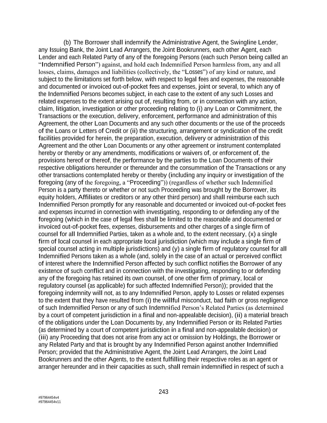243 #97964454v4 #97964454v11 (b) The Borrower shall indemnify the Administrative Agent, the Swingline Lender, any Issuing Bank, the Joint Lead Arrangers, the Joint Bookrunners, each other Agent, each Lender and each Related Party of any of the foregoing Persons (each such Person being called an “Indemnified Person”) against, and hold each Indemnified Person harmless from, any and all losses, claims, damages and liabilities (collectively, the “Losses”) of any kind or nature, and subject to the limitations set forth below, with respect to legal fees and expenses, the reasonable and documented or invoiced out-of-pocket fees and expenses, joint or several, to which any of the Indemnified Persons becomes subject, in each case to the extent of any such Losses and related expenses to the extent arising out of, resulting from, or in connection with any action, claim, litigation, investigation or other proceeding relating to (i) any Loan or Commitment, the Transactions or the execution, delivery, enforcement, performance and administration of this Agreement, the other Loan Documents and any such other documents or the use of the proceeds of the Loans or Letters of Credit or (ii) the structuring, arrangement or syndication of the credit facilities provided for herein, the preparation, execution, delivery or administration of this Agreement and the other Loan Documents or any other agreement or instrument contemplated hereby or thereby or any amendments, modifications or waivers of, or enforcement of, the provisions hereof or thereof, the performance by the parties to the Loan Documents of their respective obligations hereunder or thereunder and the consummation of the Transactions or any other transactions contemplated hereby or thereby (including any inquiry or investigation of the foregoing (any of the foregoing, a “Proceeding”)) (regardless of whether such Indemnified Person is a party thereto or whether or not such Proceeding was brought by the Borrower, its equity holders, Affiliates or creditors or any other third person) and shall reimburse each such Indemnified Person promptly for any reasonable and documented or invoiced out-of-pocket fees and expenses incurred in connection with investigating, responding to or defending any of the foregoing (which in the case of legal fees shall be limited to the reasonable and documented or invoiced out-of-pocket fees, expenses, disbursements and other charges of a single firm of counsel for all Indemnified Parties, taken as a whole and, to the extent necessary, (x) a single firm of local counsel in each appropriate local jurisdiction (which may include a single firm of special counsel acting in multiple jurisdictions) and (y) a single firm of regulatory counsel for all Indemnified Persons taken as a whole (and, solely in the case of an actual or perceived conflict of interest where the Indemnified Person affected by such conflict notifies the Borrower of any existence of such conflict and in connection with the investigating, responding to or defending any of the foregoing has retained its own counsel, of one other firm of primary, local or regulatory counsel (as applicable) for such affected Indemnified Person)); provided that the foregoing indemnity will not, as to any Indemnified Person, apply to Losses or related expenses to the extent that they have resulted from (i) the willful misconduct, bad faith or gross negligence of such Indemnified Person or any of such Indemnified Person’s Related Parties (as determined by a court of competent jurisdiction in a final and non-appealable decision), (ii) a material breach of the obligations under the Loan Documents by, any Indemnified Person or its Related Parties (as determined by a court of competent jurisdiction in a final and non-appealable decision) or (iii) any Proceeding that does not arise from any act or omission by Holdings, the Borrower or any Related Party and that is brought by any Indemnified Person against another Indemnified Person; provided that the Administrative Agent, the Joint Lead Arrangers, the Joint Lead Bookrunners and the other Agents, to the extent fulfilling their respective roles as an agent or arranger hereunder and in their capacities as such, shall remain indemnified in respect of such a