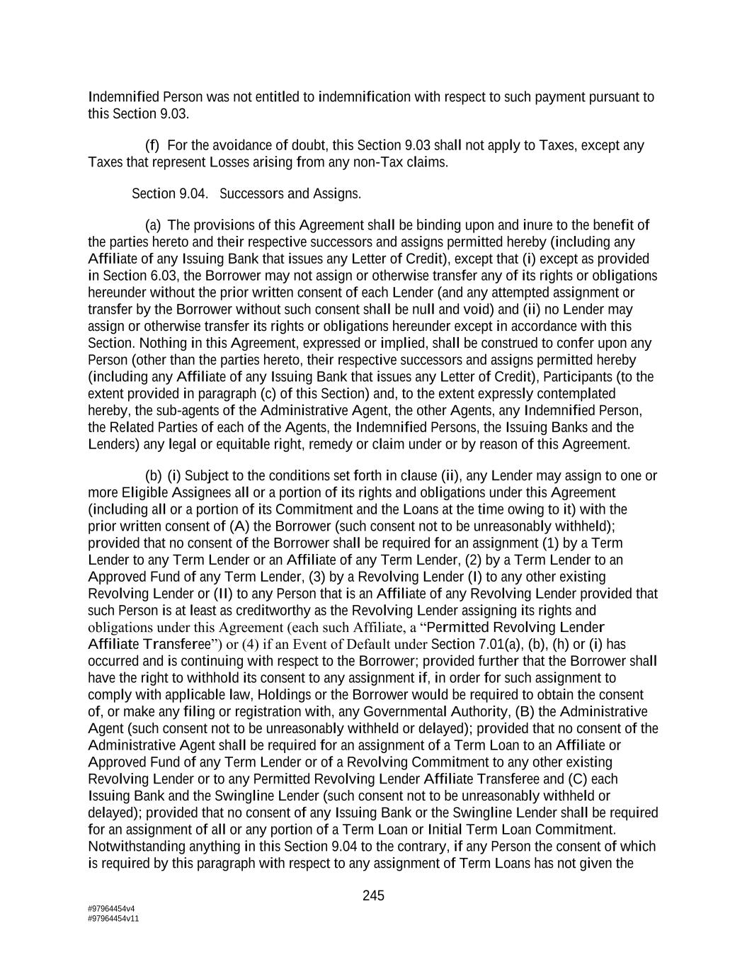 245 #97964454v4 #97964454v11 Indemnified Person was not entitled to indemnification with respect to such payment pursuant to this Section 9.03. (f) For the avoidance of doubt, this Section 9.03 shall not apply to Taxes, except any Taxes that represent Losses arising from any non-Tax claims. Section 9.04. Successors and Assigns. (a) The provisions of this Agreement shall be binding upon and inure to the benefit of the parties hereto and their respective successors and assigns permitted hereby (including any Affiliate of any Issuing Bank that issues any Letter of Credit), except that (i) except as provided in Section 6.03, the Borrower may not assign or otherwise transfer any of its rights or obligations hereunder without the prior written consent of each Lender (and any attempted assignment or transfer by the Borrower without such consent shall be null and void) and (ii) no Lender may assign or otherwise transfer its rights or obligations hereunder except in accordance with this Section. Nothing in this Agreement, expressed or implied, shall be construed to confer upon any Person (other than the parties hereto, their respective successors and assigns permitted hereby (including any Affiliate of any Issuing Bank that issues any Letter of Credit), Participants (to the extent provided in paragraph (c) of this Section) and, to the extent expressly contemplated hereby, the sub-agents of the Administrative Agent, the other Agents, any Indemnified Person, the Related Parties of each of the Agents, the Indemnified Persons, the Issuing Banks and the Lenders) any legal or equitable right, remedy or claim under or by reason of this Agreement. (b) (i) Subject to the conditions set forth in clause (ii), any Lender may assign to one or more Eligible Assignees all or a portion of its rights and obligations under this Agreement (including all or a portion of its Commitment and the Loans at the time owing to it) with the prior written consent of (A) the Borrower (such consent not to be unreasonably withheld); provided that no consent of the Borrower shall be required for an assignment (1) by a Term Lender to any Term Lender or an Affiliate of any Term Lender, (2) by a Term Lender to an Approved Fund of any Term Lender, (3) by a Revolving Lender (I) to any other existing Revolving Lender or (II) to any Person that is an Affiliate of any Revolving Lender provided that such Person is at least as creditworthy as the Revolving Lender assigning its rights and obligations under this Agreement (each such Affiliate, a “Permitted Revolving Lender Affiliate Transferee”) or (4) if an Event of Default under Section 7.01(a), (b), (h) or (i) has occurred and is continuing with respect to the Borrower; provided further that the Borrower shall have the right to withhold its consent to any assignment if, in order for such assignment to comply with applicable law, Holdings or the Borrower would be required to obtain the consent of, or make any filing or registration with, any Governmental Authority, (B) the Administrative Agent (such consent not to be unreasonably withheld or delayed); provided that no consent of the Administrative Agent shall be required for an assignment of a Term Loan to an Affiliate or Approved Fund of any Term Lender or of a Revolving Commitment to any other existing Revolving Lender or to any Permitted Revolving Lender Affiliate Transferee and (C) each Issuing Bank and the Swingline Lender (such consent not to be unreasonably withheld or delayed); provided that no consent of any Issuing Bank or the Swingline Lender shall be required for an assignment of all or any portion of a Term Loan or Initial Term Loan Commitment. Notwithstanding anything in this Section 9.04 to the contrary, if any Person the consent of which is required by this paragraph with respect to any assignment of Term Loans has not given the