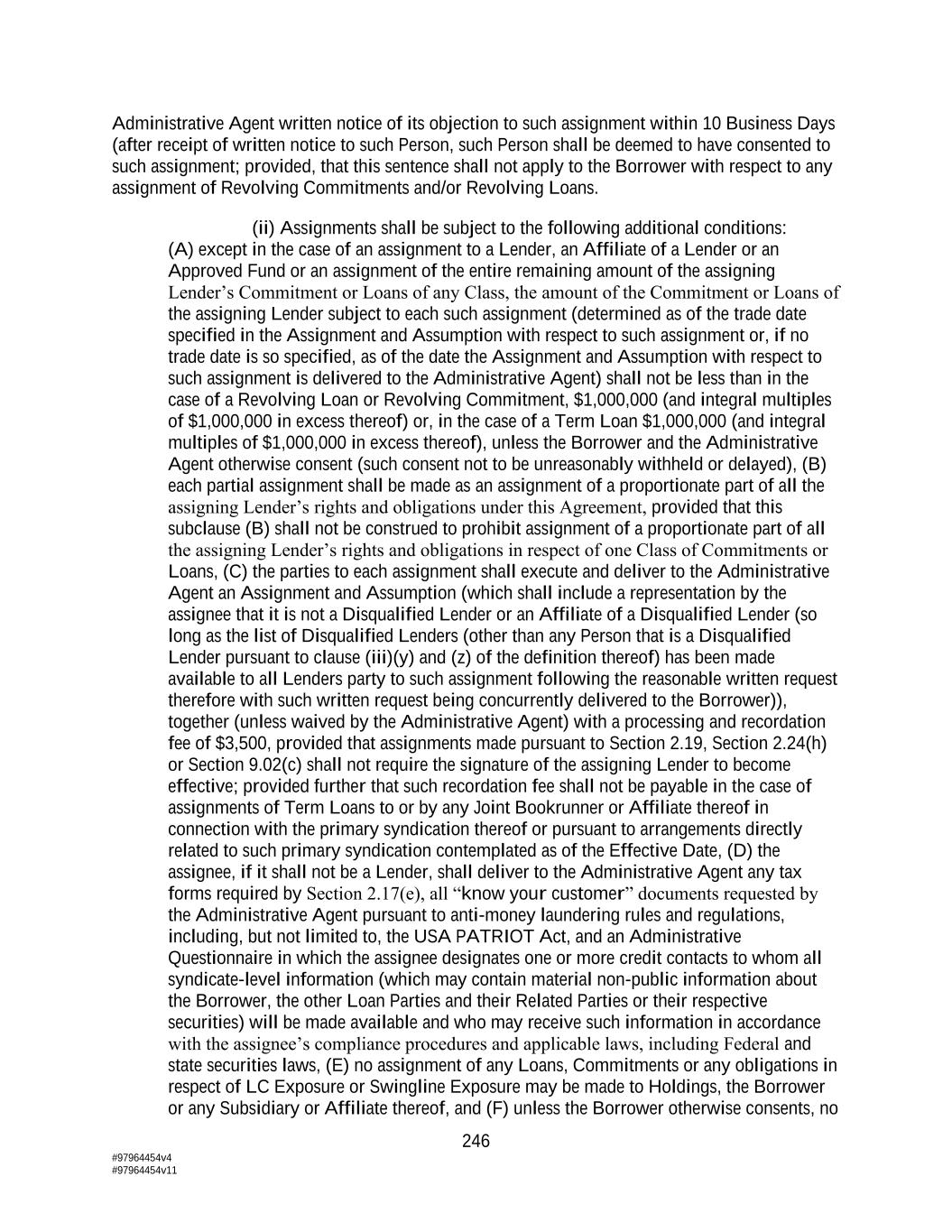 246 #97964454v4 #97964454v11 Administrative Agent written notice of its objection to such assignment within 10 Business Days (after receipt of written notice to such Person, such Person shall be deemed to have consented to such assignment; provided, that this sentence shall not apply to the Borrower with respect to any assignment of Revolving Commitments and/or Revolving Loans. (ii) Assignments shall be subject to the following additional conditions: (A) except in the case of an assignment to a Lender, an Affiliate of a Lender or an Approved Fund or an assignment of the entire remaining amount of the assigning Lender’s Commitment or Loans of any Class, the amount of the Commitment or Loans of the assigning Lender subject to each such assignment (determined as of the trade date specified in the Assignment and Assumption with respect to such assignment or, if no trade date is so specified, as of the date the Assignment and Assumption with respect to such assignment is delivered to the Administrative Agent) shall not be less than in the case of a Revolving Loan or Revolving Commitment, $1,000,000 (and integral multiples of $1,000,000 in excess thereof) or, in the case of a Term Loan $1,000,000 (and integral multiples of $1,000,000 in excess thereof), unless the Borrower and the Administrative Agent otherwise consent (such consent not to be unreasonably withheld or delayed), (B) each partial assignment shall be made as an assignment of a proportionate part of all the assigning Lender’s rights and obligations under this Agreement, provided that this subclause (B) shall not be construed to prohibit assignment of a proportionate part of all the assigning Lender’s rights and obligations in respect of one Class of Commitments or Loans, (C) the parties to each assignment shall execute and deliver to the Administrative Agent an Assignment and Assumption (which shall include a representation by the assignee that it is not a Disqualified Lender or an Affiliate of a Disqualified Lender (so long as the list of Disqualified Lenders (other than any Person that is a Disqualified Lender pursuant to clause (iii)(y) and (z) of the definition thereof) has been made available to all Lenders party to such assignment following the reasonable written request therefore with such written request being concurrently delivered to the Borrower)), together (unless waived by the Administrative Agent) with a processing and recordation fee of $3,500, provided that assignments made pursuant to Section 2.19, Section 2.24(h) or Section 9.02(c) shall not require the signature of the assigning Lender to become effective; provided further that such recordation fee shall not be payable in the case of assignments of Term Loans to or by any Joint Bookrunner or Affiliate thereof in connection with the primary syndication thereof or pursuant to arrangements directly related to such primary syndication contemplated as of the Effective Date, (D) the assignee, if it shall not be a Lender, shall deliver to the Administrative Agent any tax forms required by Section 2.17(e), all “know your customer” documents requested by the Administrative Agent pursuant to anti-money laundering rules and regulations, including, but not limited to, the USA PATRIOT Act, and an Administrative Questionnaire in which the assignee designates one or more credit contacts to whom all syndicate-level information (which may contain material non-public information about the Borrower, the other Loan Parties and their Related Parties or their respective securities) will be made available and who may receive such information in accordance with the assignee’s compliance procedures and applicable laws, including Federal and state securities laws, (E) no assignment of any Loans, Commitments or any obligations in respect of LC Exposure or Swingline Exposure may be made to Holdings, the Borrower or any Subsidiary or Affiliate thereof, and (F) unless the Borrower otherwise consents, no