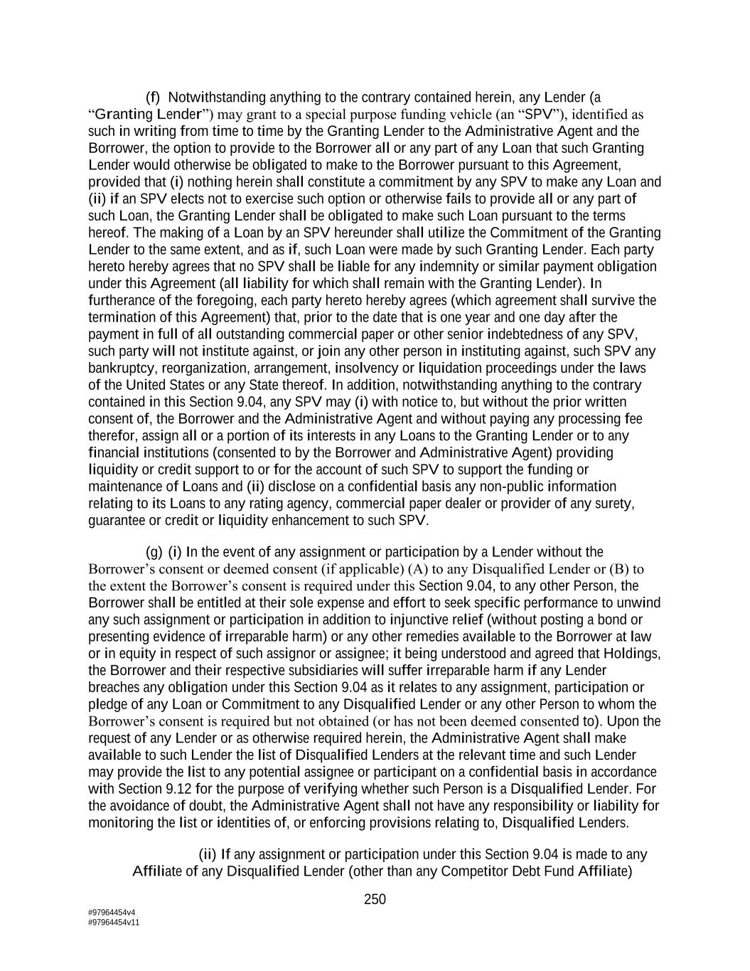 250 #97964454v4 #97964454v11 (f) Notwithstanding anything to the contrary contained herein, any Lender (a “Granting Lender”) may grant to a special purpose funding vehicle (an “SPV”), identified as such in writing from time to time by the Granting Lender to the Administrative Agent and the Borrower, the option to provide to the Borrower all or any part of any Loan that such Granting Lender would otherwise be obligated to make to the Borrower pursuant to this Agreement, provided that (i) nothing herein shall constitute a commitment by any SPV to make any Loan and (ii) if an SPV elects not to exercise such option or otherwise fails to provide all or any part of such Loan, the Granting Lender shall be obligated to make such Loan pursuant to the terms hereof. The making of a Loan by an SPV hereunder shall utilize the Commitment of the Granting Lender to the same extent, and as if, such Loan were made by such Granting Lender. Each party hereto hereby agrees that no SPV shall be liable for any indemnity or similar payment obligation under this Agreement (all liability for which shall remain with the Granting Lender). In furtherance of the foregoing, each party hereto hereby agrees (which agreement shall survive the termination of this Agreement) that, prior to the date that is one year and one day after the payment in full of all outstanding commercial paper or other senior indebtedness of any SPV, such party will not institute against, or join any other person in instituting against, such SPV any bankruptcy, reorganization, arrangement, insolvency or liquidation proceedings under the laws of the United States or any State thereof. In addition, notwithstanding anything to the contrary contained in this Section 9.04, any SPV may (i) with notice to, but without the prior written consent of, the Borrower and the Administrative Agent and without paying any processing fee therefor, assign all or a portion of its interests in any Loans to the Granting Lender or to any financial institutions (consented to by the Borrower and Administrative Agent) providing liquidity or credit support to or for the account of such SPV to support the funding or maintenance of Loans and (ii) disclose on a confidential basis any non-public information relating to its Loans to any rating agency, commercial paper dealer or provider of any surety, guarantee or credit or liquidity enhancement to such SPV. (g) (i) In the event of any assignment or participation by a Lender without the Borrower’s consent or deemed consent (if applicable) (A) to any Disqualified Lender or (B) to the extent the Borrower’s consent is required under this Section 9.04, to any other Person, the Borrower shall be entitled at their sole expense and effort to seek specific performance to unwind any such assignment or participation in addition to injunctive relief (without posting a bond or presenting evidence of irreparable harm) or any other remedies available to the Borrower at law or in equity in respect of such assignor or assignee; it being understood and agreed that Holdings, the Borrower and their respective subsidiaries will suffer irreparable harm if any Lender breaches any obligation under this Section 9.04 as it relates to any assignment, participation or pledge of any Loan or Commitment to any Disqualified Lender or any other Person to whom the Borrower’s consent is required but not obtained (or has not been deemed consented to). Upon the request of any Lender or as otherwise required herein, the Administrative Agent shall make available to such Lender the list of Disqualified Lenders at the relevant time and such Lender may provide the list to any potential assignee or participant on a confidential basis in accordance with Section 9.12 for the purpose of verifying whether such Person is a Disqualified Lender. For the avoidance of doubt, the Administrative Agent shall not have any responsibility or liability for monitoring the list or identities of, or enforcing provisions relating to, Disqualified Lenders. (ii) If any assignment or participation under this Section 9.04 is made to any Affiliate of any Disqualified Lender (other than any Competitor Debt Fund Affiliate)