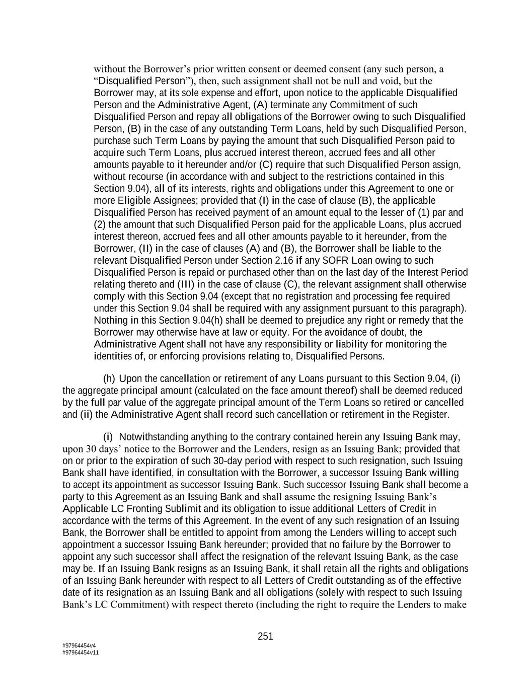 251 #97964454v4 #97964454v11 without the Borrower’s prior written consent or deemed consent (any such person, a “Disqualified Person”), then, such assignment shall not be null and void, but the Borrower may, at its sole expense and effort, upon notice to the applicable Disqualified Person and the Administrative Agent, (A) terminate any Commitment of such Disqualified Person and repay all obligations of the Borrower owing to such Disqualified Person, (B) in the case of any outstanding Term Loans, held by such Disqualified Person, purchase such Term Loans by paying the amount that such Disqualified Person paid to acquire such Term Loans, plus accrued interest thereon, accrued fees and all other amounts payable to it hereunder and/or (C) require that such Disqualified Person assign, without recourse (in accordance with and subject to the restrictions contained in this Section 9.04), all of its interests, rights and obligations under this Agreement to one or more Eligible Assignees; provided that (I) in the case of clause (B), the applicable Disqualified Person has received payment of an amount equal to the lesser of (1) par and (2) the amount that such Disqualified Person paid for the applicable Loans, plus accrued interest thereon, accrued fees and all other amounts payable to it hereunder, from the Borrower, (II) in the case of clauses (A) and (B), the Borrower shall be liable to the relevant Disqualified Person under Section 2.16 if any SOFR Loan owing to such Disqualified Person is repaid or purchased other than on the last day of the Interest Period relating thereto and (III) in the case of clause (C), the relevant assignment shall otherwise comply with this Section 9.04 (except that no registration and processing fee required under this Section 9.04 shall be required with any assignment pursuant to this paragraph). Nothing in this Section 9.04(h) shall be deemed to prejudice any right or remedy that the Borrower may otherwise have at law or equity. For the avoidance of doubt, the Administrative Agent shall not have any responsibility or liability for monitoring the identities of, or enforcing provisions relating to, Disqualified Persons. (h) Upon the cancellation or retirement of any Loans pursuant to this Section 9.04, (i) the aggregate principal amount (calculated on the face amount thereof) shall be deemed reduced by the full par value of the aggregate principal amount of the Term Loans so retired or cancelled and (ii) the Administrative Agent shall record such cancellation or retirement in the Register. (i) Notwithstanding anything to the contrary contained herein any Issuing Bank may, upon 30 days’ notice to the Borrower and the Lenders, resign as an Issuing Bank; provided that on or prior to the expiration of such 30-day period with respect to such resignation, such Issuing Bank shall have identified, in consultation with the Borrower, a successor Issuing Bank willing to accept its appointment as successor Issuing Bank. Such successor Issuing Bank shall become a party to this Agreement as an Issuing Bank and shall assume the resigning Issuing Bank’s Applicable LC Fronting Sublimit and its obligation to issue additional Letters of Credit in accordance with the terms of this Agreement. In the event of any such resignation of an Issuing Bank, the Borrower shall be entitled to appoint from among the Lenders willing to accept such appointment a successor Issuing Bank hereunder; provided that no failure by the Borrower to appoint any such successor shall affect the resignation of the relevant Issuing Bank, as the case may be. If an Issuing Bank resigns as an Issuing Bank, it shall retain all the rights and obligations of an Issuing Bank hereunder with respect to all Letters of Credit outstanding as of the effective date of its resignation as an Issuing Bank and all obligations (solely with respect to such Issuing Bank’s LC Commitment) with respect thereto (including the right to require the Lenders to make