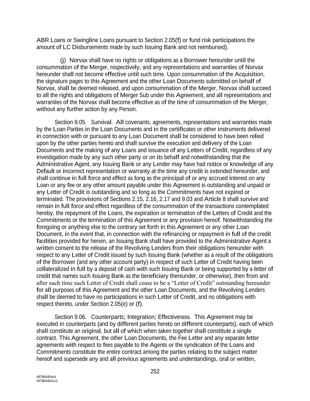 252 #97964454v4 #97964454v11 ABR Loans or Swingline Loans pursuant to Section 2.05(f) or fund risk participations the amount of LC Disbursements made by such Issuing Bank and not reimbursed). (j) Norvax shall have no rights or obligations as a Borrower hereunder until the consummation of the Merger, respectively, and any representations and warranties of Norvax hereunder shall not become effective until such time. Upon consummation of the Acquisition, the signature pages to this Agreement and the other Loan Documents submitted on behalf of Norvax, shall be deemed released, and upon consummation of the Merger, Norvax shall succeed to all the rights and obligations of Merger Sub under this Agreement, and all representations and warranties of the Norvax shall become effective as of the time of consummation of the Merger, without any further action by any Person. Section 9.05. Survival. All covenants, agreements, representations and warranties made by the Loan Parties in the Loan Documents and in the certificates or other instruments delivered in connection with or pursuant to any Loan Document shall be considered to have been relied upon by the other parties hereto and shall survive the execution and delivery of the Loan Documents and the making of any Loans and issuance of any Letters of Credit, regardless of any investigation made by any such other party or on its behalf and notwithstanding that the Administrative Agent, any Issuing Bank or any Lender may have had notice or knowledge of any Default or incorrect representation or warranty at the time any credit is extended hereunder, and shall continue in full force and effect as long as the principal of or any accrued interest on any Loan or any fee or any other amount payable under this Agreement is outstanding and unpaid or any Letter of Credit is outstanding and so long as the Commitments have not expired or terminated. The provisions of Sections 2.15, 2.16, 2.17 and 9.03 and Article 8 shall survive and remain in full force and effect regardless of the consummation of the transactions contemplated hereby, the repayment of the Loans, the expiration or termination of the Letters of Credit and the Commitments or the termination of this Agreement or any provision hereof. Notwithstanding the foregoing or anything else to the contrary set forth in this Agreement or any other Loan Document, in the event that, in connection with the refinancing or repayment in full of the credit facilities provided for herein, an Issuing Bank shall have provided to the Administrative Agent a written consent to the release of the Revolving Lenders from their obligations hereunder with respect to any Letter of Credit issued by such Issuing Bank (whether as a result of the obligations of the Borrower (and any other account party) in respect of such Letter of Credit having been collateralized in full by a deposit of cash with such Issuing Bank or being supported by a letter of credit that names such Issuing Bank as the beneficiary thereunder, or otherwise), then from and after such time such Letter of Credit shall cease to be a “Letter of Credit” outstanding hereunder for all purposes of this Agreement and the other Loan Documents, and the Revolving Lenders shall be deemed to have no participations in such Letter of Credit, and no obligations with respect thereto, under Section 2.05(e) or (f). Section 9.06. Counterparts; Integration; Effectiveness. This Agreement may be executed in counterparts (and by different parties hereto on different counterparts), each of which shall constitute an original, but all of which when taken together shall constitute a single contract. This Agreement, the other Loan Documents, the Fee Letter and any separate letter agreements with respect to fees payable to the Agents or the syndication of the Loans and Commitments constitute the entire contract among the parties relating to the subject matter hereof and supersede any and all previous agreements and understandings, oral or written,