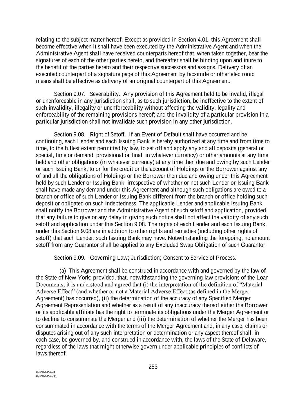 253 #97964454v4 #97964454v11 relating to the subject matter hereof. Except as provided in Section 4.01, this Agreement shall become effective when it shall have been executed by the Administrative Agent and when the Administrative Agent shall have received counterparts hereof that, when taken together, bear the signatures of each of the other parties hereto, and thereafter shall be binding upon and inure to the benefit of the parties hereto and their respective successors and assigns. Delivery of an executed counterpart of a signature page of this Agreement by facsimile or other electronic means shall be effective as delivery of an original counterpart of this Agreement. Section 9.07. Severability. Any provision of this Agreement held to be invalid, illegal or unenforceable in any jurisdiction shall, as to such jurisdiction, be ineffective to the extent of such invalidity, illegality or unenforceability without affecting the validity, legality and enforceability of the remaining provisions hereof; and the invalidity of a particular provision in a particular jurisdiction shall not invalidate such provision in any other jurisdiction. Section 9.08. Right of Setoff. If an Event of Default shall have occurred and be continuing, each Lender and each Issuing Bank is hereby authorized at any time and from time to time, to the fullest extent permitted by law, to set off and apply any and all deposits (general or special, time or demand, provisional or final, in whatever currency) or other amounts at any time held and other obligations (in whatever currency) at any time then due and owing by such Lender or such Issuing Bank, to or for the credit or the account of Holdings or the Borrower against any of and all the obligations of Holdings or the Borrower then due and owing under this Agreement held by such Lender or Issuing Bank, irrespective of whether or not such Lender or Issuing Bank shall have made any demand under this Agreement and although such obligations are owed to a branch or office of such Lender or Issuing Bank different from the branch or office holding such deposit or obligated on such indebtedness. The applicable Lender and applicable Issuing Bank shall notify the Borrower and the Administrative Agent of such setoff and application, provided that any failure to give or any delay in giving such notice shall not affect the validity of any such setoff and application under this Section 9.08. The rights of each Lender and each Issuing Bank, under this Section 9.08 are in addition to other rights and remedies (including other rights of setoff) that such Lender, such Issuing Bank may have. Notwithstanding the foregoing, no amount setoff from any Guarantor shall be applied to any Excluded Swap Obligation of such Guarantor. Section 9.09. Governing Law; Jurisdiction; Consent to Service of Process. (a) This Agreement shall be construed in accordance with and governed by the law of the State of New York; provided, that, notwithstanding the governing law provisions of the Loan Documents, it is understood and agreed that (i) the interpretation of the definition of “Material Adverse Effect” (and whether or not a Material Adverse Effect (as defined in the Merger Agreement) has occurred), (ii) the determination of the accuracy of any Specified Merger Agreement Representation and whether as a result of any inaccuracy thereof either the Borrower or its applicable affiliate has the right to terminate its obligations under the Merger Agreement or to decline to consummate the Merger and (iii) the determination of whether the Merger has been consummated in accordance with the terms of the Merger Agreement and, in any case, claims or disputes arising out of any such interpretation or determination or any aspect thereof shall, in each case, be governed by, and construed in accordance with, the laws of the State of Delaware, regardless of the laws that might otherwise govern under applicable principles of conflicts of laws thereof.