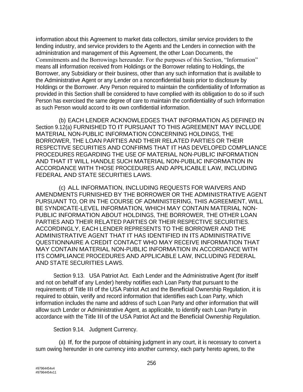 256 #97964454v4 #97964454v11 information about this Agreement to market data collectors, similar service providers to the lending industry, and service providers to the Agents and the Lenders in connection with the administration and management of this Agreement, the other Loan Documents, the Commitments and the Borrowings hereunder. For the purposes of this Section, “Information” means all information received from Holdings or the Borrower relating to Holdings, the Borrower, any Subsidiary or their business, other than any such information that is available to the Administrative Agent or any Lender on a nonconfidential basis prior to disclosure by Holdings or the Borrower. Any Person required to maintain the confidentiality of Information as provided in this Section shall be considered to have complied with its obligation to do so if such Person has exercised the same degree of care to maintain the confidentiality of such Information as such Person would accord to its own confidential information. (b) EACH LENDER ACKNOWLEDGES THAT INFORMATION AS DEFINED IN Section 9.12(a) FURNISHED TO IT PURSUANT TO THIS AGREEMENT MAY INCLUDE MATERIAL NON-PUBLIC INFORMATION CONCERNING HOLDINGS, THE BORROWER, THE LOAN PARTIES AND THEIR RELATED PARTIES OR THEIR RESPECTIVE SECURITIES AND CONFIRMS THAT IT HAS DEVELOPED COMPLIANCE PROCEDURES REGARDING THE USE OF MATERIAL NON-PUBLIC INFORMATION AND THAT IT WILL HANDLE SUCH MATERIAL NON-PUBLIC INFORMATION IN ACCORDANCE WITH THOSE PROCEDURES AND APPLICABLE LAW, INCLUDING FEDERAL AND STATE SECURITIES LAWS. (c) ALL INFORMATION, INCLUDING REQUESTS FOR WAIVERS AND AMENDMENTS FURNISHED BY THE BORROWER OR THE ADMINISTRATIVE AGENT PURSUANT TO, OR IN THE COURSE OF ADMINISTERING, THIS AGREEMENT, WILL BE SYNDICATE-LEVEL INFORMATION, WHICH MAY CONTAIN MATERIAL NON- PUBLIC INFORMATION ABOUT HOLDINGS, THE BORROWER, THE OTHER LOAN PARTIES AND THEIR RELATED PARTIES OR THEIR RESPECTIVE SECURITIES. ACCORDINGLY, EACH LENDER REPRESENTS TO THE BORROWER AND THE ADMINISTRATIVE AGENT THAT IT HAS IDENTIFIED IN ITS ADMINISTRATIVE QUESTIONNAIRE A CREDIT CONTACT WHO MAY RECEIVE INFORMATION THAT MAY CONTAIN MATERIAL NON-PUBLIC INFORMATION IN ACCORDANCE WITH ITS COMPLIANCE PROCEDURES AND APPLICABLE LAW, INCLUDING FEDERAL AND STATE SECURITIES LAWS. Section 9.13. USA Patriot Act. Each Lender and the Administrative Agent (for itself and not on behalf of any Lender) hereby notifies each Loan Party that pursuant to the requirements of Title III of the USA Patriot Act and the Beneficial Ownership Regulation, it is required to obtain, verify and record information that identifies each Loan Party, which information includes the name and address of such Loan Party and other information that will allow such Lender or Administrative Agent, as applicable, to identify each Loan Party in accordance with the Title III of the USA Patriot Act and the Beneficial Ownership Regulation. Section 9.14. Judgment Currency. (a) If, for the purpose of obtaining judgment in any court, it is necessary to convert a sum owing hereunder in one currency into another currency, each party hereto agrees, to the