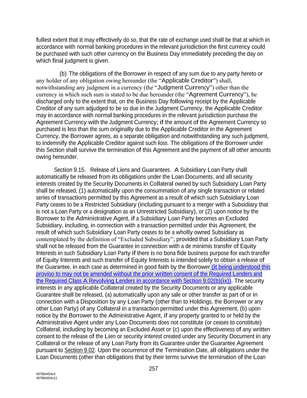 257 #97964454v4 #97964454v11 fullest extent that it may effectively do so, that the rate of exchange used shall be that at which in accordance with normal banking procedures in the relevant jurisdiction the first currency could be purchased with such other currency on the Business Day immediately preceding the day on which final judgment is given. (b) The obligations of the Borrower in respect of any sum due to any party hereto or any holder of any obligation owing hereunder (the “Applicable Creditor”) shall, notwithstanding any judgment in a currency (the “Judgment Currency”) other than the currency in which such sum is stated to be due hereunder (the “Agreement Currency”), be discharged only to the extent that, on the Business Day following receipt by the Applicable Creditor of any sum adjudged to be so due in the Judgment Currency, the Applicable Creditor may in accordance with normal banking procedures in the relevant jurisdiction purchase the Agreement Currency with the Judgment Currency; if the amount of the Agreement Currency so purchased is less than the sum originally due to the Applicable Creditor in the Agreement Currency, the Borrower agrees, as a separate obligation and notwithstanding any such judgment, to indemnify the Applicable Creditor against such loss. The obligations of the Borrower under this Section shall survive the termination of this Agreement and the payment of all other amounts owing hereunder. Section 9.15. Release of Liens and Guarantees. A Subsidiary Loan Party shall automatically be released from its obligations under the Loan Documents, and all security interests created by the Security Documents in Collateral owned by such Subsidiary Loan Party shall be released, (1) automatically upon the consummation of any single transaction or related series of transactions permitted by this Agreement as a result of which such Subsidiary Loan Party ceases to be a Restricted Subsidiary (including pursuant to a merger with a Subsidiary that is not a Loan Party or a designation as an Unrestricted Subsidiary), or (2) upon notice by the Borrower to the Administrative Agent, if a Subsidiary Loan Party becomes an Excluded Subsidiary, including, in connection with a transaction permitted under this Agreement, the result of which such Subsidiary Loan Party ceases to be a wholly owned Subsidiary as contemplated by the definition of “Excluded Subsidiary”; provided that a Subsidiary Loan Party shall not be released from the Guarantee in connection with a de minimis transfer of Equity Interests in such Subsidiary Loan Party if there is no bona fide business purpose for each transfer of Equity Interests and such transfer of Equity Interests is intended solely to obtain a release of the Guarantee, in each case as determined in good faith by the Borrower (it being understood this proviso to may not be amended without the prior written consent of the Required Lenders and the Required Class A Revolving Lenders in accordance with Section 9.02(b)(ix)). The security interests in any applicable Collateral created by the Security Documents or any applicable Guarantee shall be released, (a) automatically upon any sale or other transfer as part of or in connection with a Disposition by any Loan Party (other than to Holdings, the Borrower or any other Loan Party) of any Collateral in a transaction permitted under this Agreement, (b) upon notice by the Borrower to the Administrative Agent, if any property granted to or held by the Administrative Agent under any Loan Documents does not constitute (or ceases to constitute) Collateral, including by becoming an Excluded Asset or (c) upon the effectiveness of any written consent to the release of the Lien or security interest created under any Security Document in any Collateral or the release of any Loan Party from its Guarantee under the Guarantee Agreement pursuant to Section 9.02. Upon the occurrence of the Termination Date, all obligations under the Loan Documents (other than obligations that by their terms survive the termination of the Loan