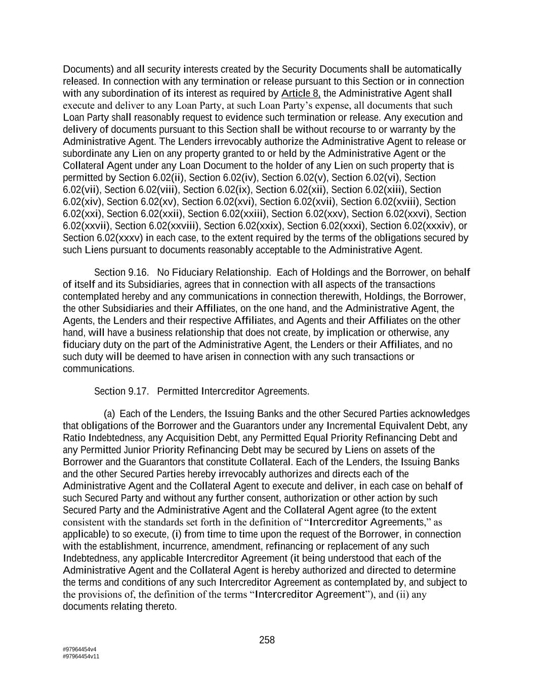 258 #97964454v4 #97964454v11 Documents) and all security interests created by the Security Documents shall be automatically released. In connection with any termination or release pursuant to this Section or in connection with any subordination of its interest as required by Article 8, the Administrative Agent shall execute and deliver to any Loan Party, at such Loan Party’s expense, all documents that such Loan Party shall reasonably request to evidence such termination or release. Any execution and delivery of documents pursuant to this Section shall be without recourse to or warranty by the Administrative Agent. The Lenders irrevocably authorize the Administrative Agent to release or subordinate any Lien on any property granted to or held by the Administrative Agent or the Collateral Agent under any Loan Document to the holder of any Lien on such property that is permitted by Section 6.02(ii), Section 6.02(iv), Section 6.02(v), Section 6.02(vi), Section 6.02(vii), Section 6.02(viii), Section 6.02(ix), Section 6.02(xii), Section 6.02(xiii), Section 6.02(xiv), Section 6.02(xv), Section 6.02(xvi), Section 6.02(xvii), Section 6.02(xviii), Section 6.02(xxi), Section 6.02(xxii), Section 6.02(xxiii), Section 6.02(xxv), Section 6.02(xxvi), Section 6.02(xxvii), Section 6.02(xxviii), Section 6.02(xxix), Section 6.02(xxxi), Section 6.02(xxxiv), or Section 6.02(xxxv) in each case, to the extent required by the terms of the obligations secured by such Liens pursuant to documents reasonably acceptable to the Administrative Agent. Section 9.16. No Fiduciary Relationship. Each of Holdings and the Borrower, on behalf of itself and its Subsidiaries, agrees that in connection with all aspects of the transactions contemplated hereby and any communications in connection therewith, Holdings, the Borrower, the other Subsidiaries and their Affiliates, on the one hand, and the Administrative Agent, the Agents, the Lenders and their respective Affiliates, and Agents and their Affiliates on the other hand, will have a business relationship that does not create, by implication or otherwise, any fiduciary duty on the part of the Administrative Agent, the Lenders or their Affiliates, and no such duty will be deemed to have arisen in connection with any such transactions or communications. Section 9.17. Permitted Intercreditor Agreements. (a) Each of the Lenders, the Issuing Banks and the other Secured Parties acknowledges that obligations of the Borrower and the Guarantors under any Incremental Equivalent Debt, any Ratio Indebtedness, any Acquisition Debt, any Permitted Equal Priority Refinancing Debt and any Permitted Junior Priority Refinancing Debt may be secured by Liens on assets of the Borrower and the Guarantors that constitute Collateral. Each of the Lenders, the Issuing Banks and the other Secured Parties hereby irrevocably authorizes and directs each of the Administrative Agent and the Collateral Agent to execute and deliver, in each case on behalf of such Secured Party and without any further consent, authorization or other action by such Secured Party and the Administrative Agent and the Collateral Agent agree (to the extent consistent with the standards set forth in the definition of “Intercreditor Agreements,” as applicable) to so execute, (i) from time to time upon the request of the Borrower, in connection with the establishment, incurrence, amendment, refinancing or replacement of any such Indebtedness, any applicable Intercreditor Agreement (it being understood that each of the Administrative Agent and the Collateral Agent is hereby authorized and directed to determine the terms and conditions of any such Intercreditor Agreement as contemplated by, and subject to the provisions of, the definition of the terms “Intercreditor Agreement”), and (ii) any documents relating thereto.